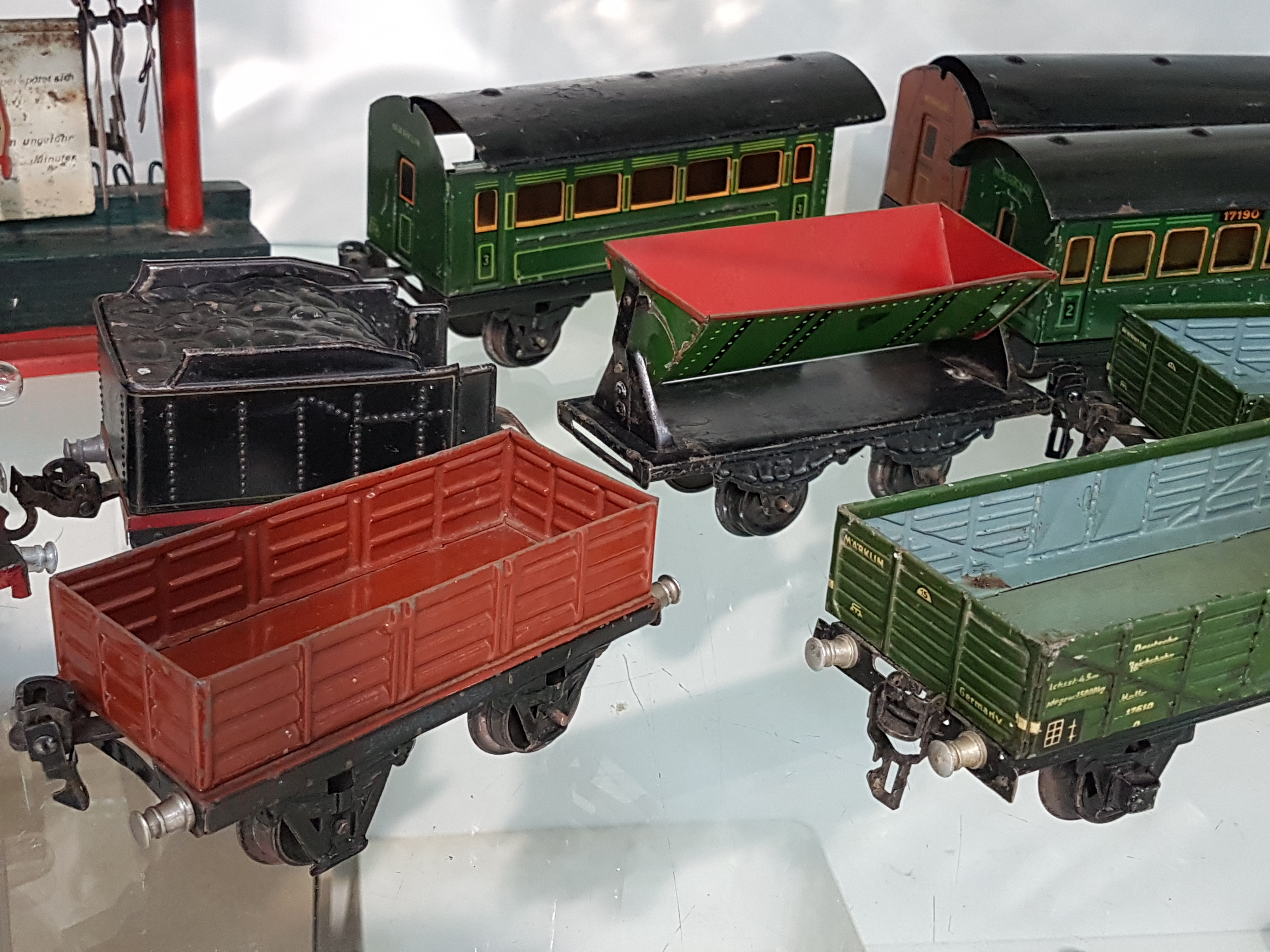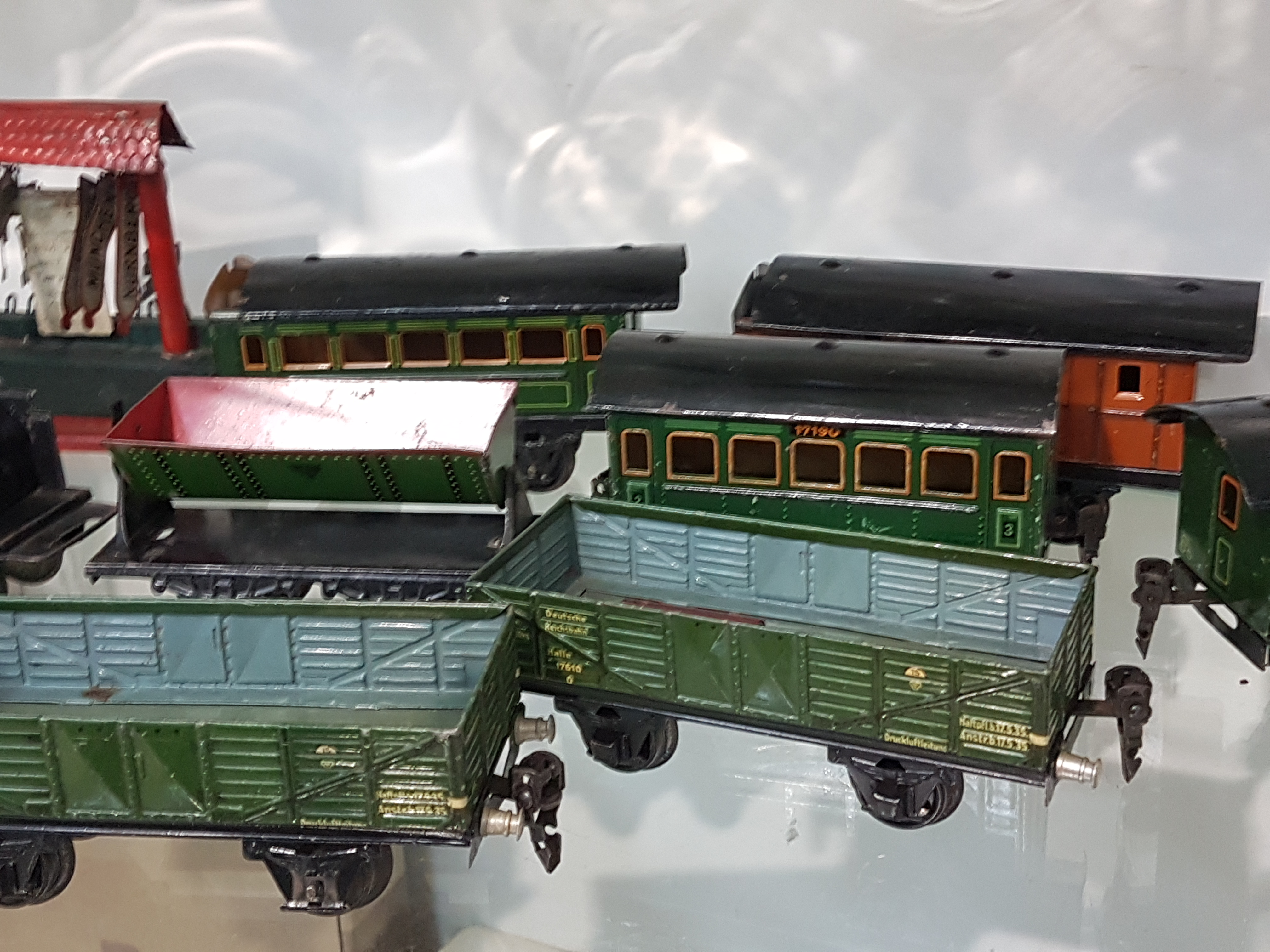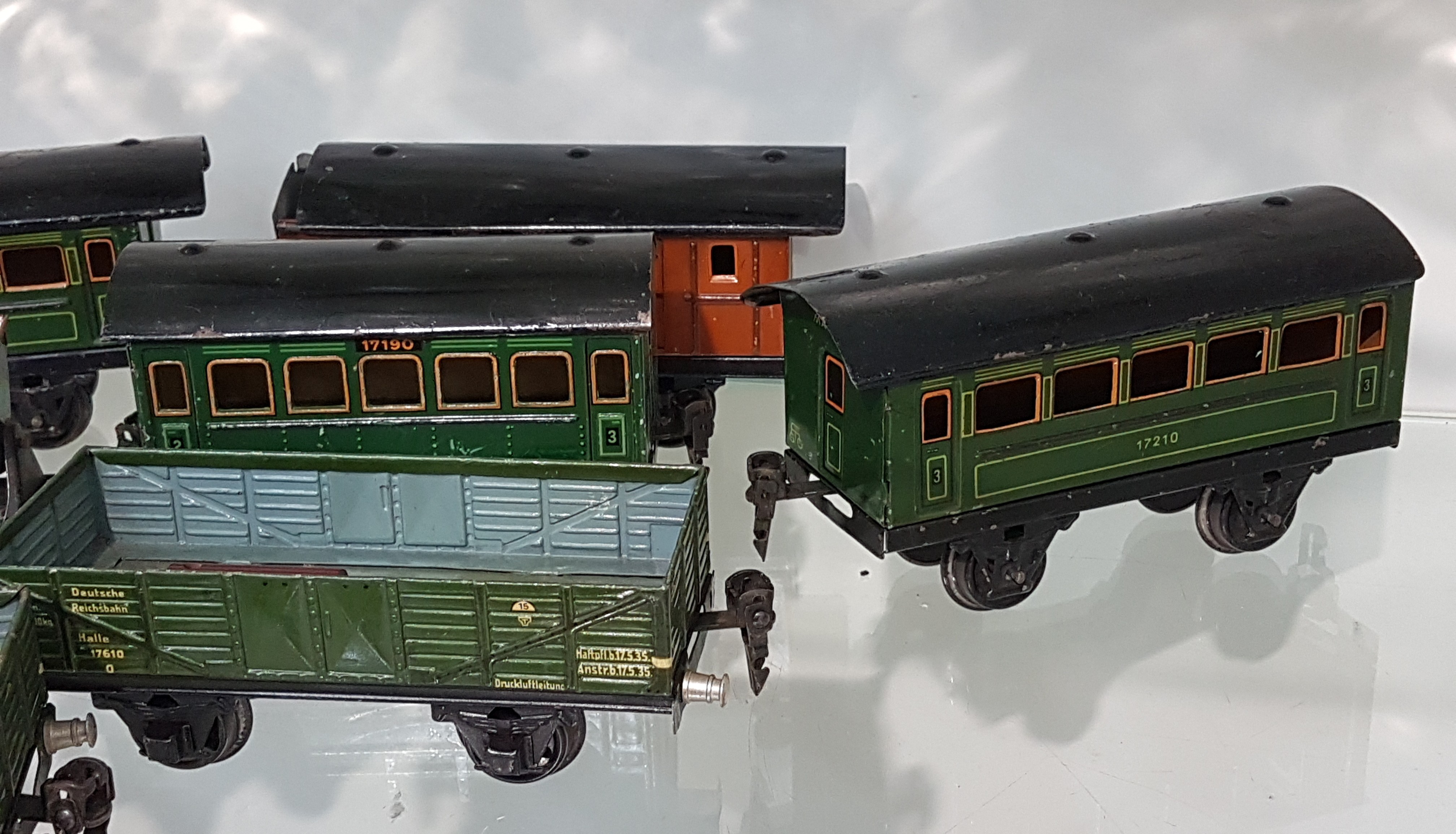 R 909), 3 Personenwägen 2x 17210 und 17190 in grün, Güterwägen/Loren 17220, 2x