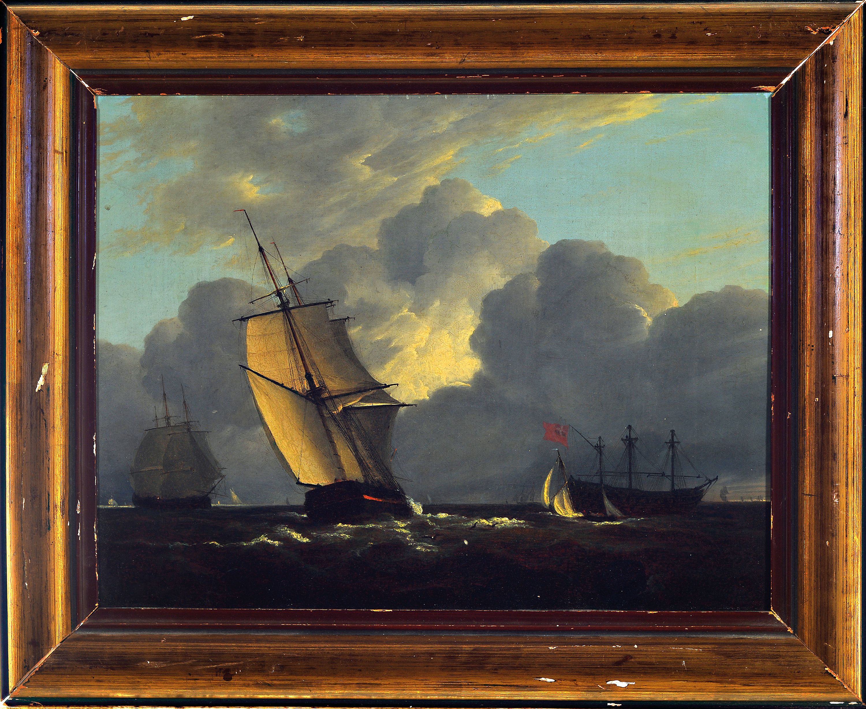 vor zwei Kriegsschiffen in stürmischer See, bewegter Himmel, unsigniert, Öl/Lwd,