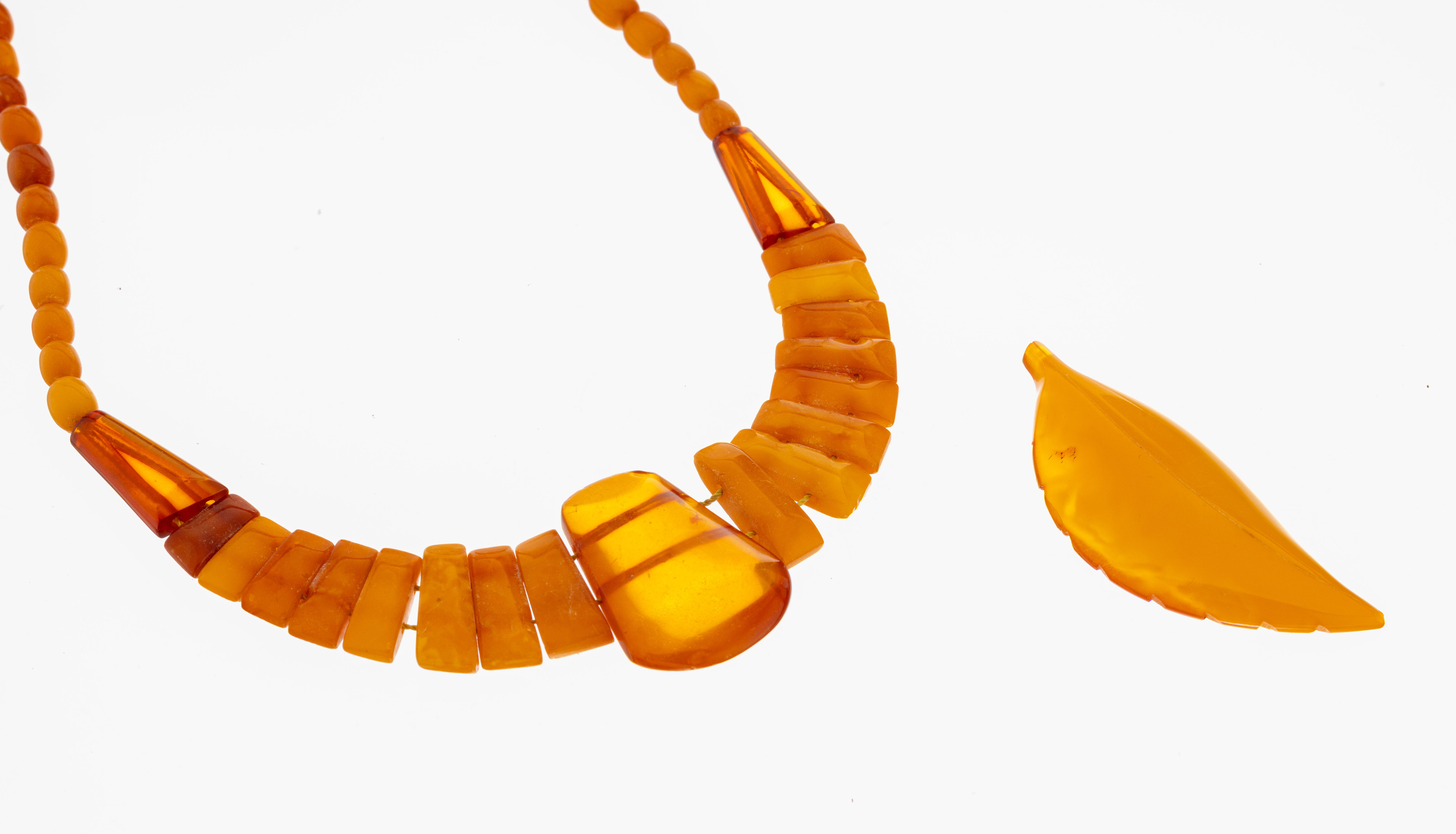 und Farbnuancen, L. ca. 43 cm, Schraubschließe, dazu 1 Bernstein-Blatt, ehemals