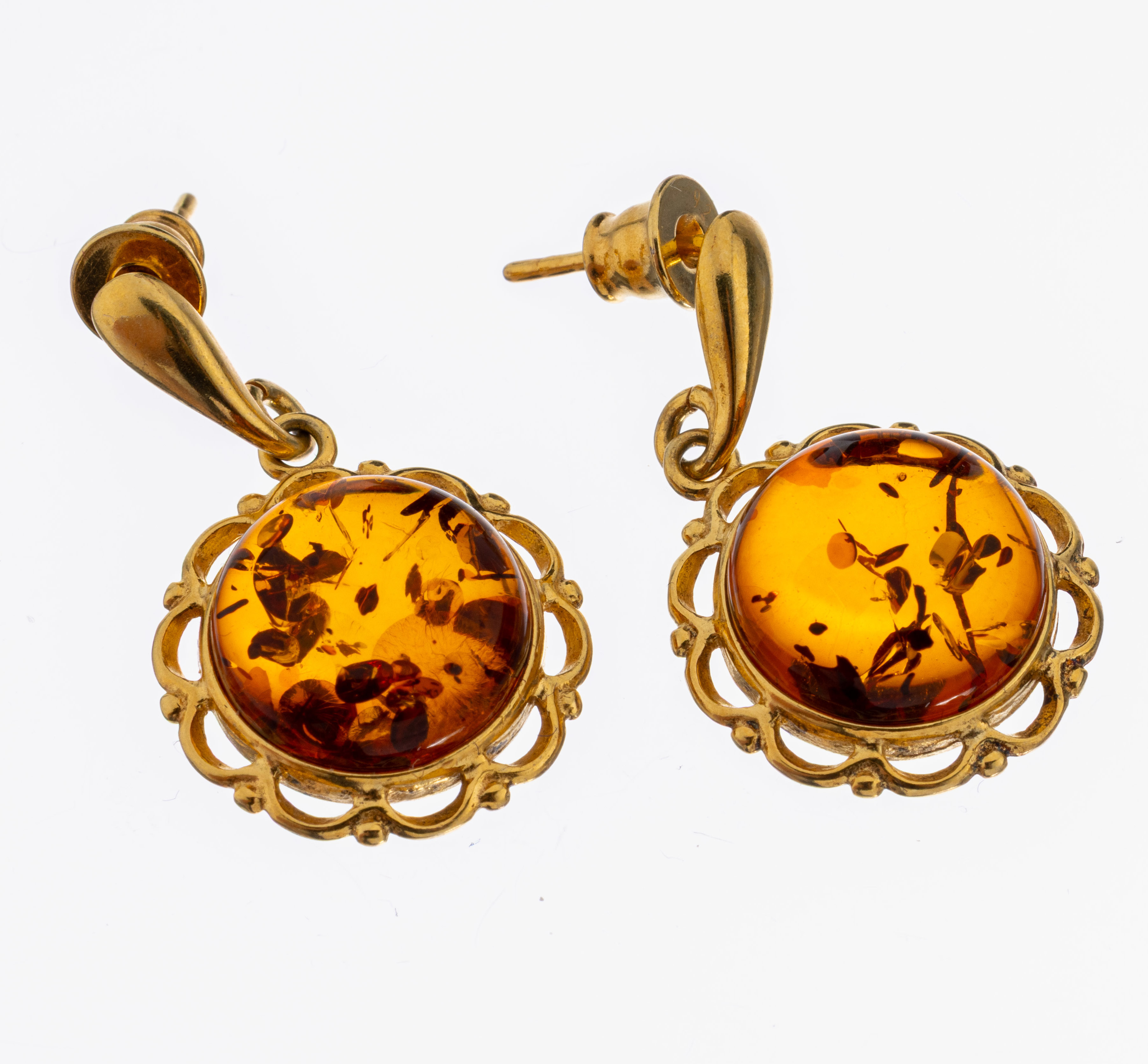 Paar Ohrstecker mit Bernstein Fassung Silber vergoldet, 2 runde Bernstein- Cabochons mit winzigen Inclusen, Durchm. ca. 11.9 mm, L. ca. 2.6 cm