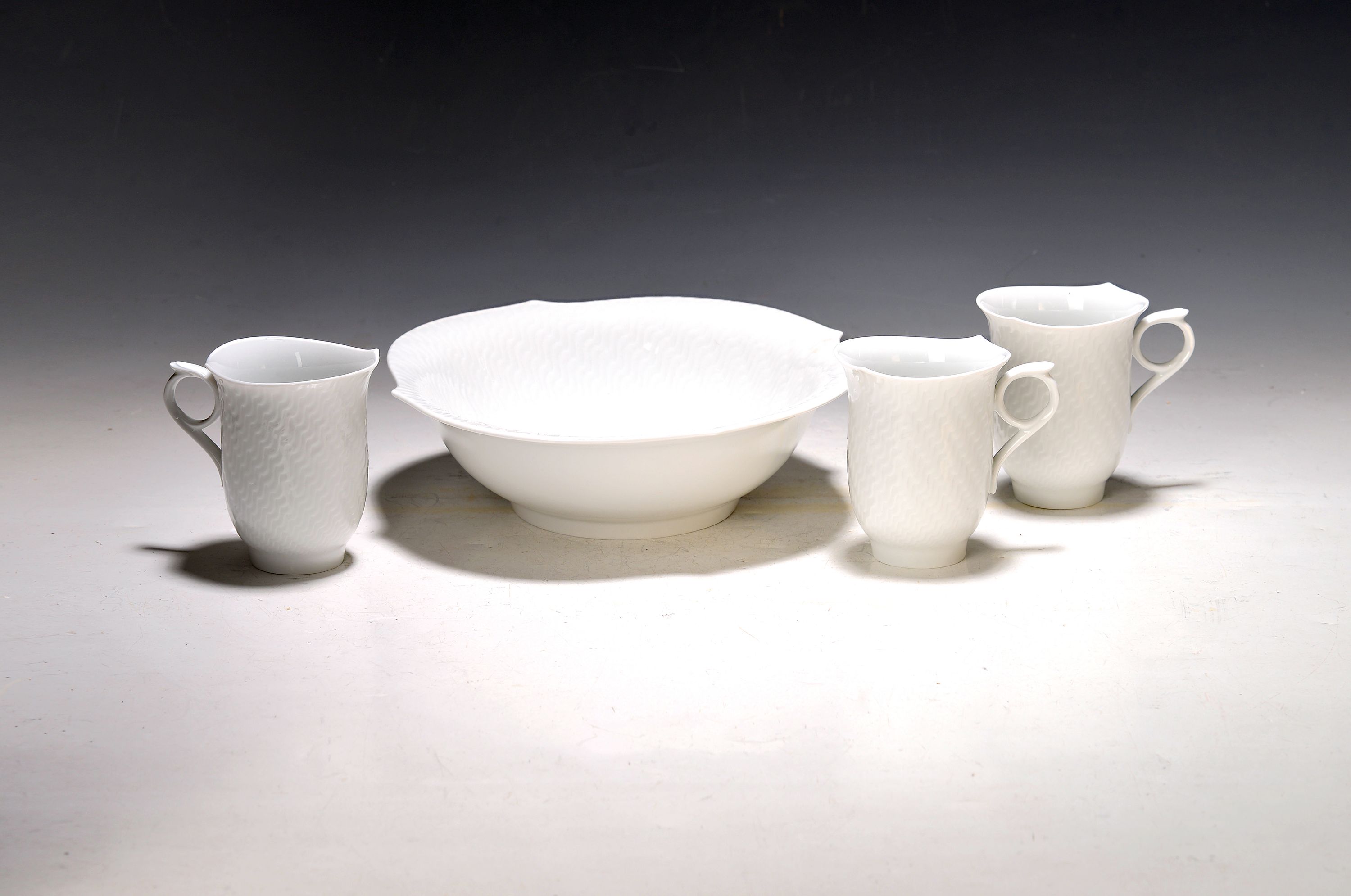 6 Bechertassen und eine Schale, Meissen, Dekor Wellenspiel, weiß, vier Glasurstriche,