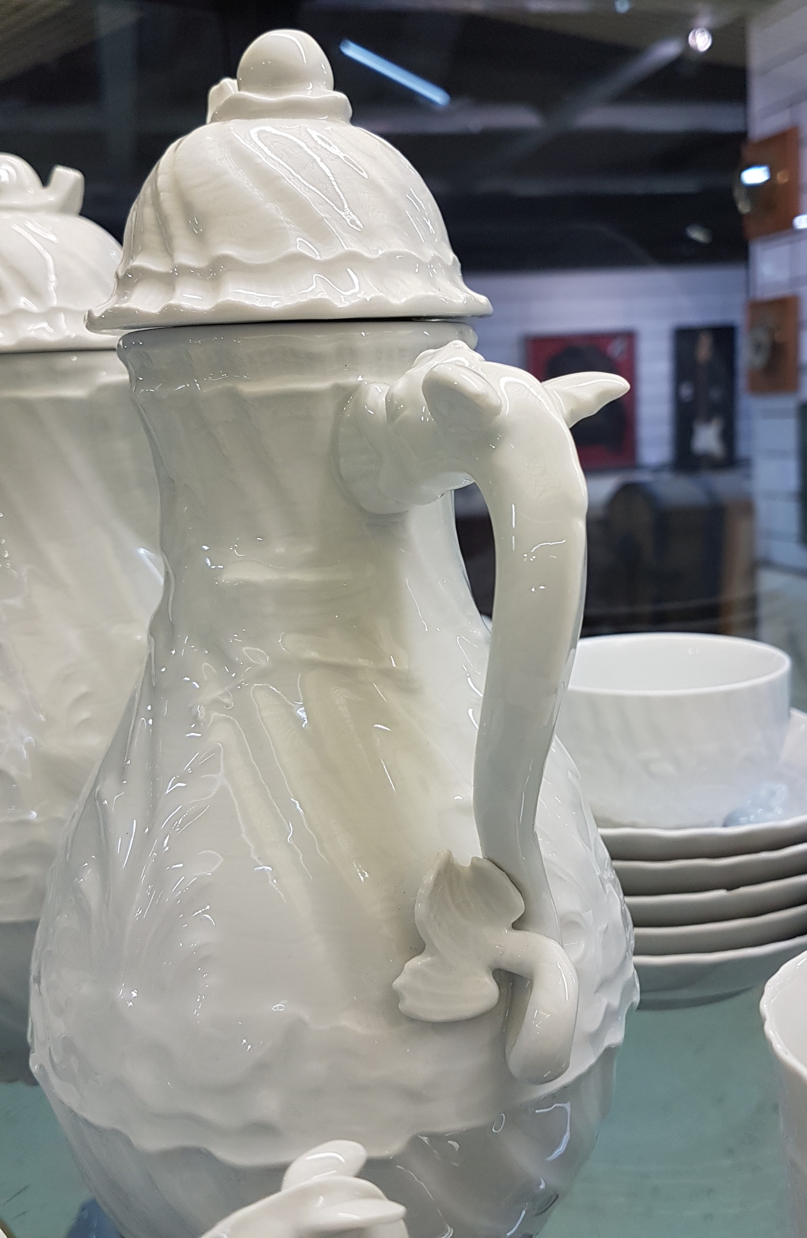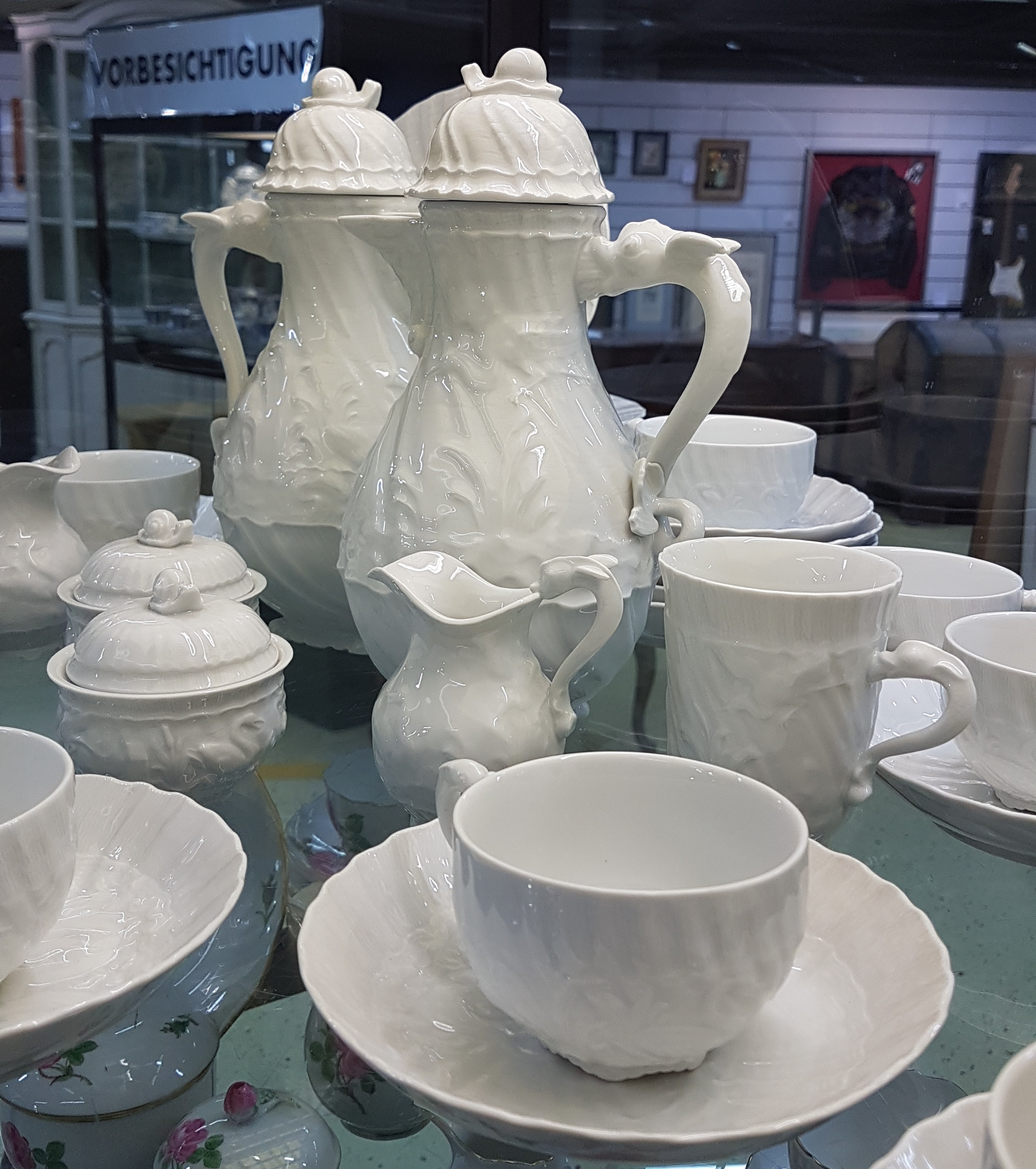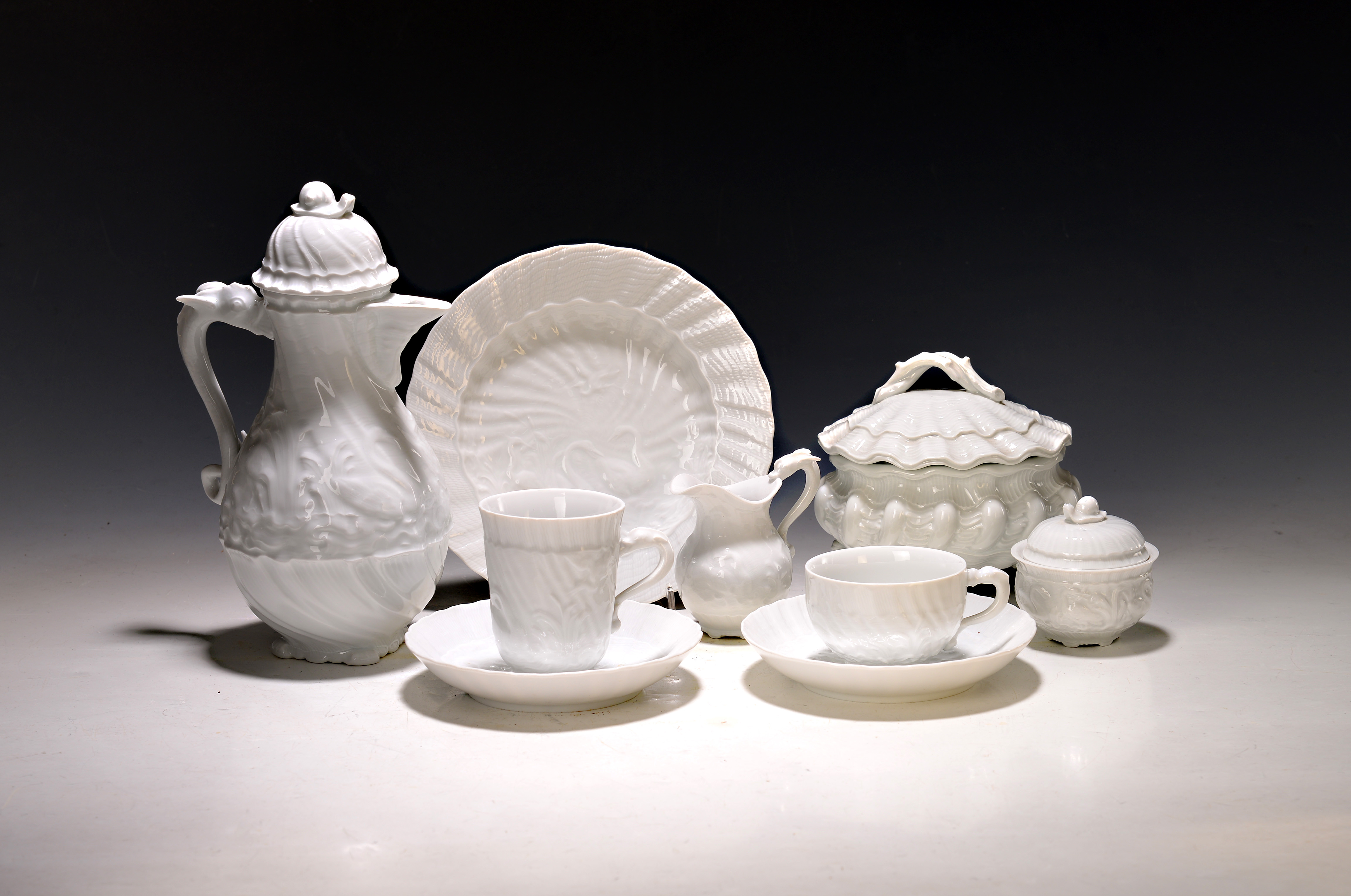 Kaffeeservice, Meissen, 20. Jh., Schwanenservice weiß, 4 Glasurstriche, 2 Kannen,