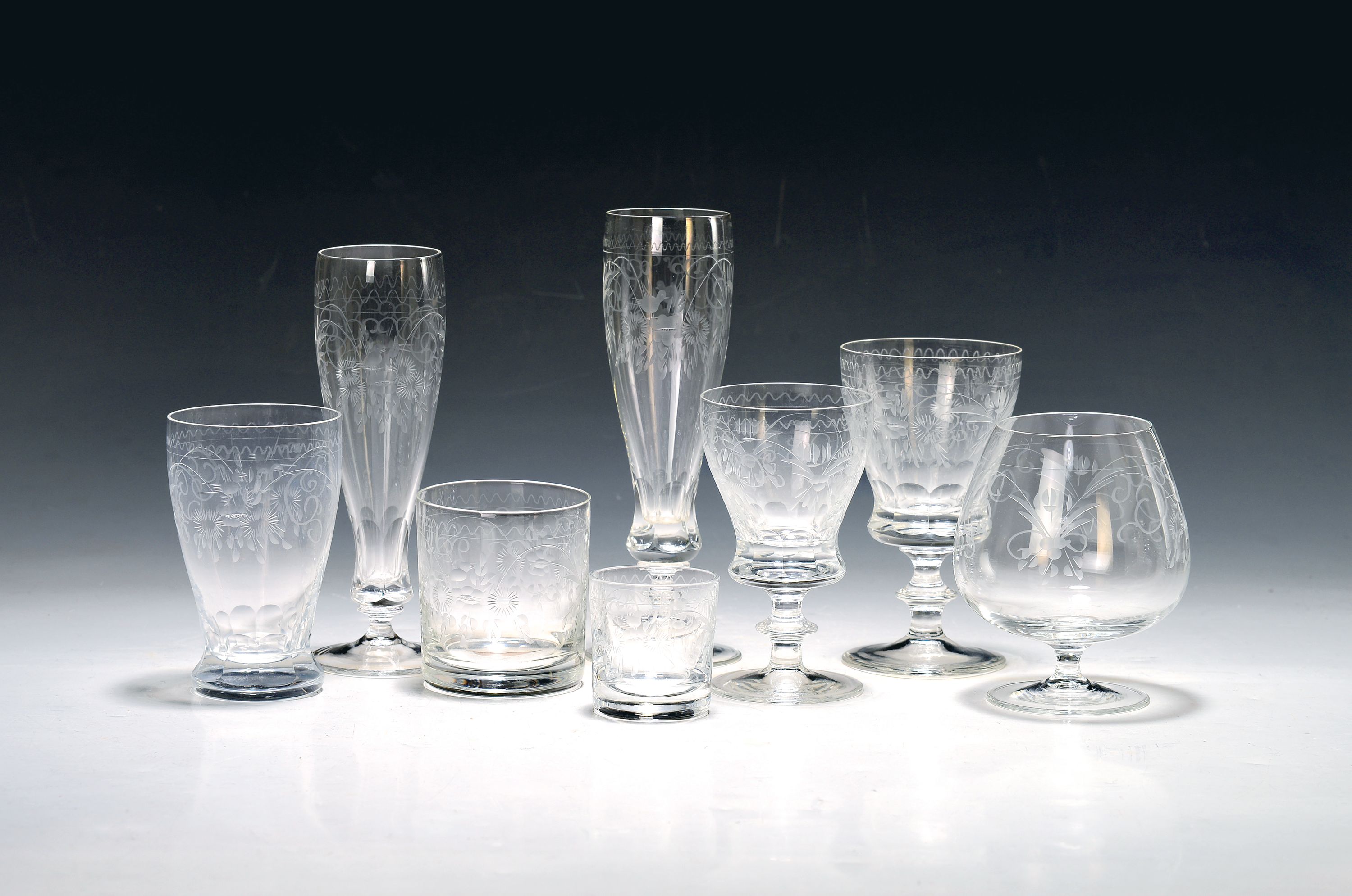 Trinkglas-Service, Theresienthal, 20. Jh., farbloses Glas, Kuppa fein geschliffen