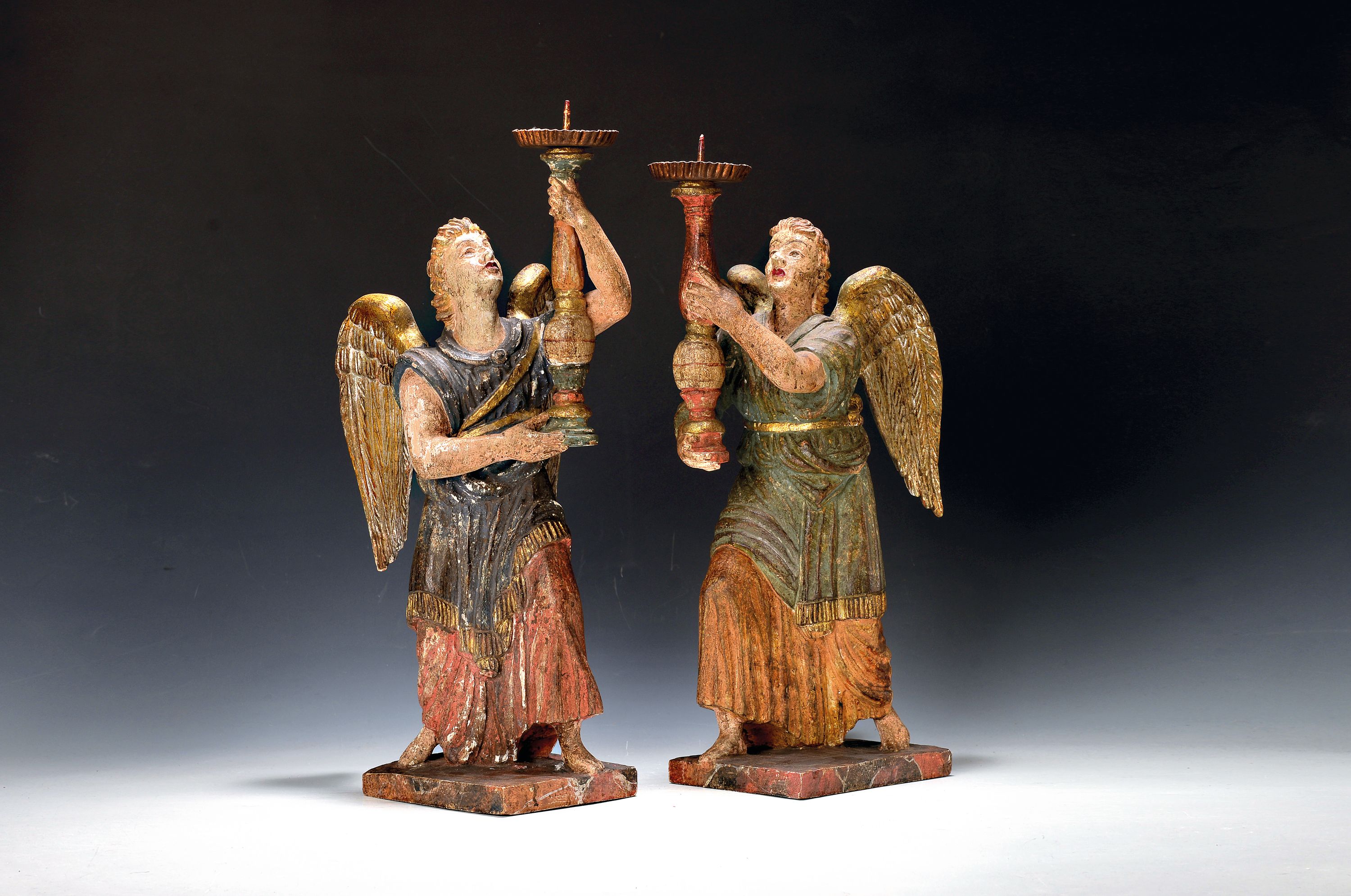 Paar Engelsleuchter, süddeutsch, 20.Jh., Holz geschnitzt, farbig und gold gefasst,