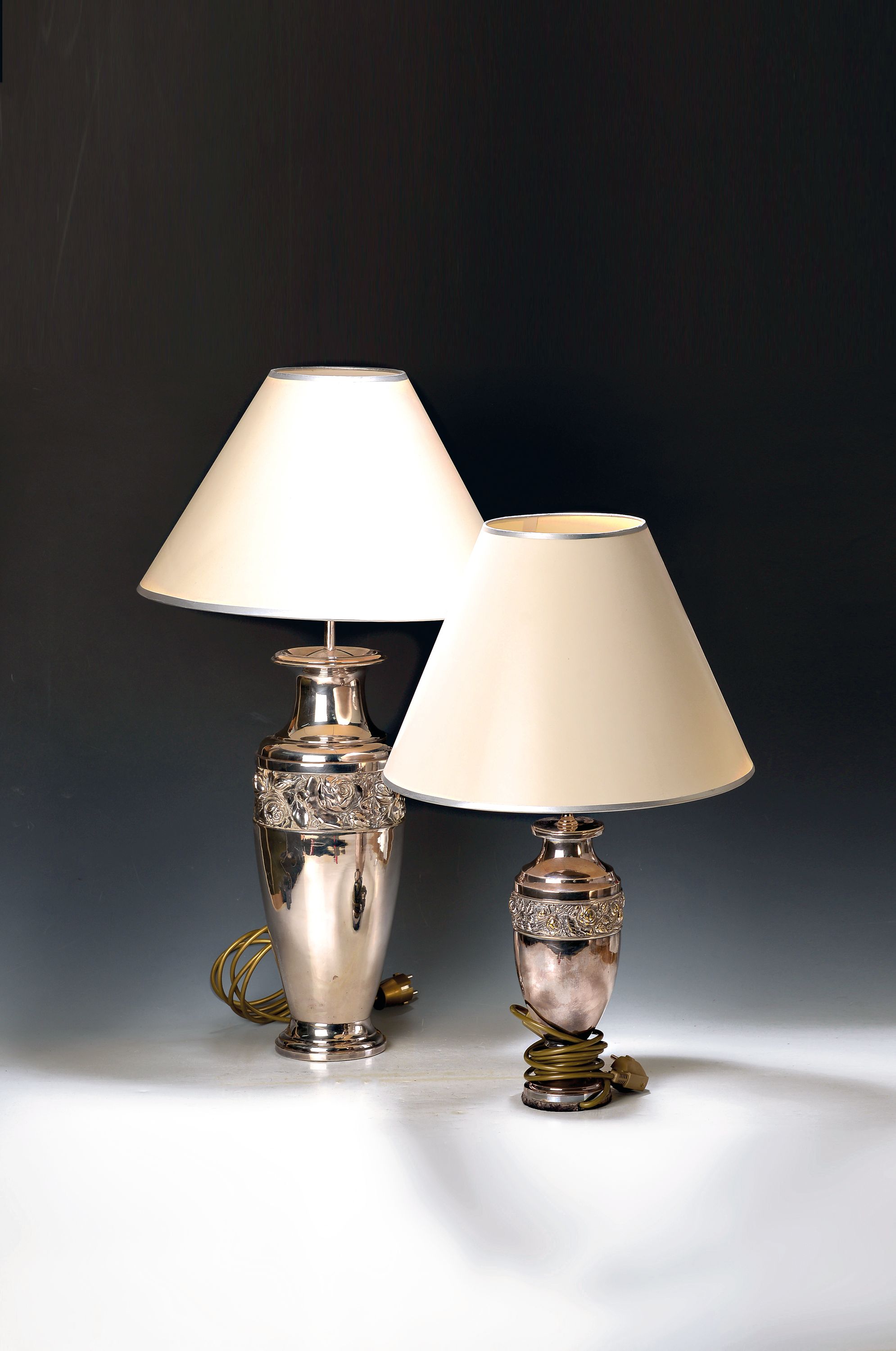 Zwei Tischlampen, wohl Beldray, England, 20.Jh., Vasenkorpus Metall versilbert, Relieffries