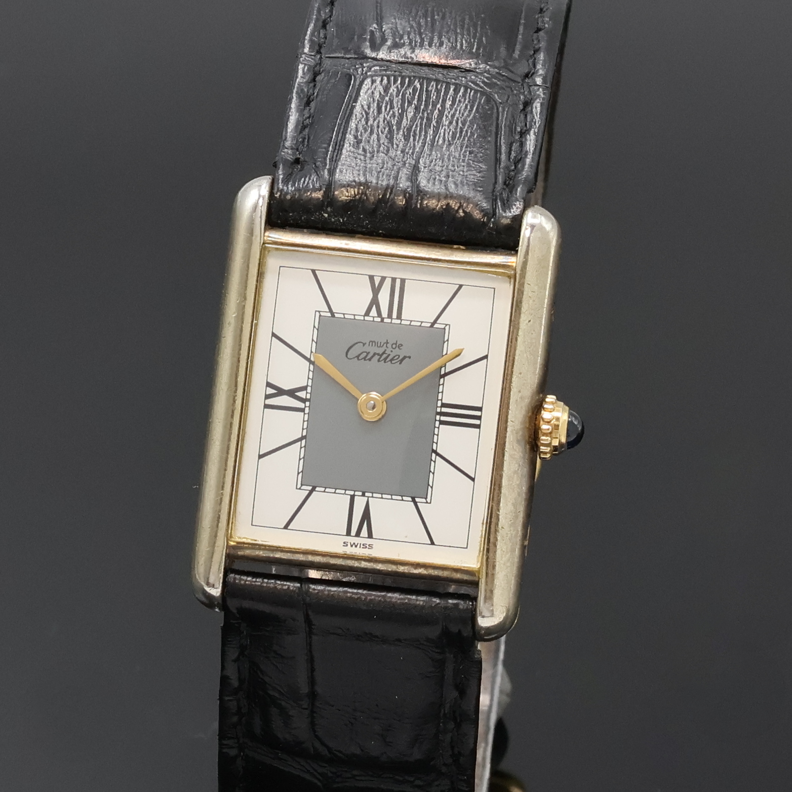 Duoton-Zifferbl. m. röm. 3, 6, 9 und 12, gold. Zeiger, Anz. v. Std. u. Min., Werk
