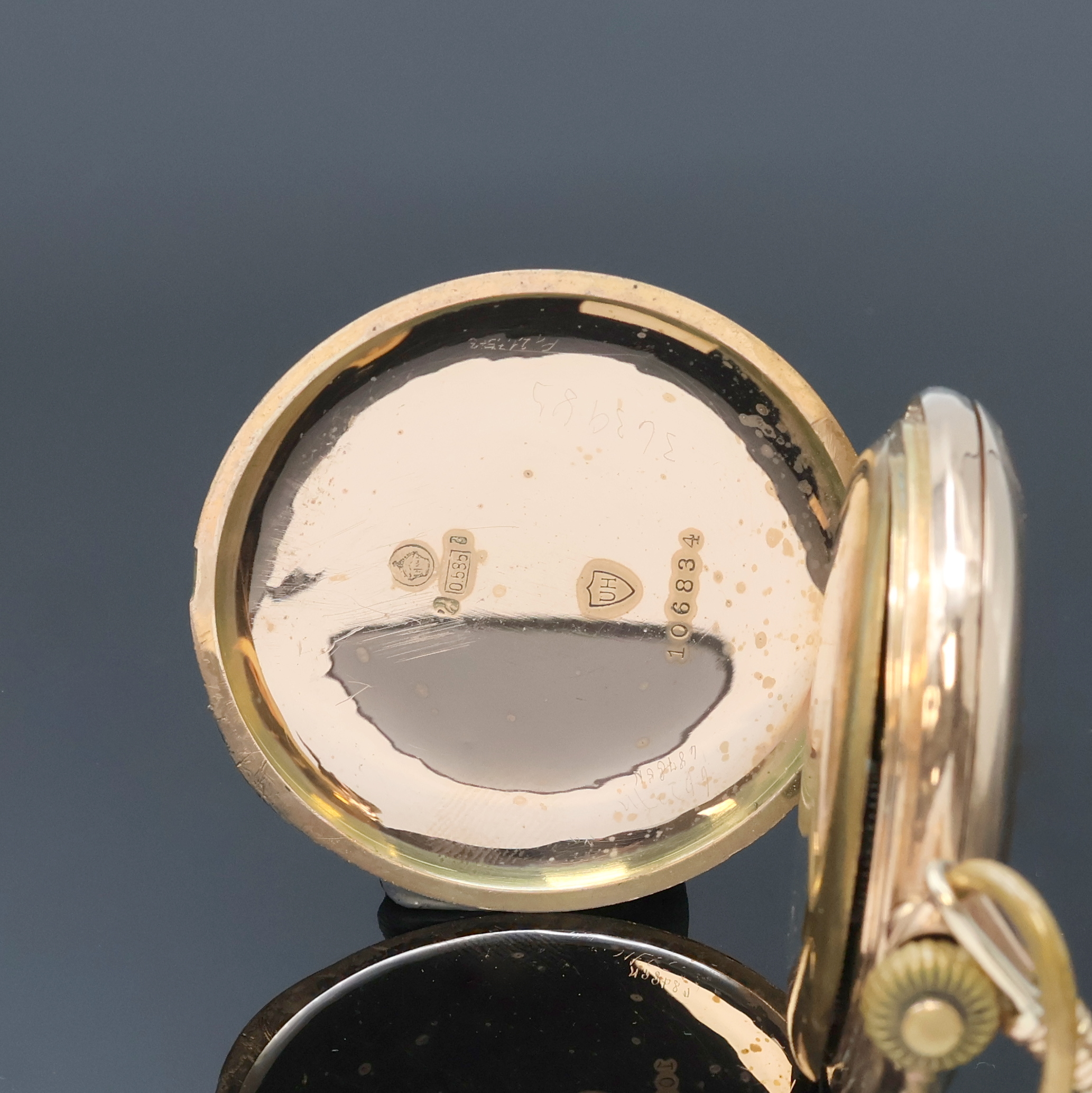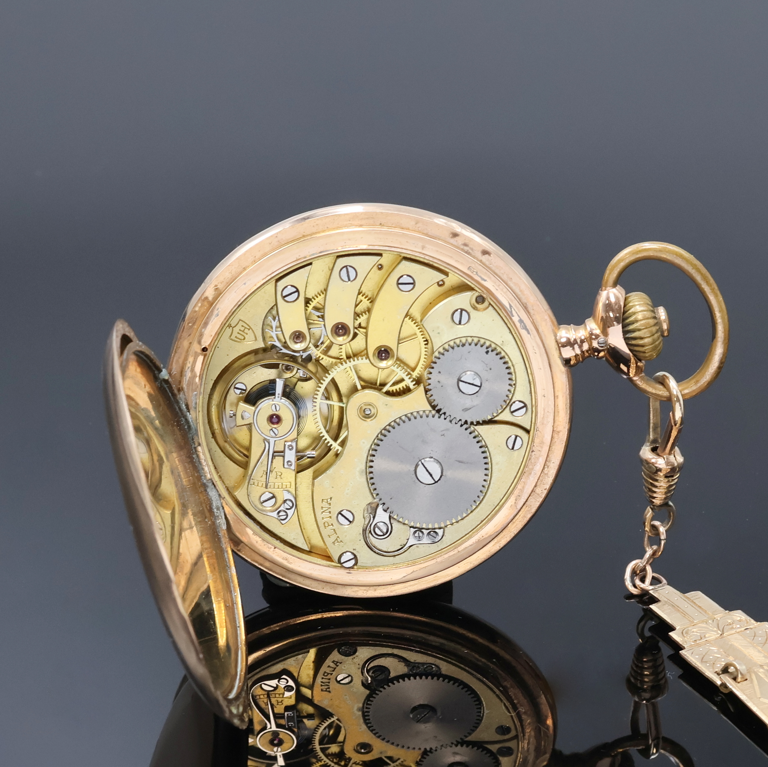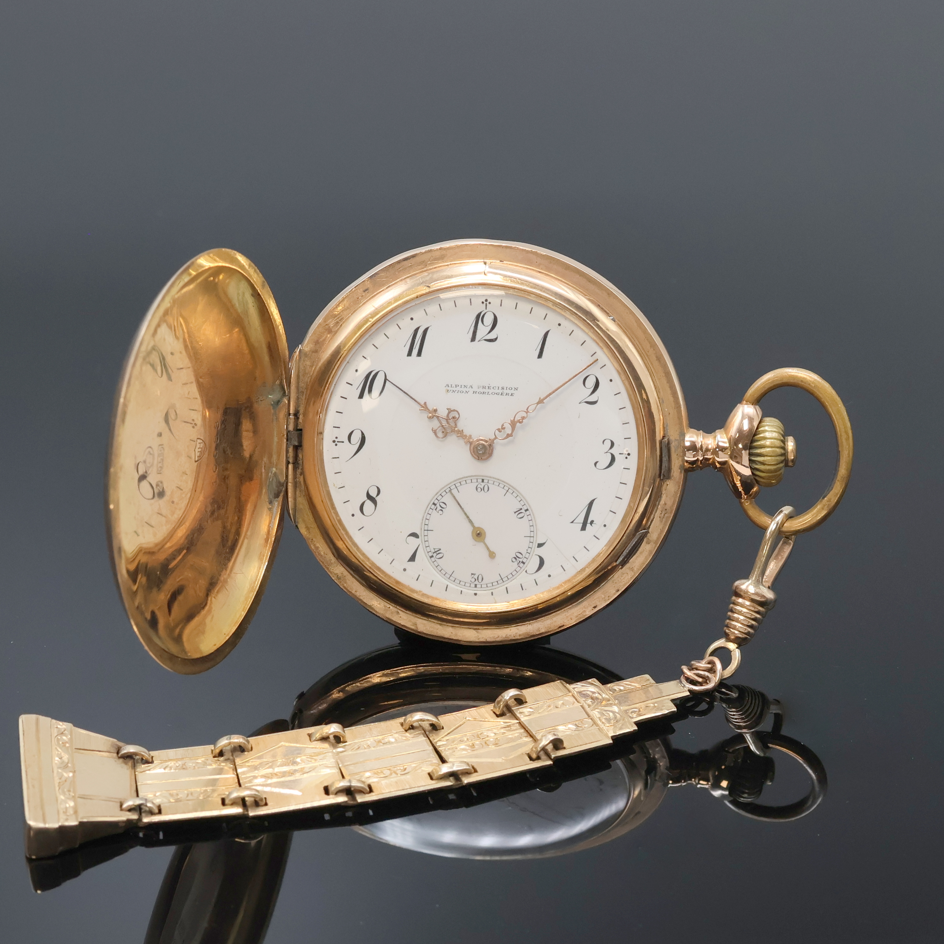 ALPINA Precision Union Horlogere Savonette Herrentaschenuhr in RG 585/000 an RG 585/000 Chatelaine, Schweiz für den dtsch. Markt um 1910, guill. 2-Deckel Goldgeh. dell., Emailzifferbl. riss., Zeigerstellriegel innen bei 4, verg. Ankerw., 16 St., Komp.-Unr., gebl. Breg.-Spir., Schwanenhalsfeinreg., D. ca. 52 mm, Nutzsp. altersbed., EZ 3, Gewicht ca. 107g, davon Chatelaine ca 14,5g
