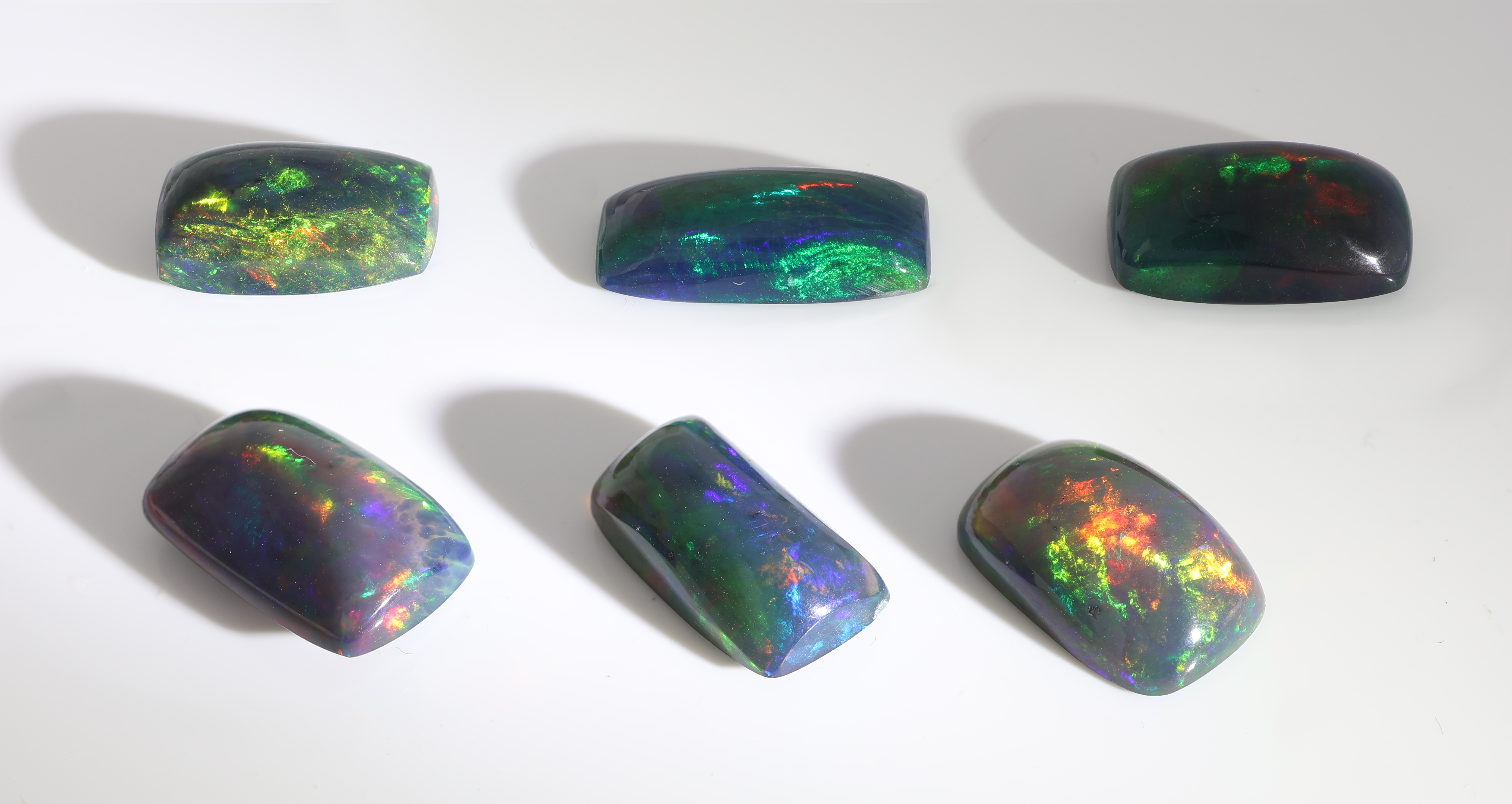Lot 6 lose Opalcabochons, 17.22 ct, Schwarzopal mit schönem Farbspiel in Grün, Orange und Blau, wohl beh. Schätzpreis: 2300, - EUR