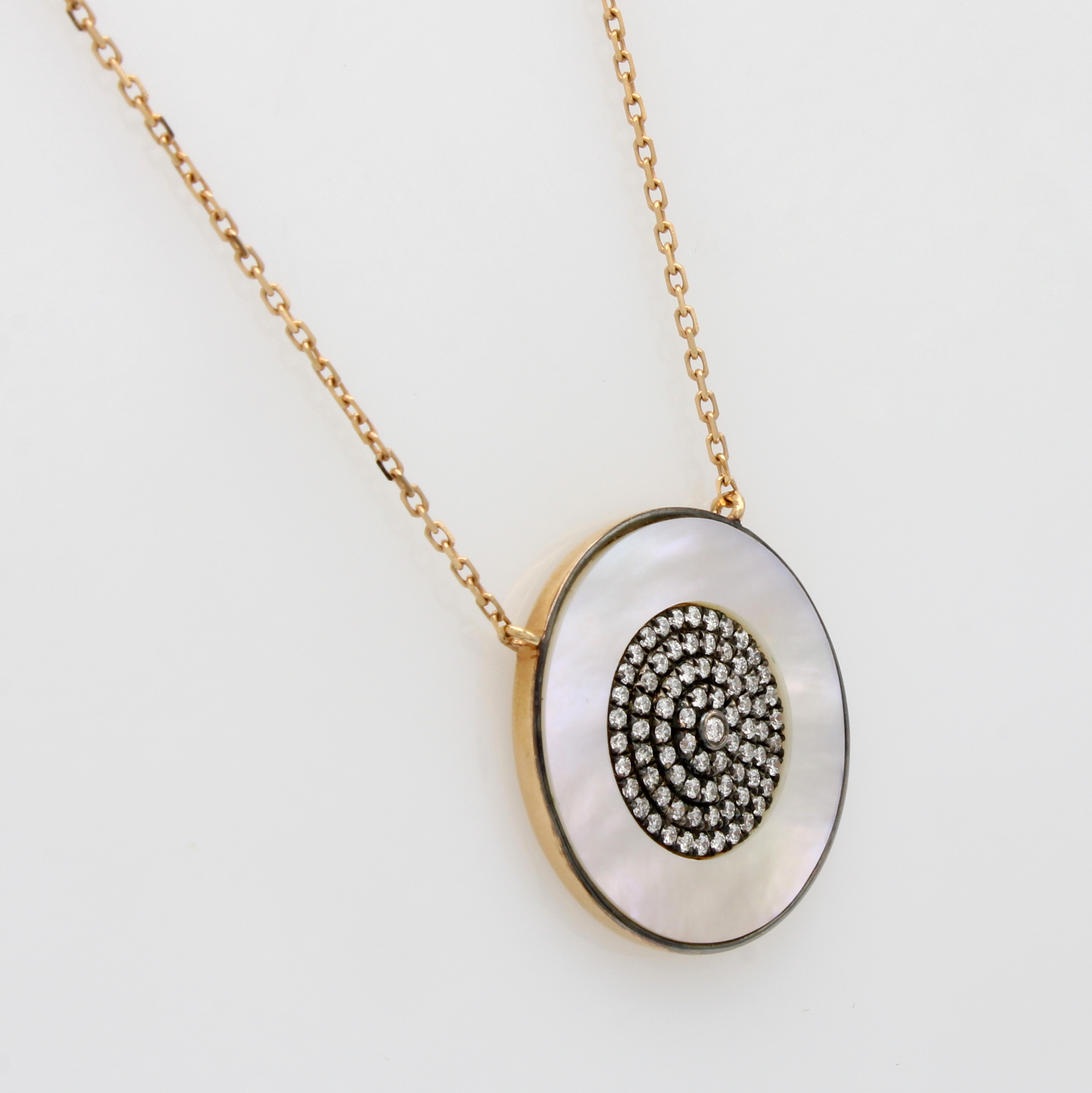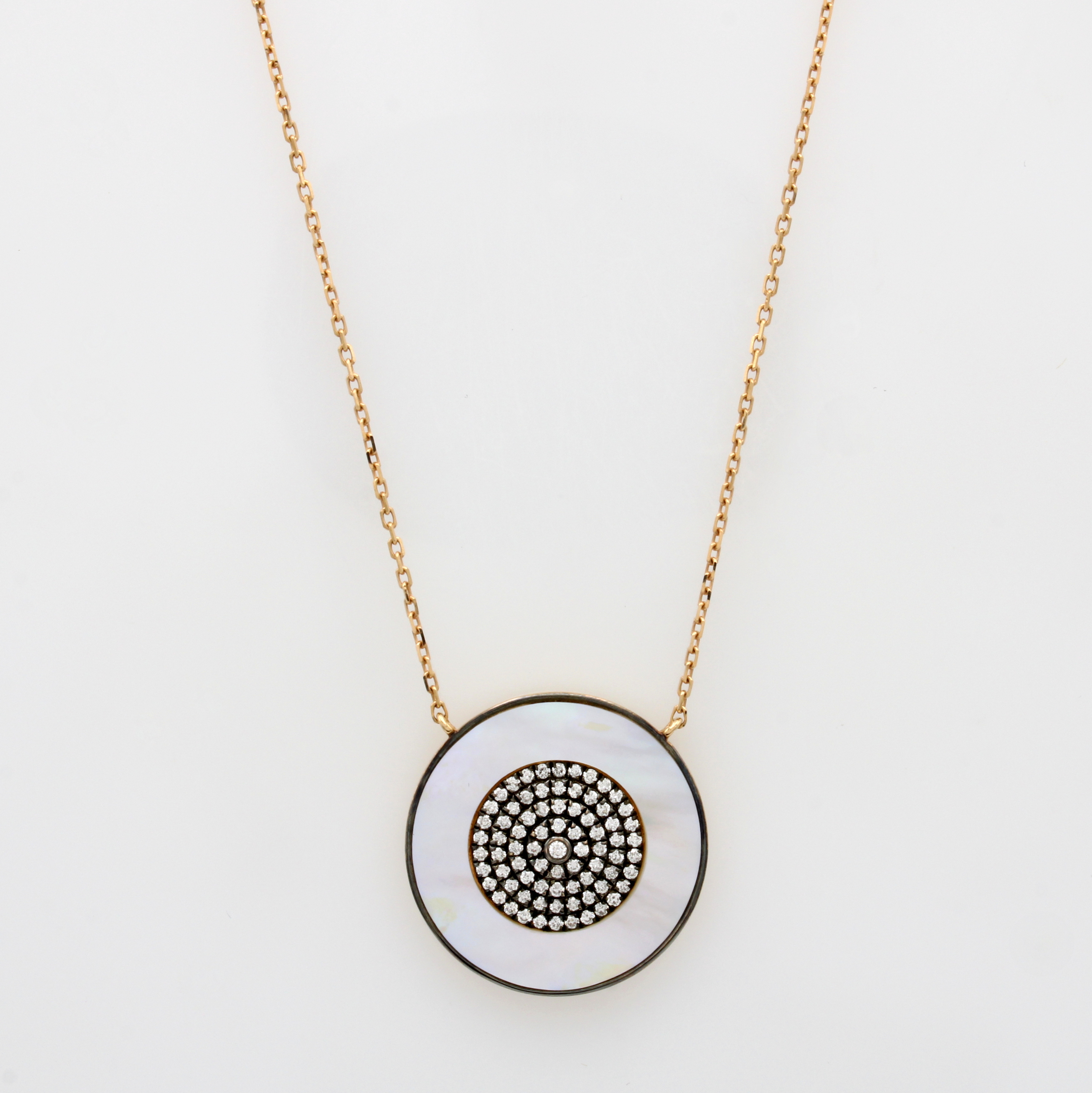 Collier mit Perlmutt und Brillanten, RG 750/000, runder Anhänger m. Perlmutteinlage, 77 Brill. in geschwärzten Fassungen zus. ca. 0.55 ct feines Weiß/si, in L. ca. 40.5, 43.5 u. 46 cm tragbar Schätzpreis: 4300, - EUR
