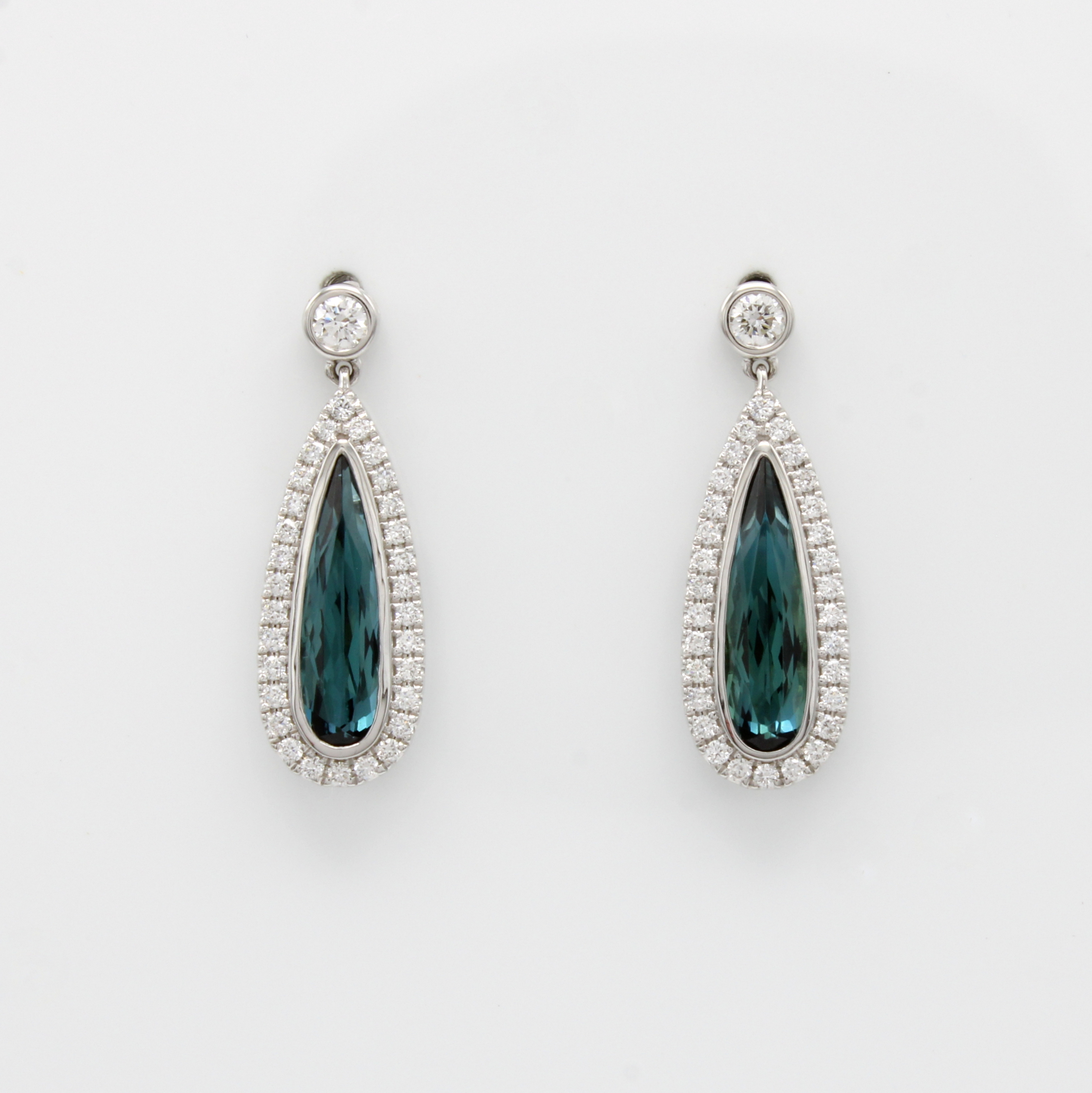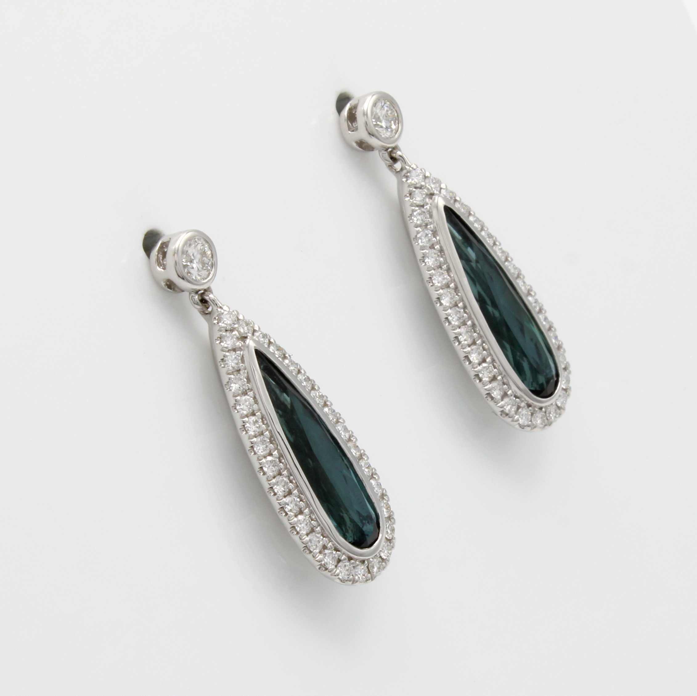 Paar Ohrstecker mit Indigolithen und Brillanten, WG 750/000, 2 fac. Indigolith- tropfen zus. ca. 2.25 ct, 62 Brill. zus. ca. 0.57 ct feines Weiß/vs Schätzpreis: 4880, - EUR