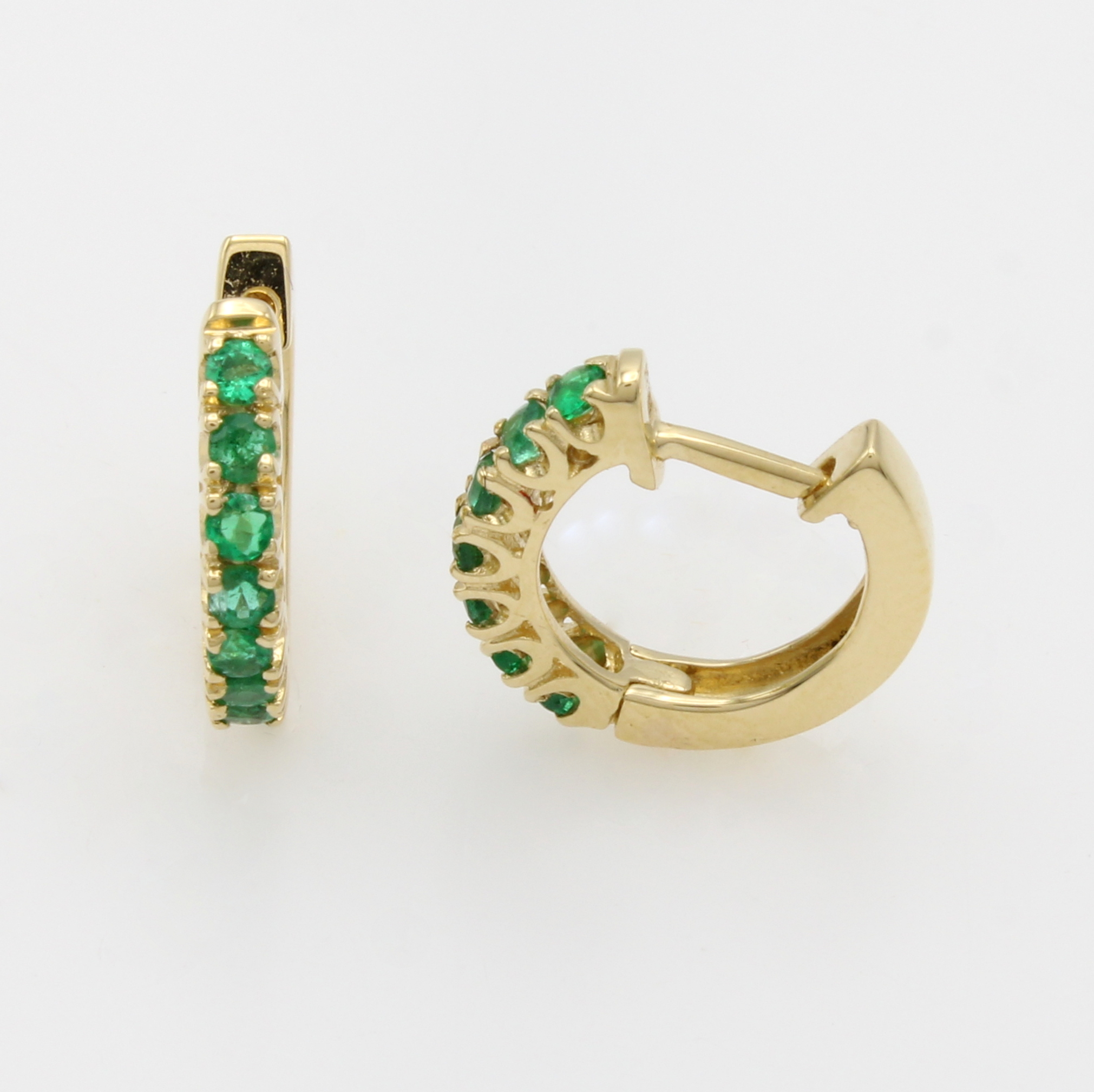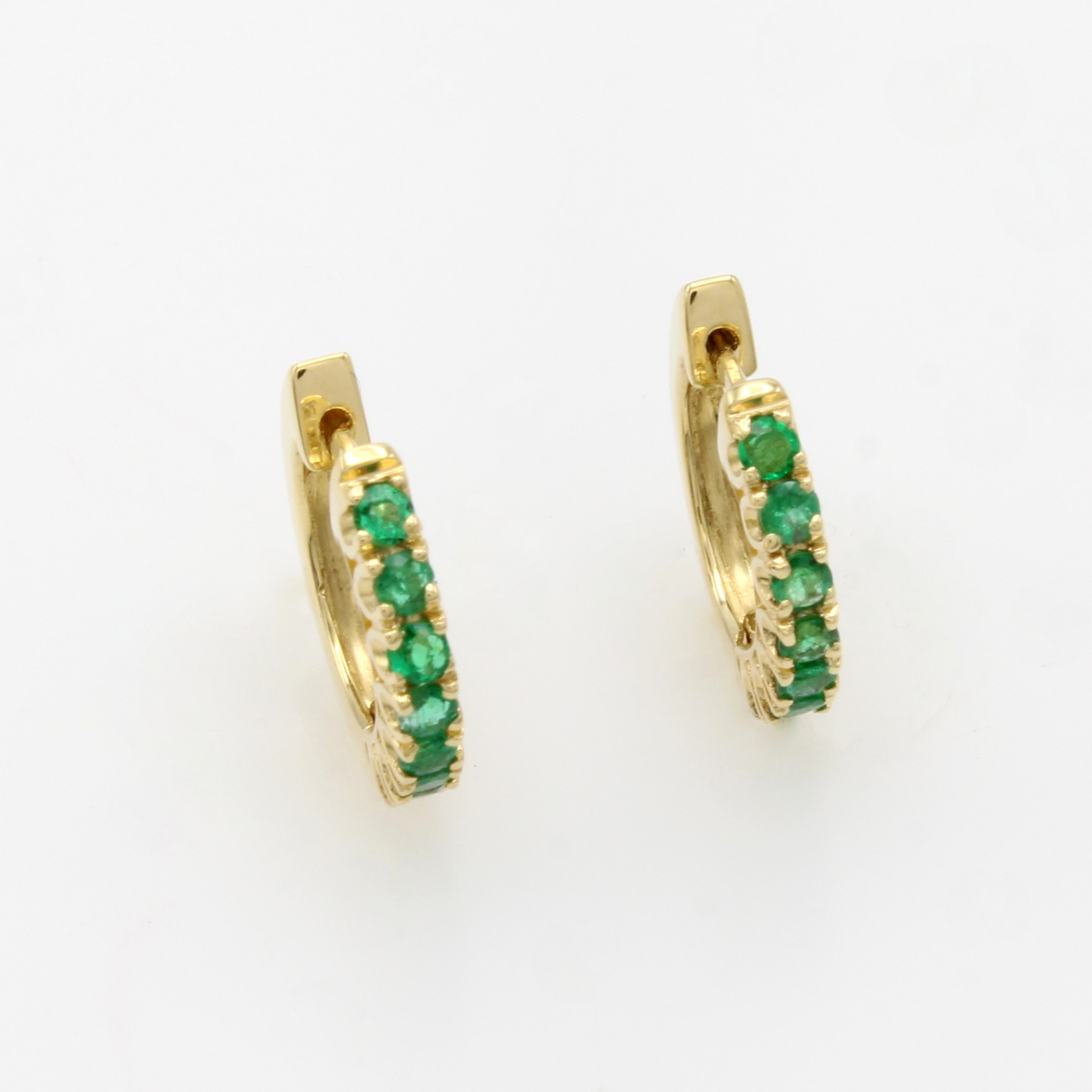 Paar Klappcreolen mit Smaragden, GG 750/000,14 fac. Smaragde zus. ca. 0.34 ct, D. ca. 13 mm Schätzpreis: 1500, - EUR