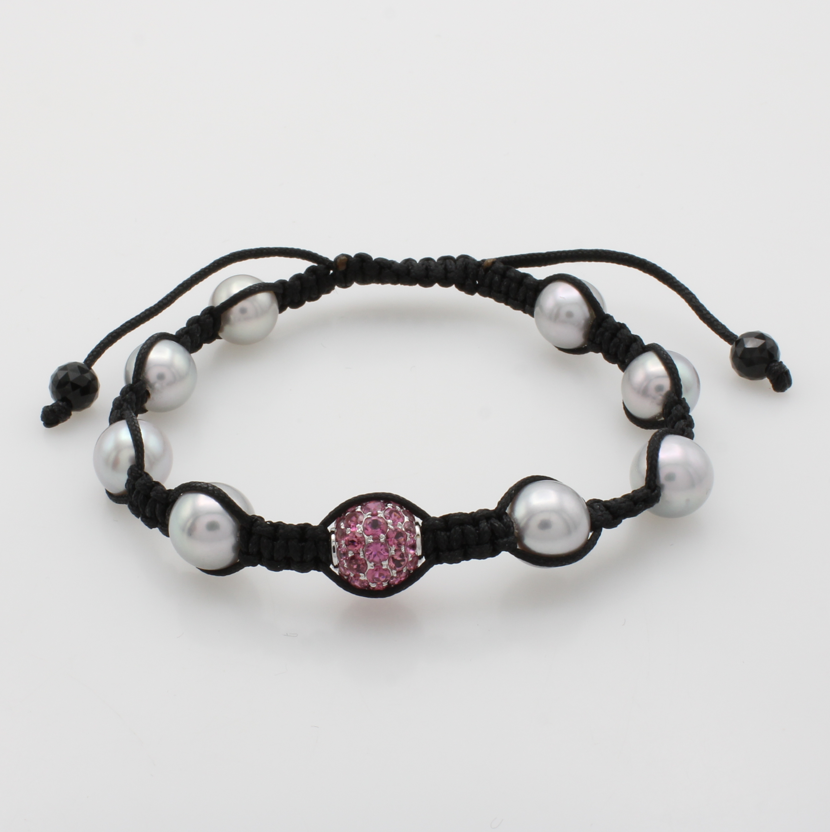 Shamballa-Armband mit Süßwasserzuchtperlen und Turmalinen, Kugel WG 750/000, schwarzer Stoff, weiße Perlen ca. 9 mm, WG-Kugel bes. m. fac. Turmalinen, L. variabel verstellbar Schätzpreis: 800, - EUR