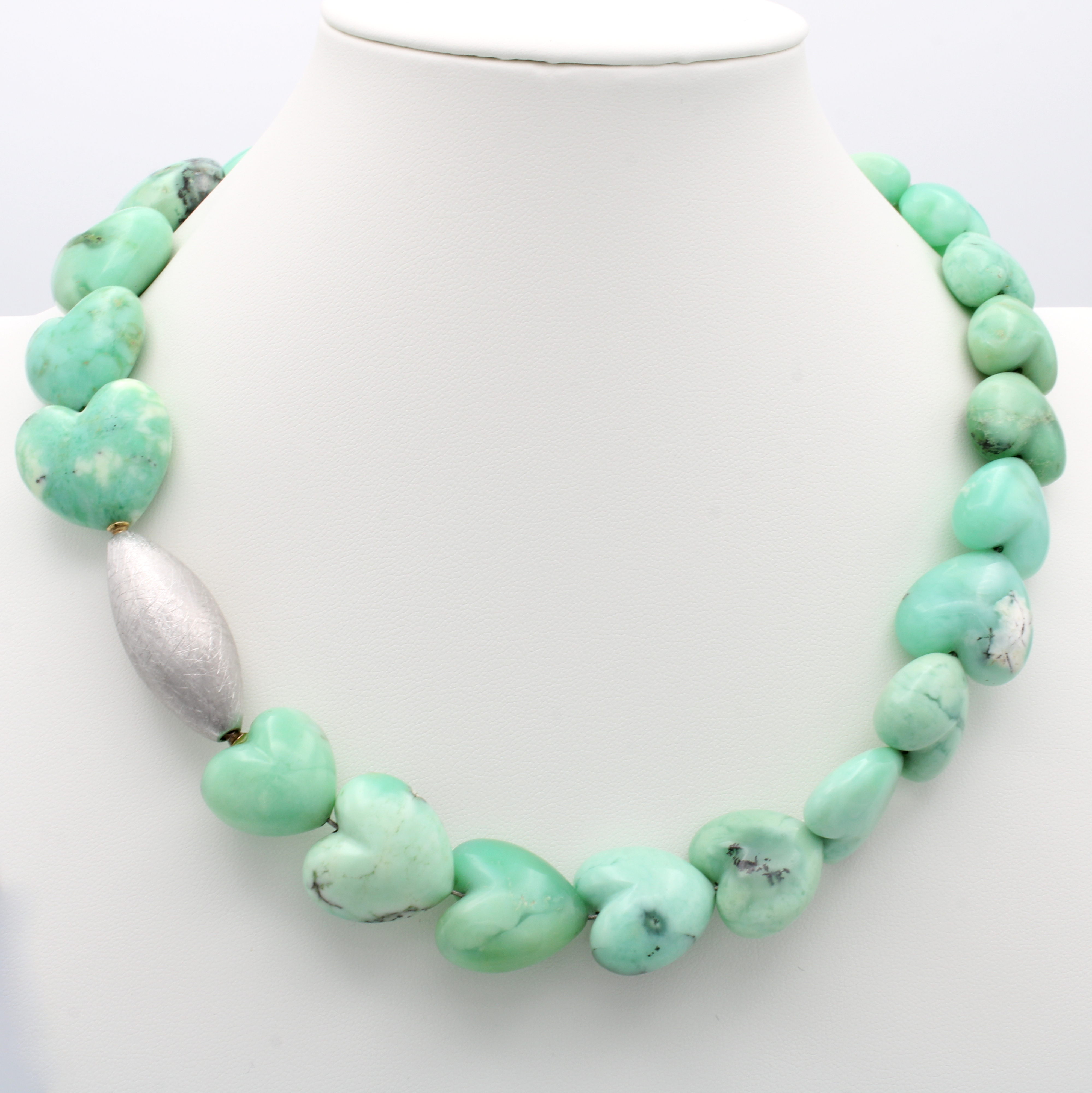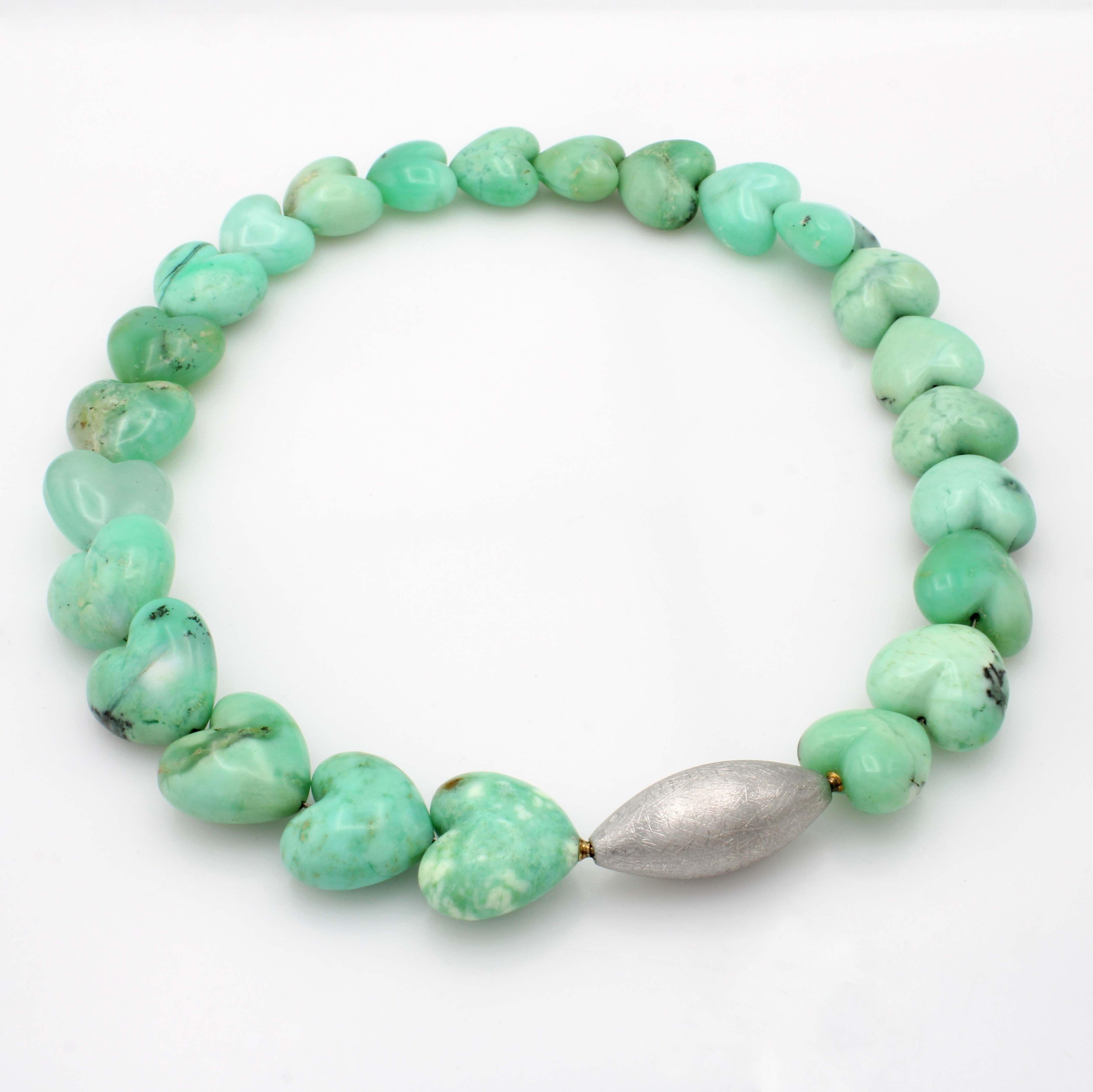 Chrysoprascollier mit Wechselschließe, olivförm., strichmatt. Schl. in 925er Silber, Chrysoprasherzen in versch. Größen, L. ca. 48 cm Schätzpreis: 800, - EUR