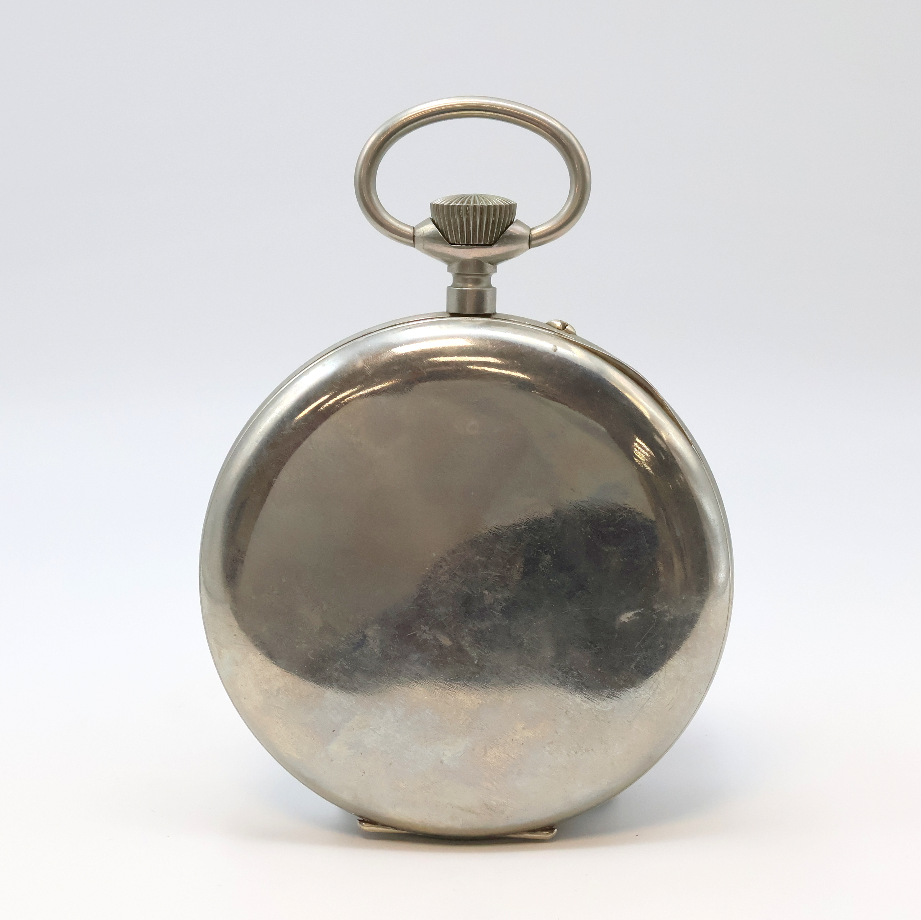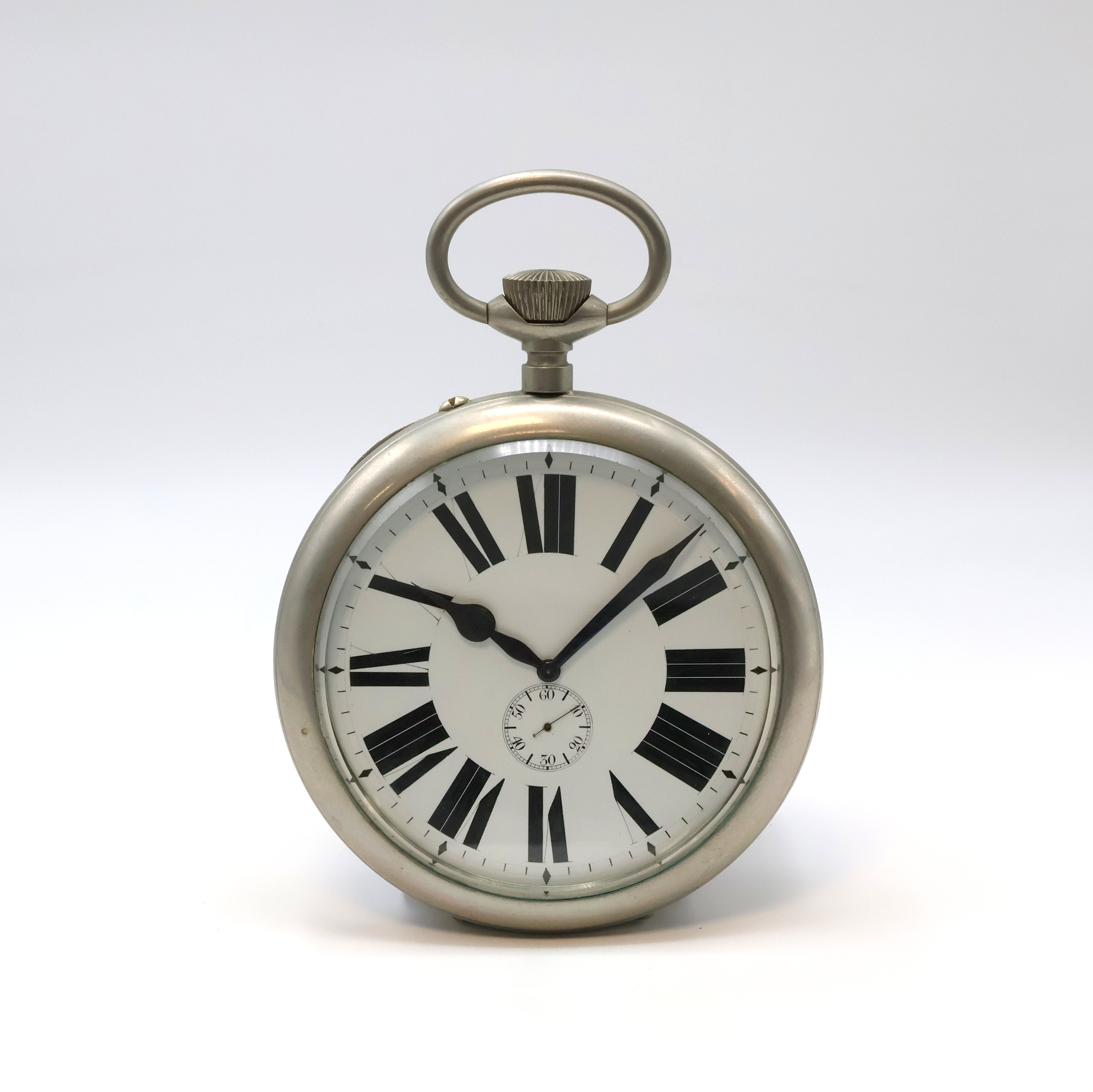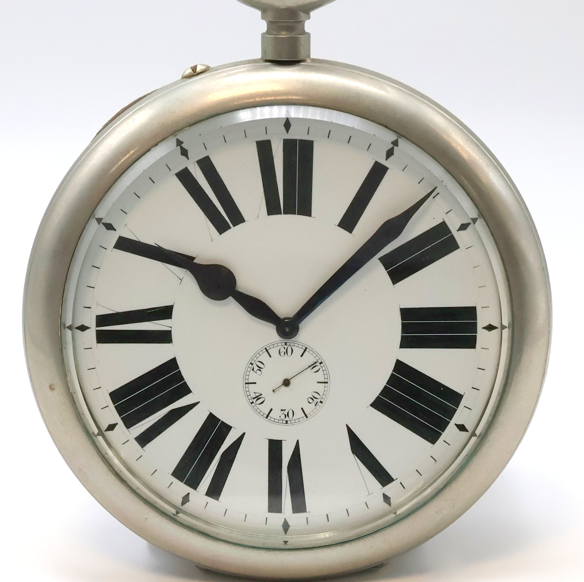 Übergroße (140 mm), offene Eisenbahner-/Dienstuhr, Schweiz um 1900, glattes Nickelgehäuse,