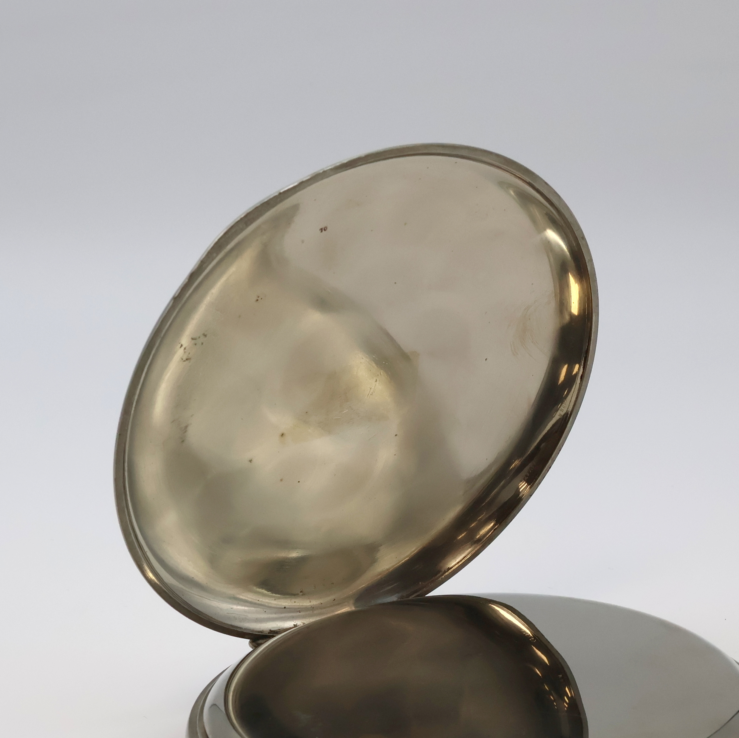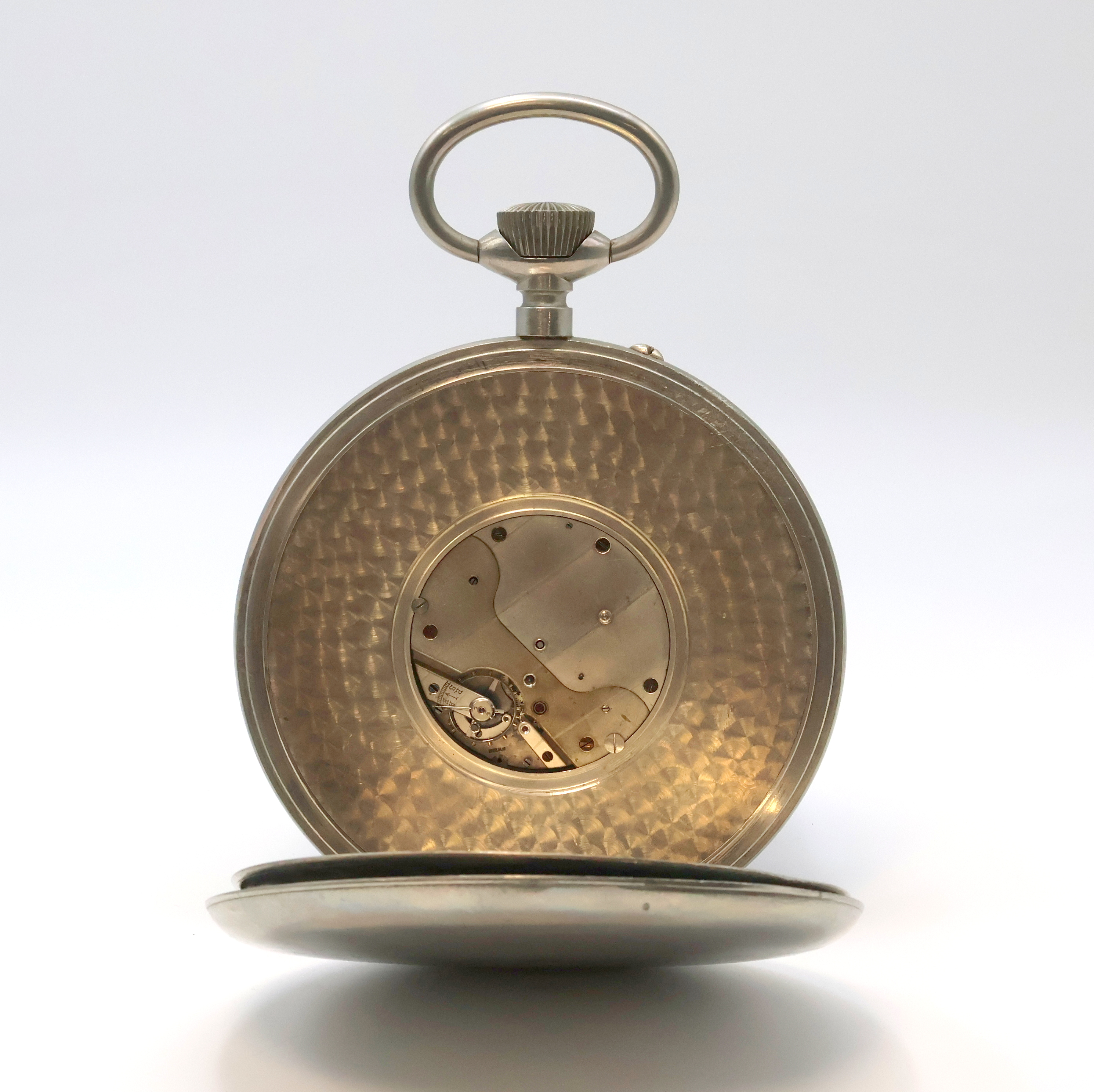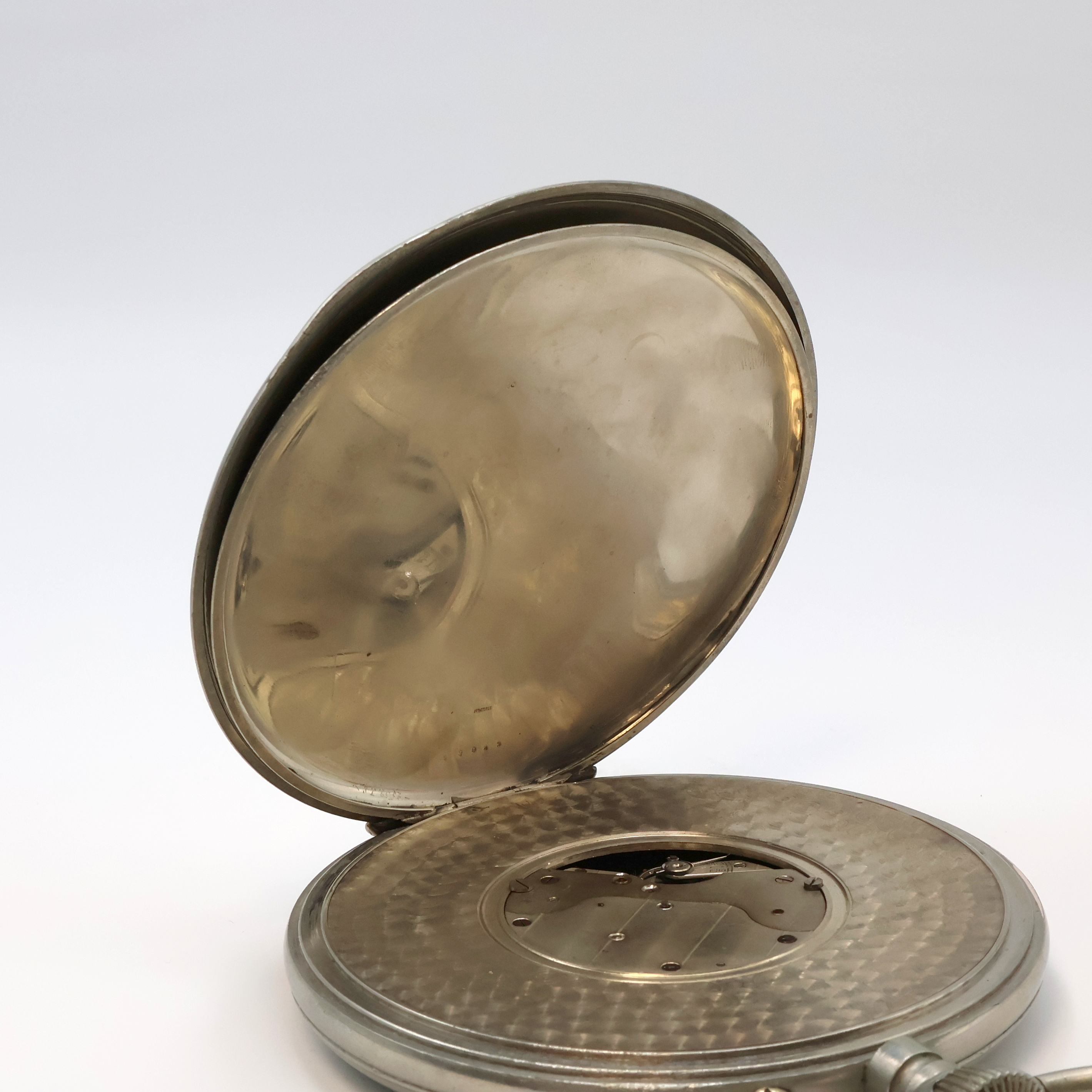 Übergroße (140 mm), offene Eisenbahner-/Dienstuhr, Schweiz um 1900, glattes Nickelgehäuse,