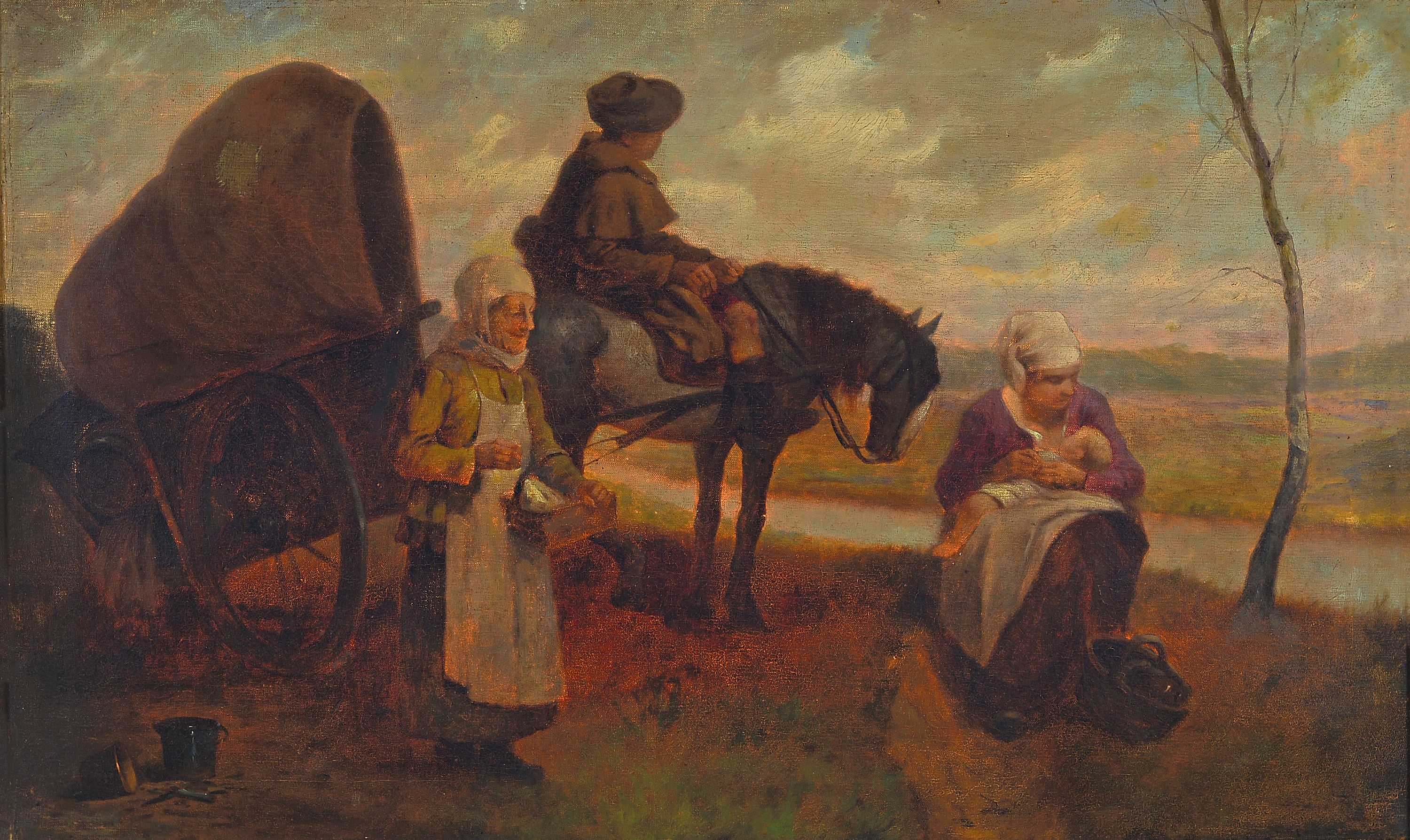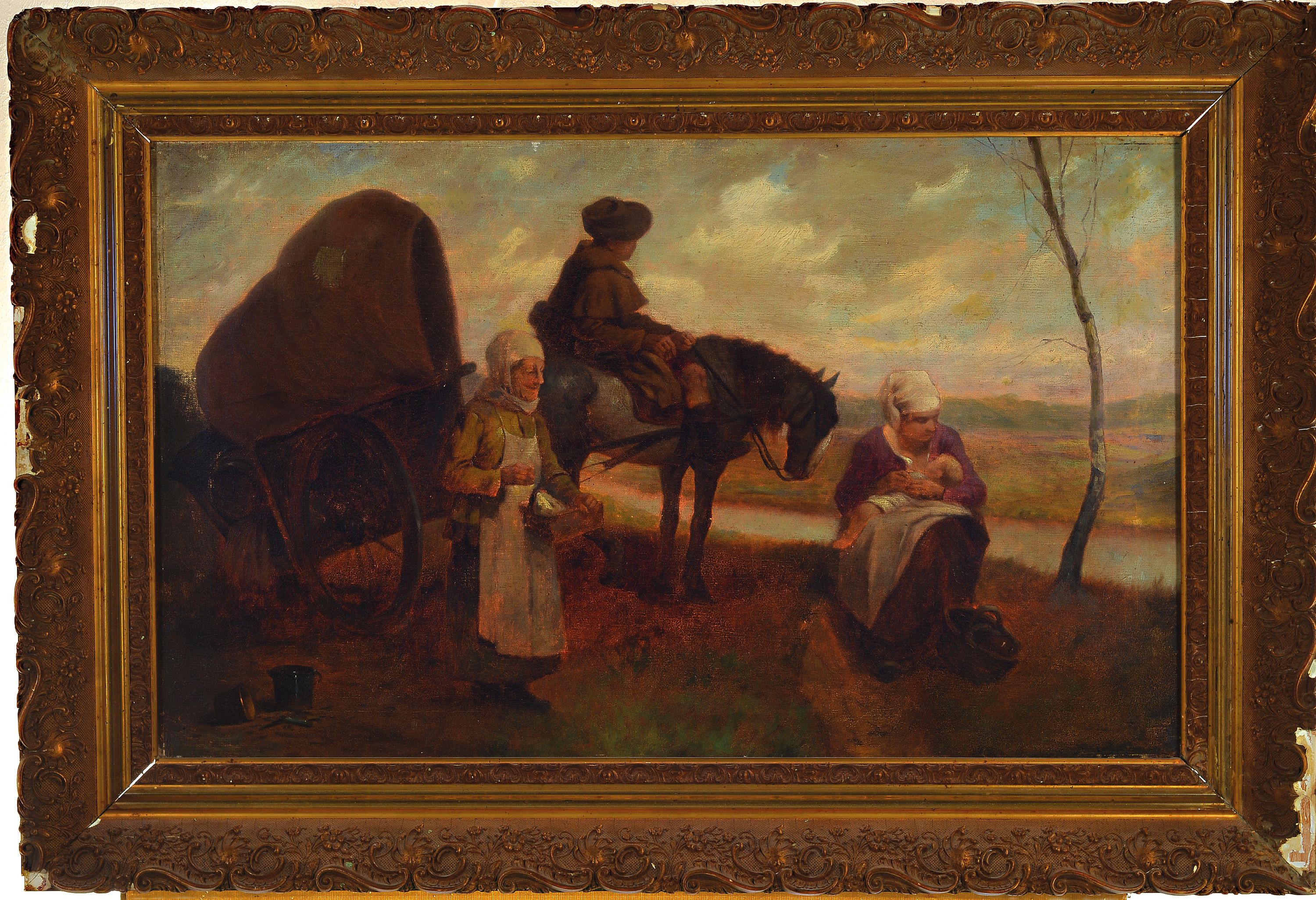 Unbekannter Künstler des 19.Jh., Bauernfamilie auf der Rast, unsigniert, Öl/Lwd,