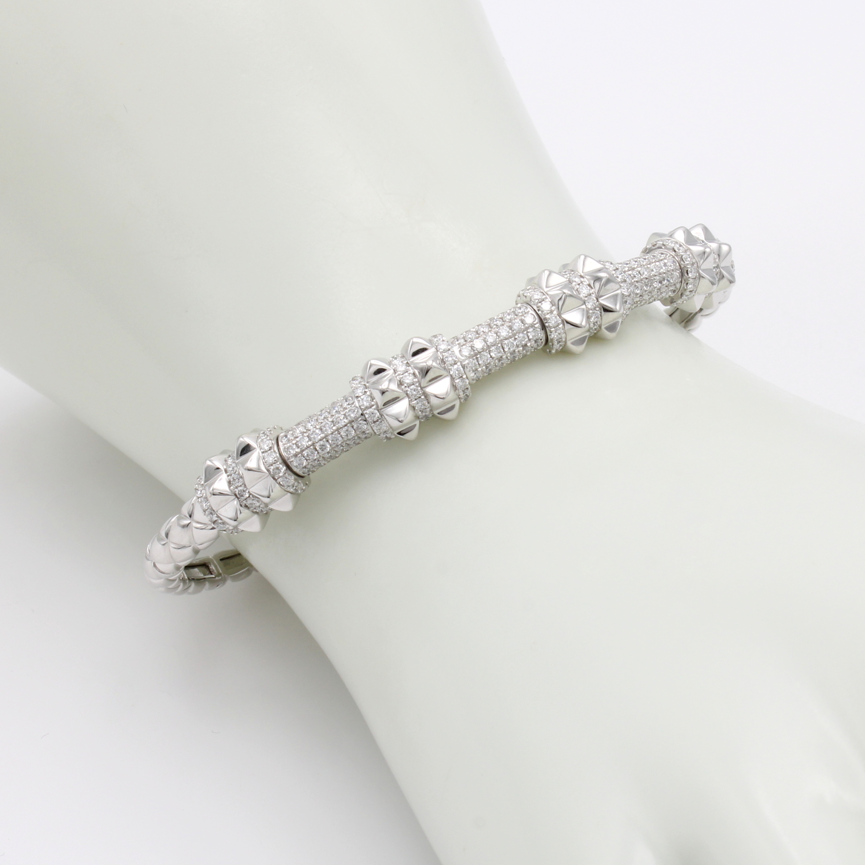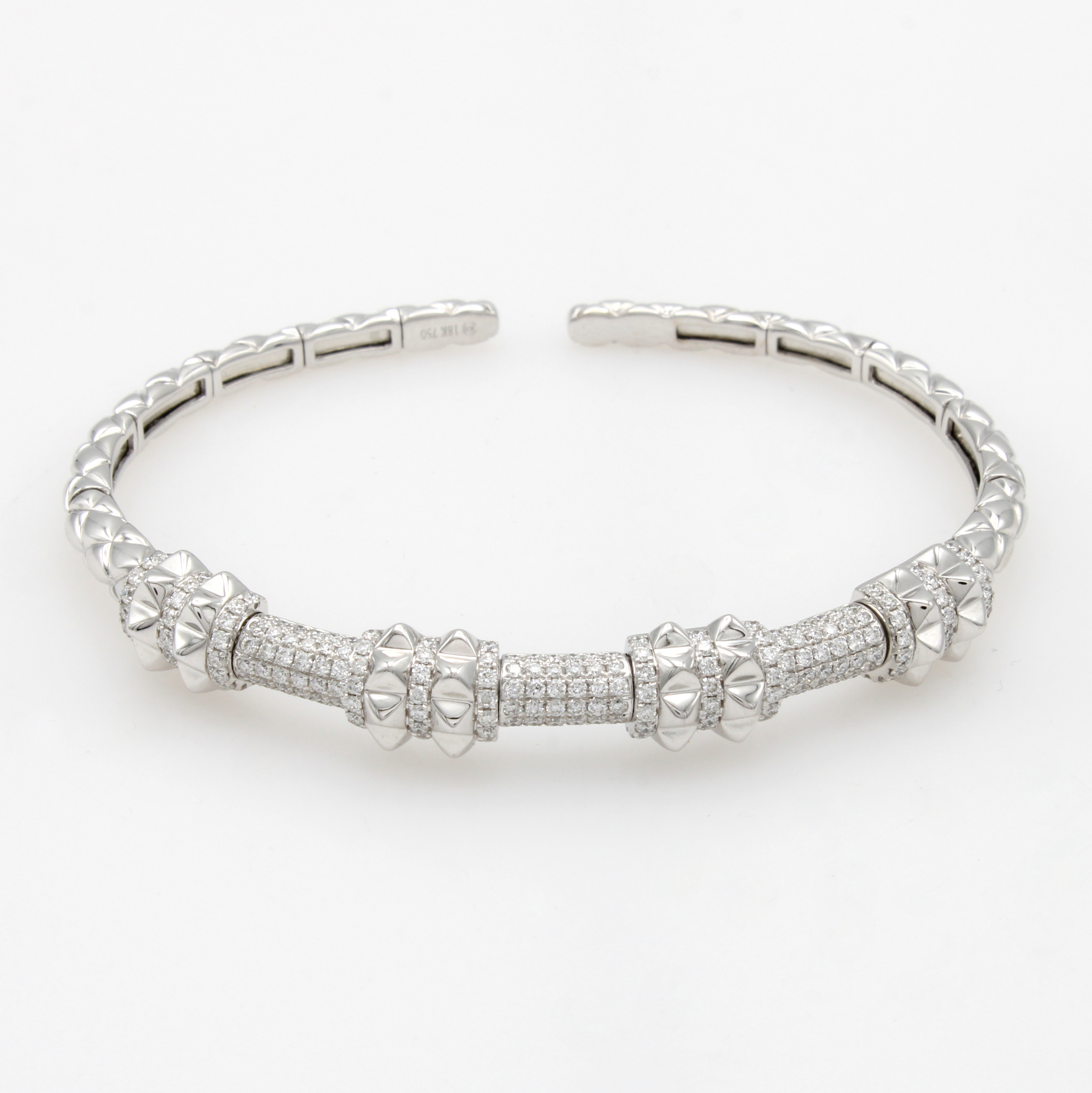 Armspange mit Brillanten, WG 750/000, gemusterte Oberfläche, pyramidenförm. Elemente, 234 Brill. zus. ca. 1.68 ct feines Weiß/si Schätzpreis: 7500, - EUR