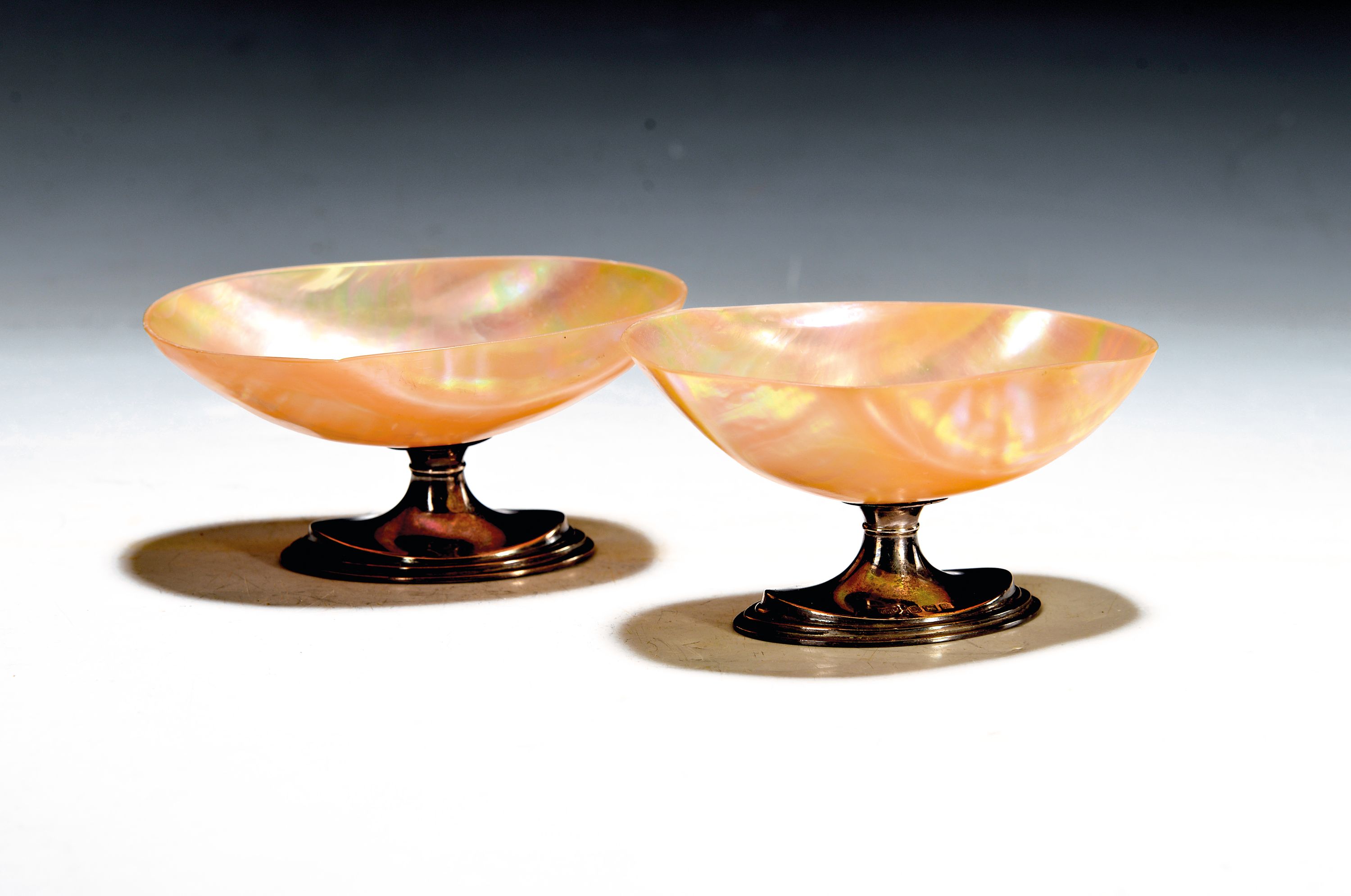 Zwei Fußschalen/Salieren mit Silberfuß, Sheffield, Anfang 20. Jh., Perlmuttschälchen,