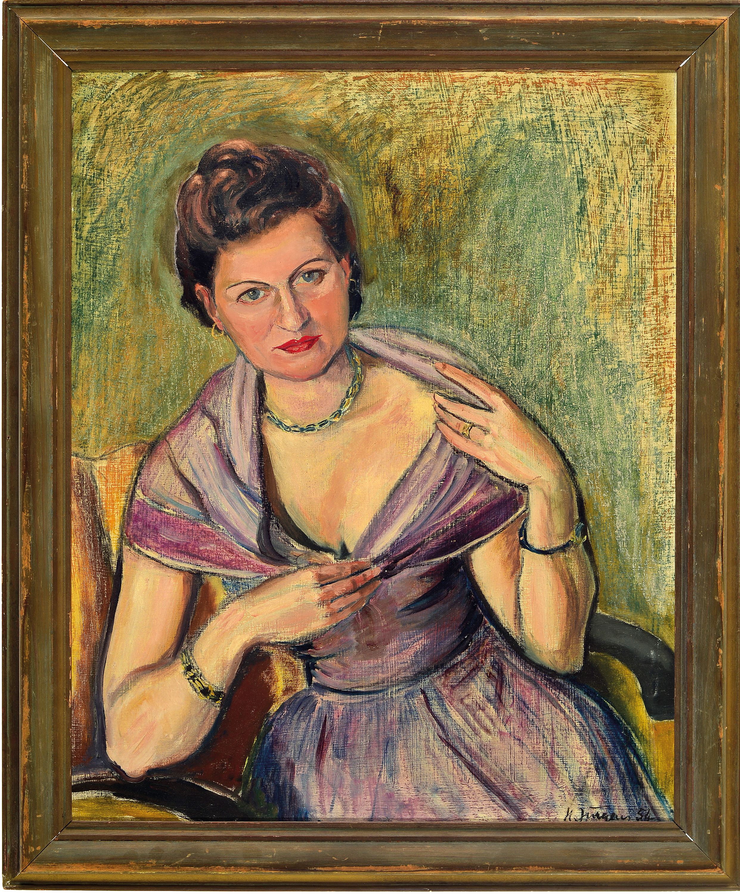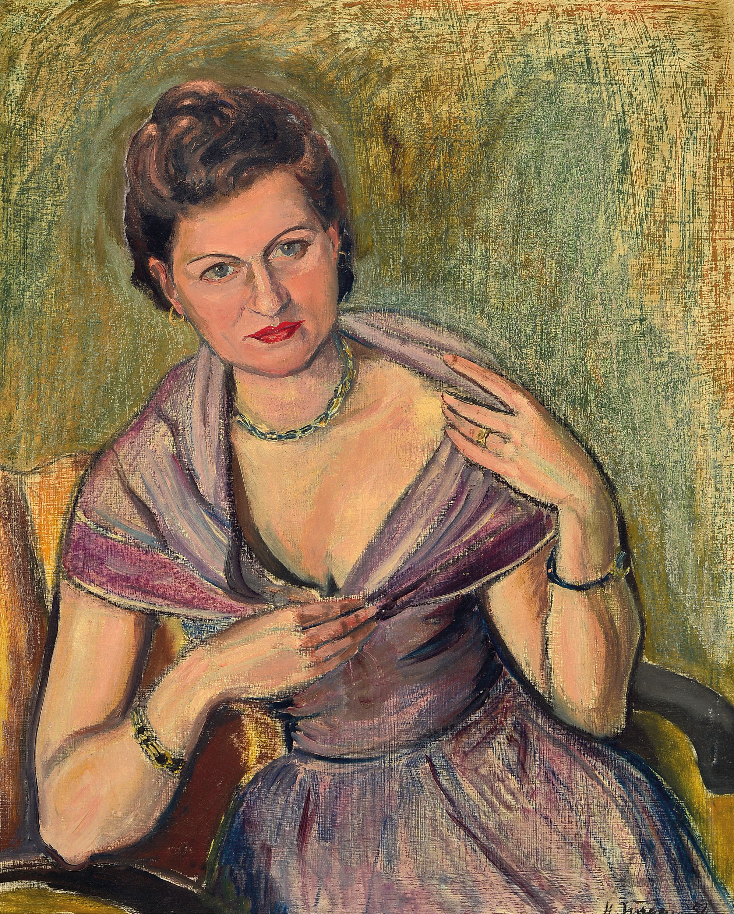 einer Frau mittleren Alters in violettem Abendkleid, signiert und datiert 1954, R.