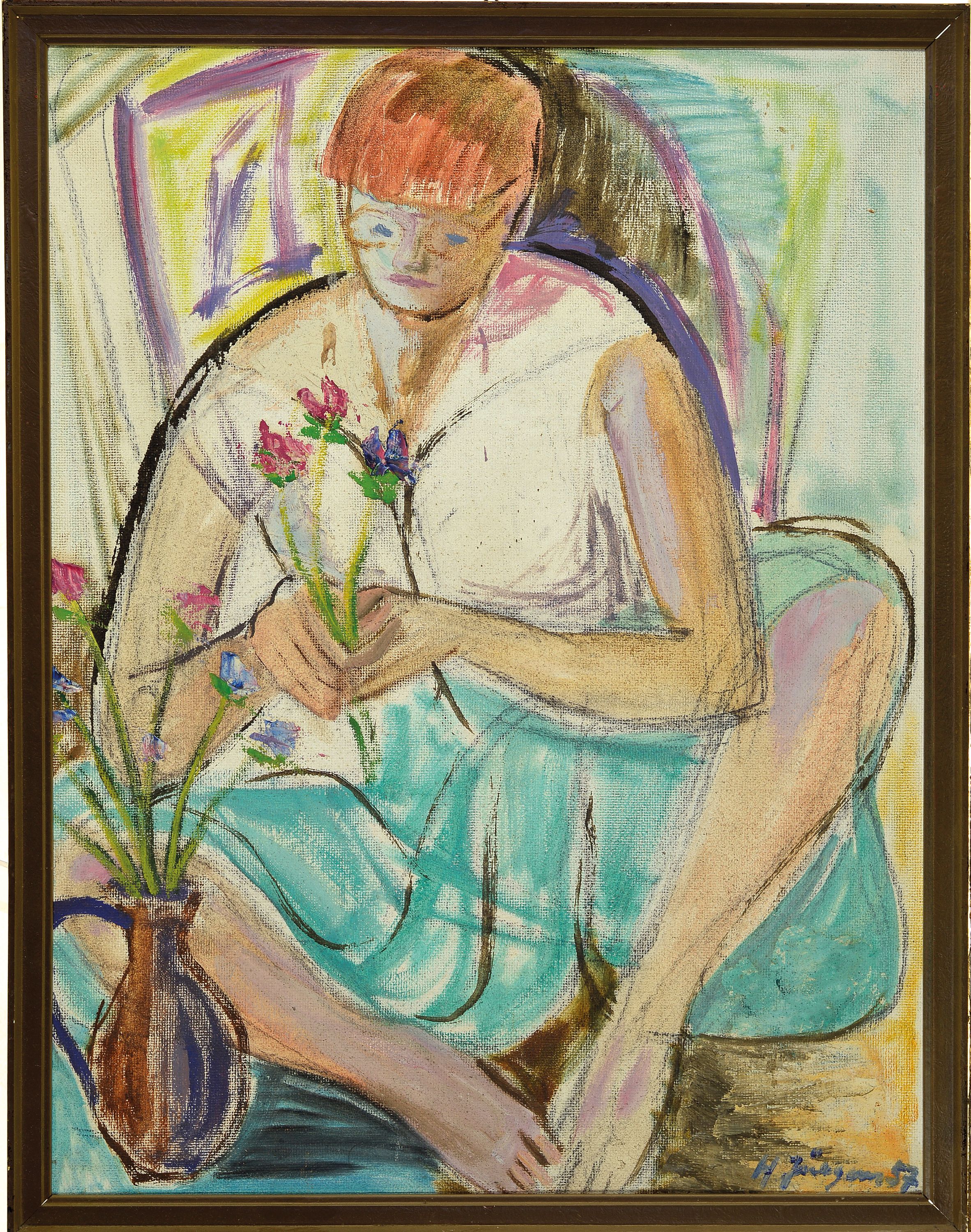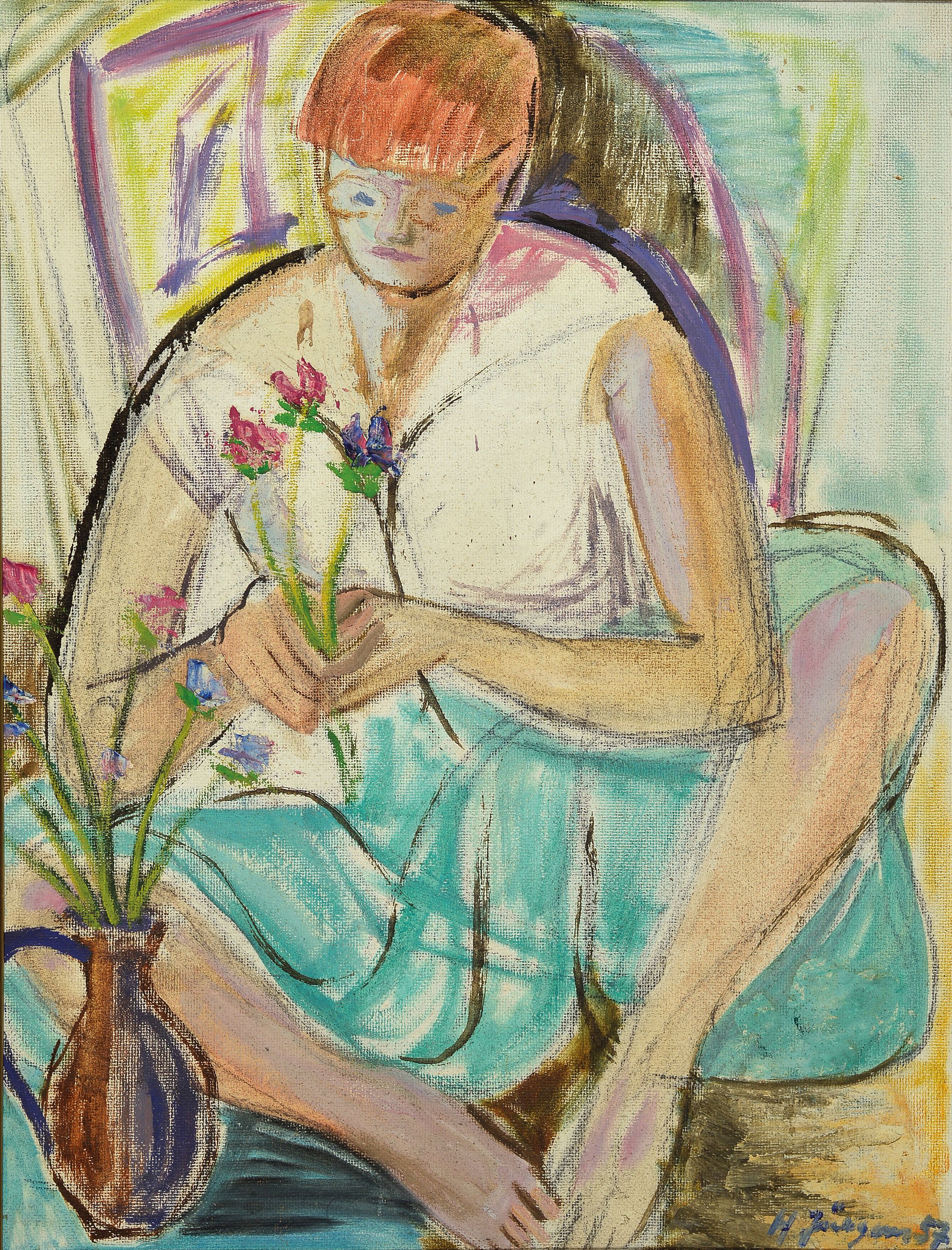 angelegte junge Frau beim Blumenbinden, signiert und datiert 1957, R. 70x54 cm; Bildnis