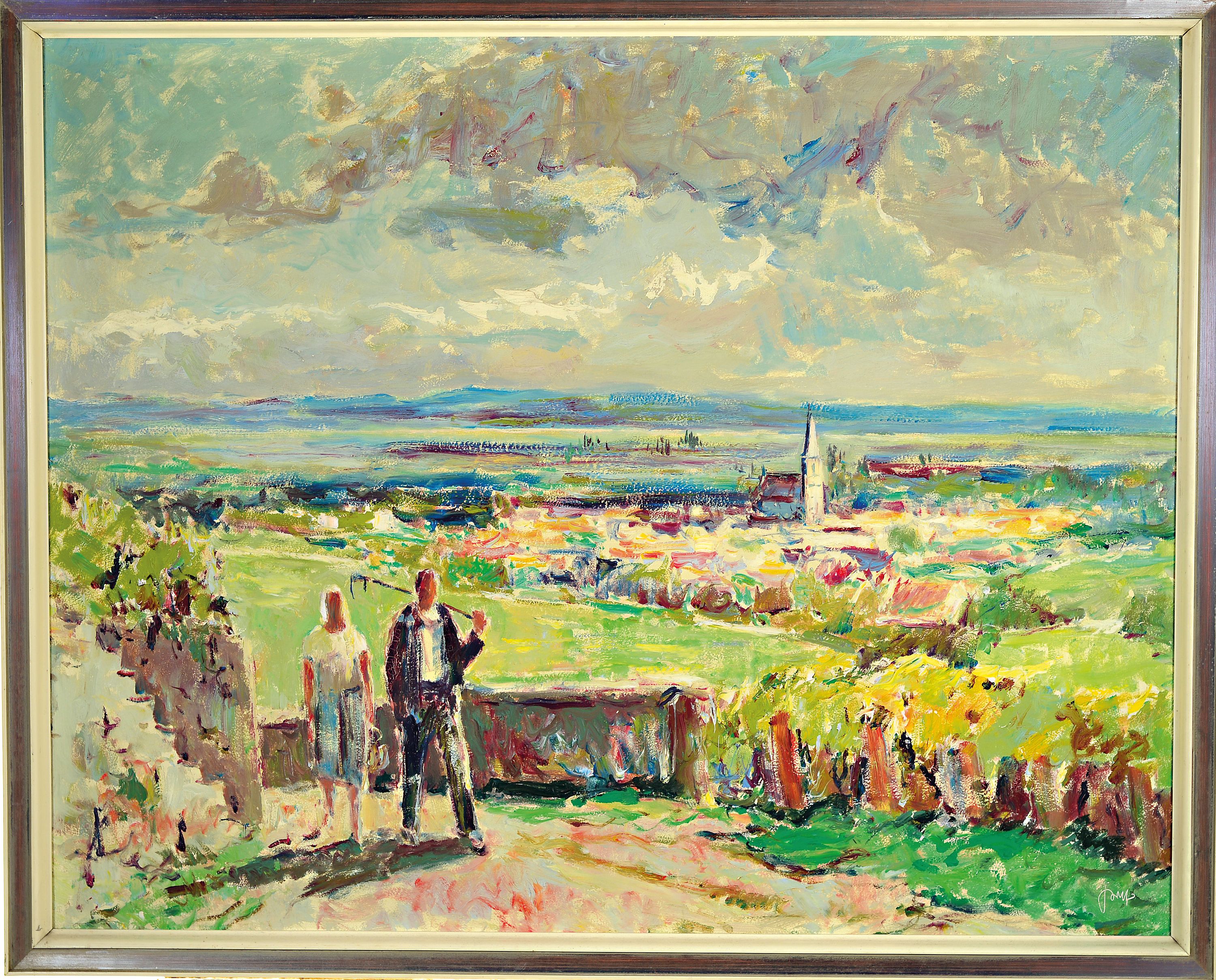 Roth unter Rietburg in die Rheinebene, Staffage von Winzerpaar, rechts unten signiert,