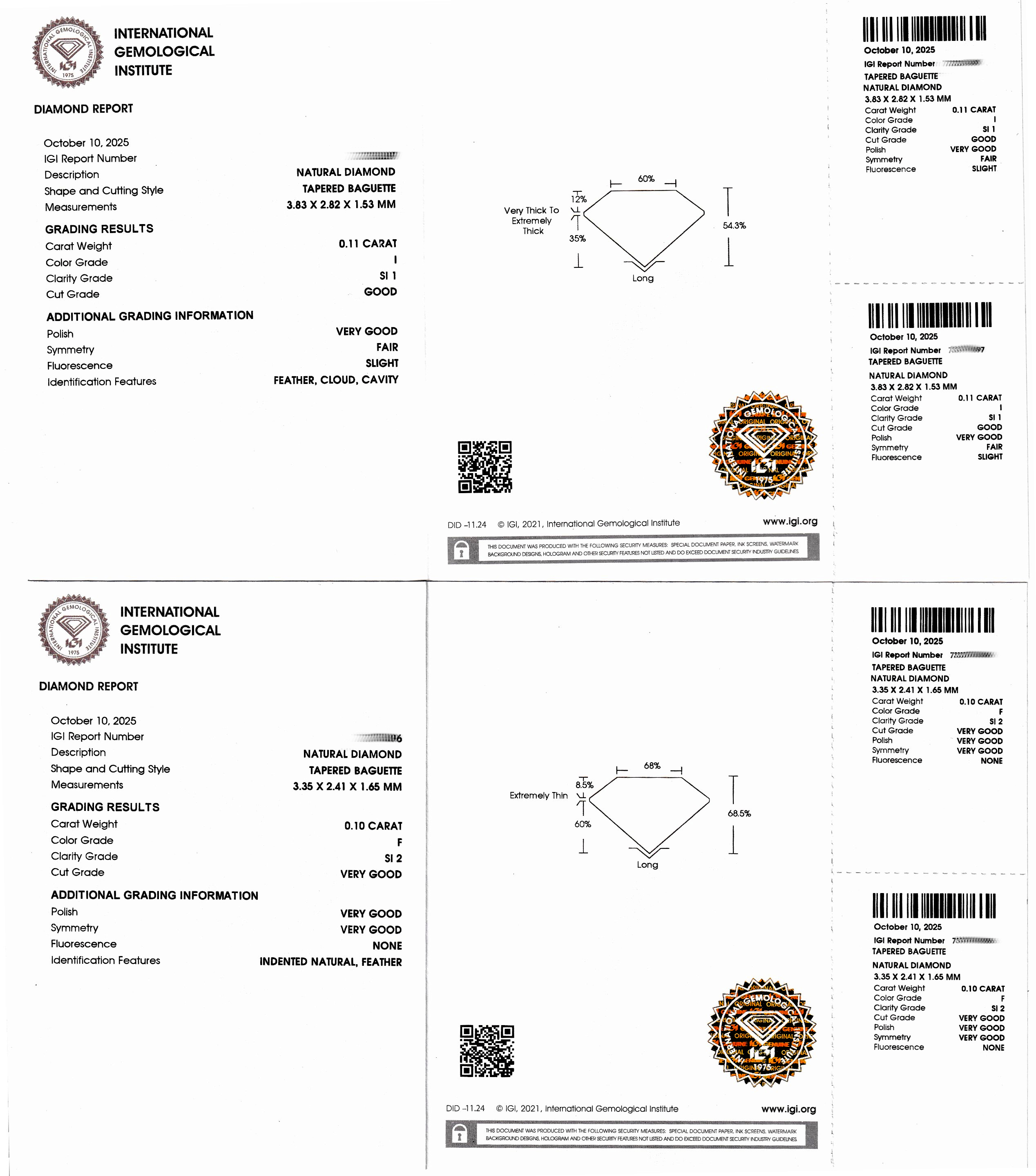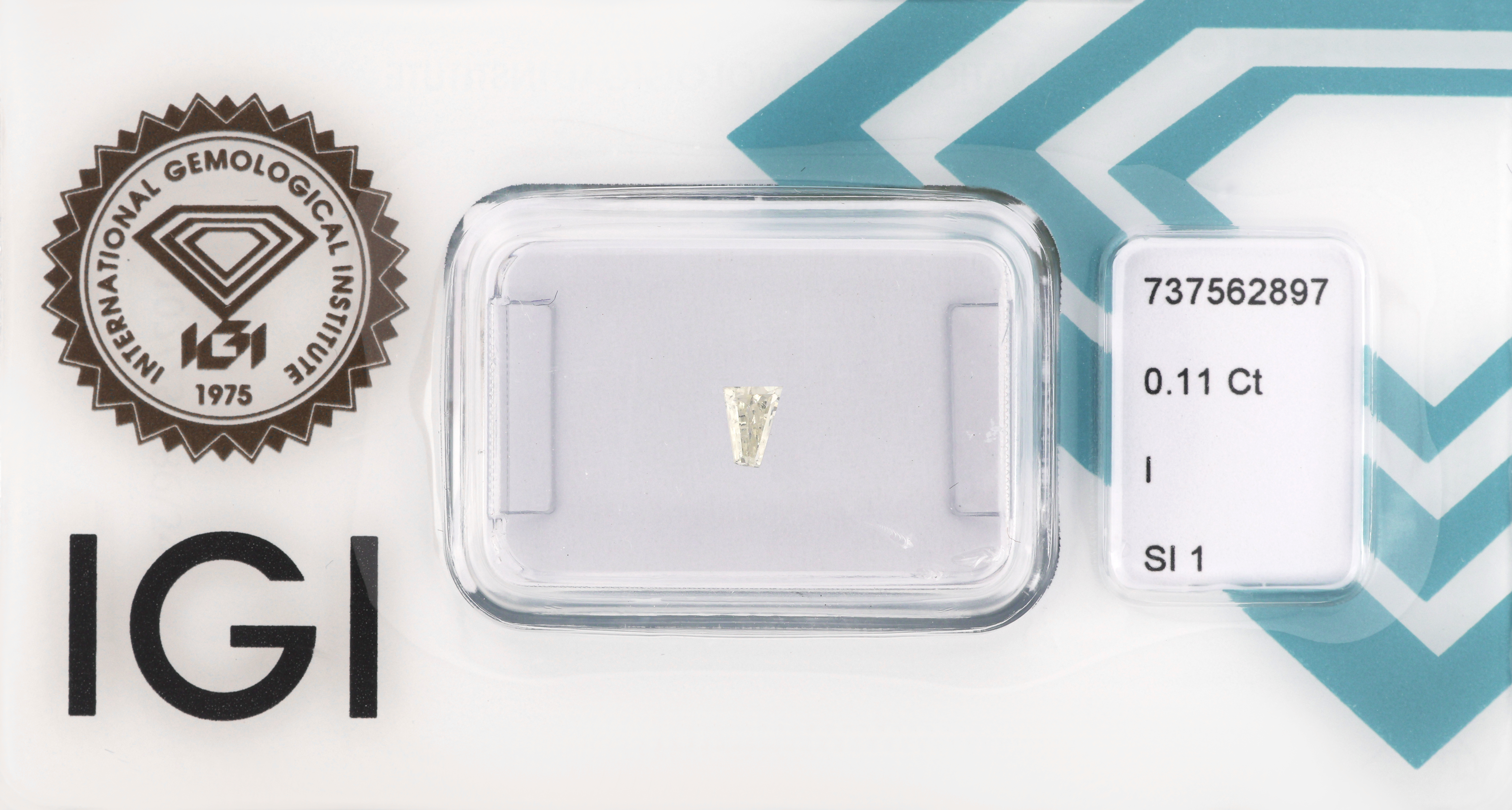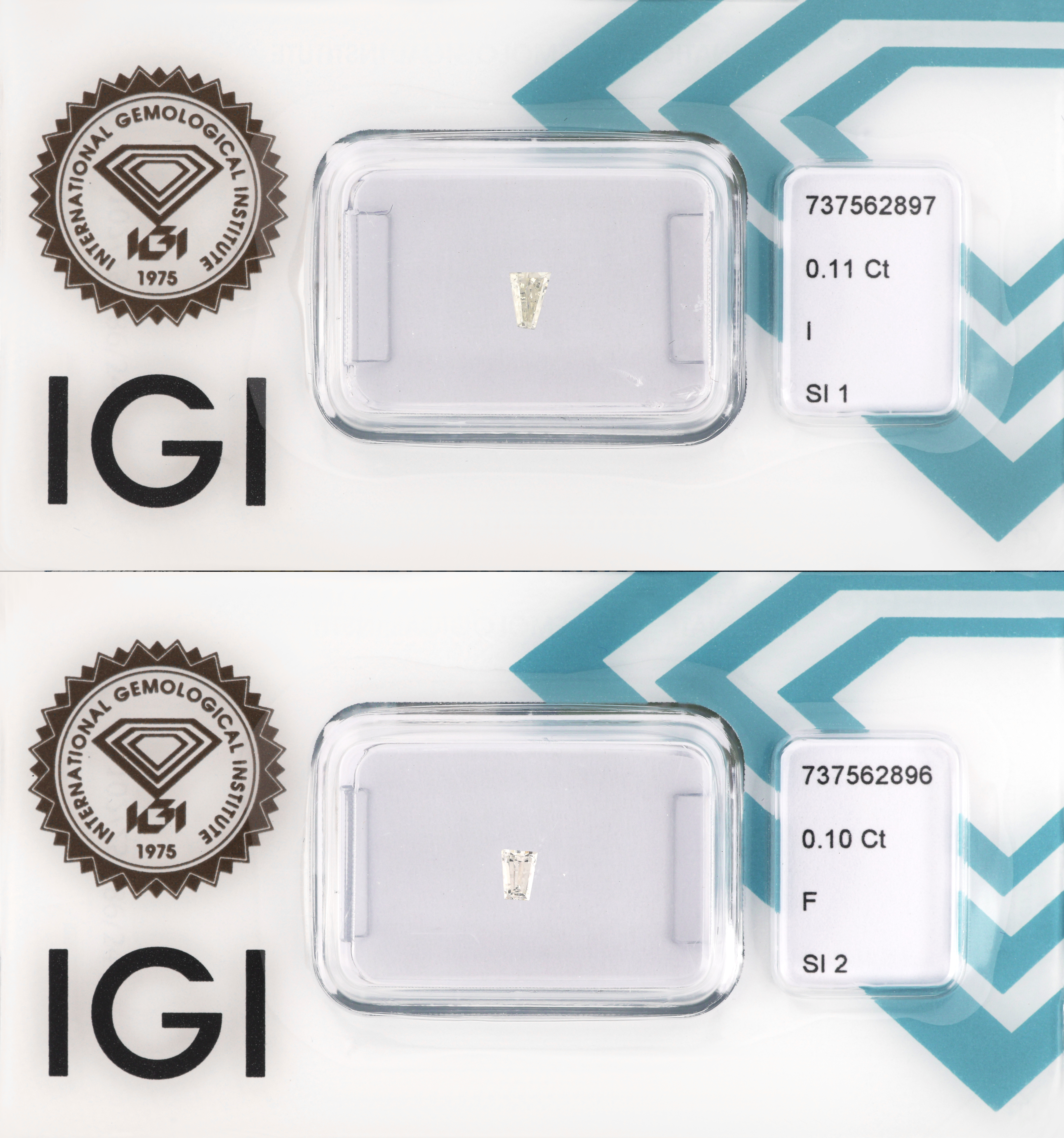 Lot 2 Diamant-Baguettes, 1 x 0.11 ct l.get.Weiß(I)/si1, 1 x 0.10 ct feines Weiß (F)/si2, jew. verschweißt, IGI-Expertisen