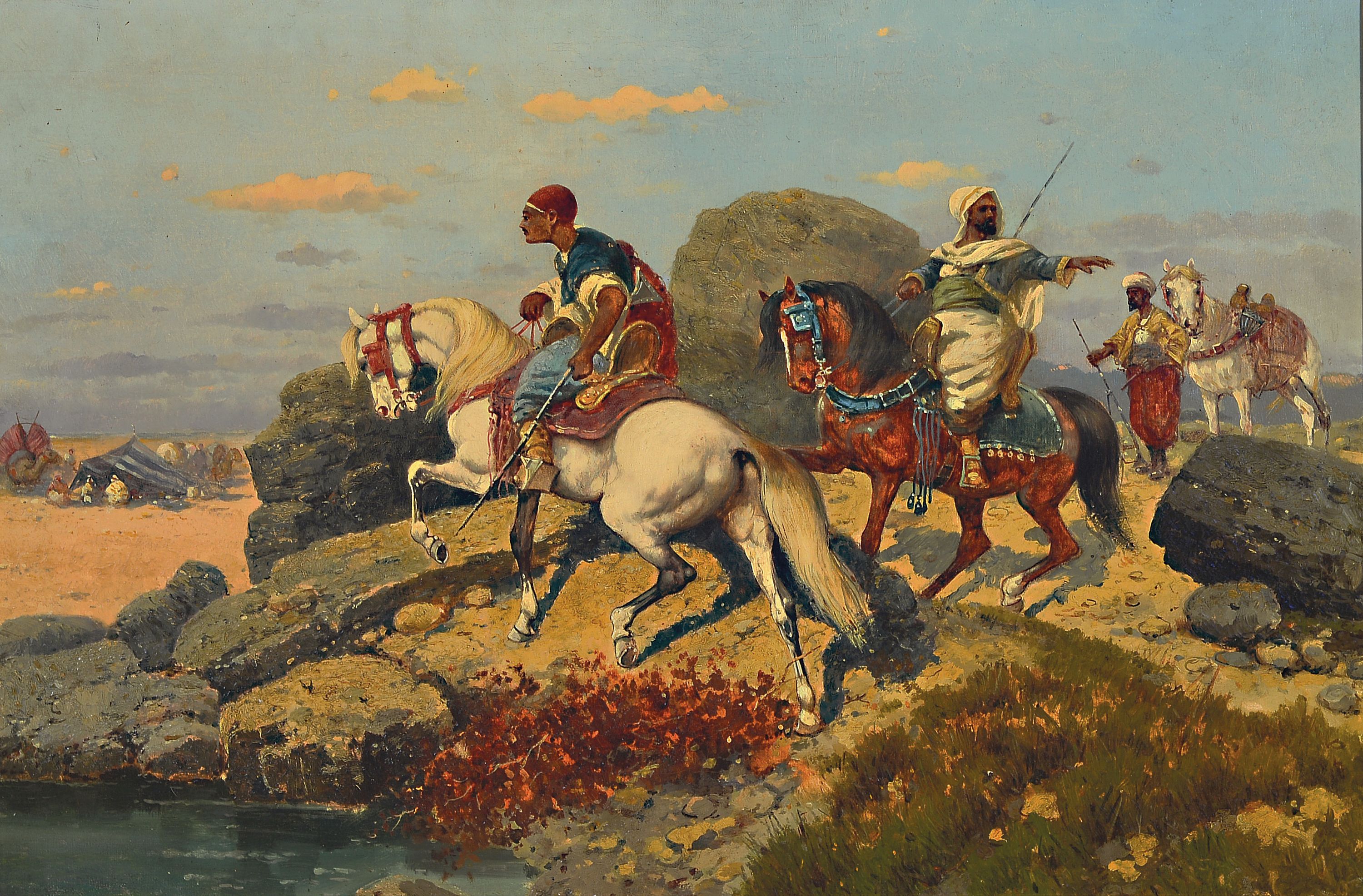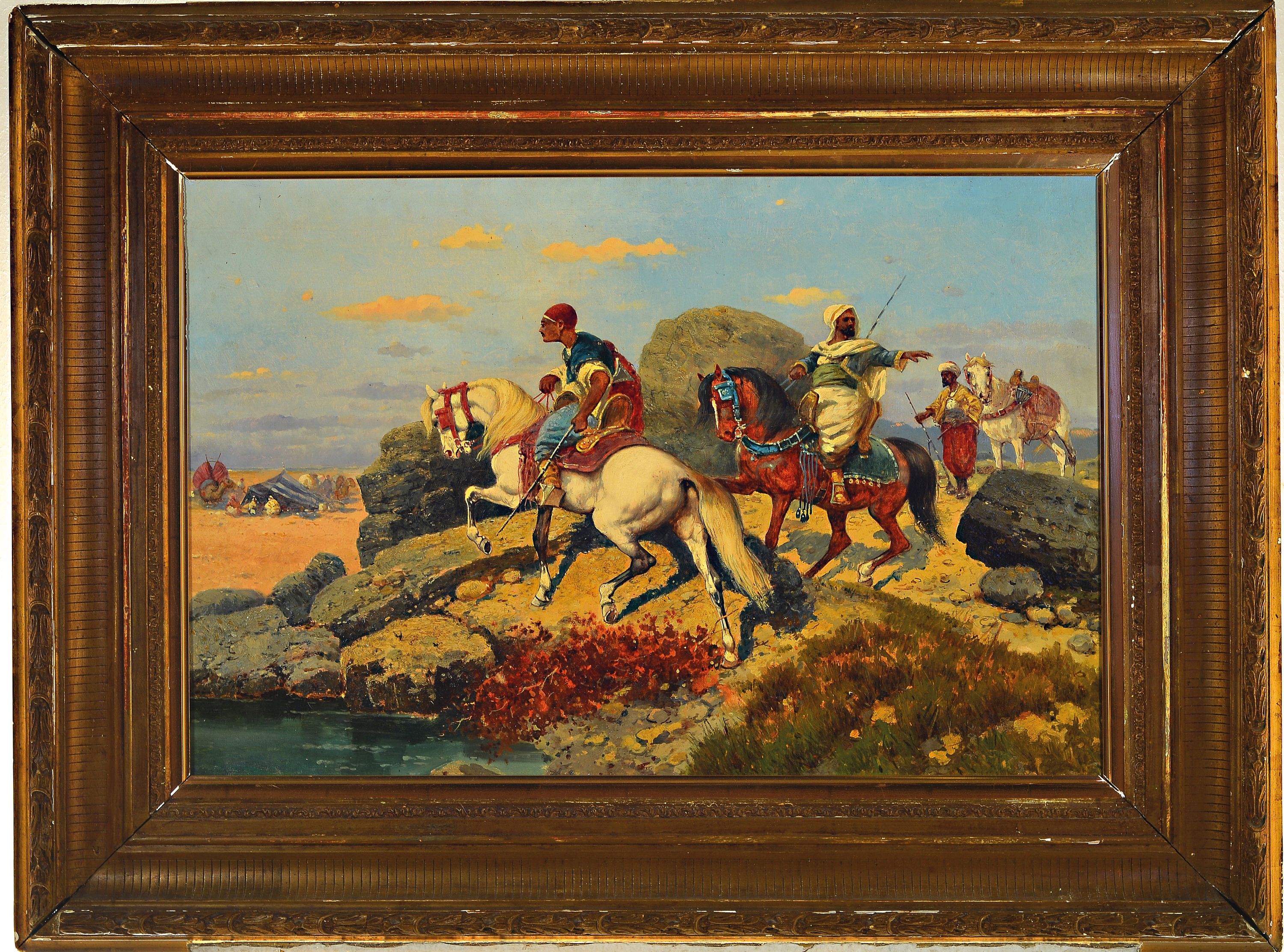 Unbekannter Maler, wohl französisch, um 1870, Beduinen Reiter an einer Oase, Öl/Lwd,