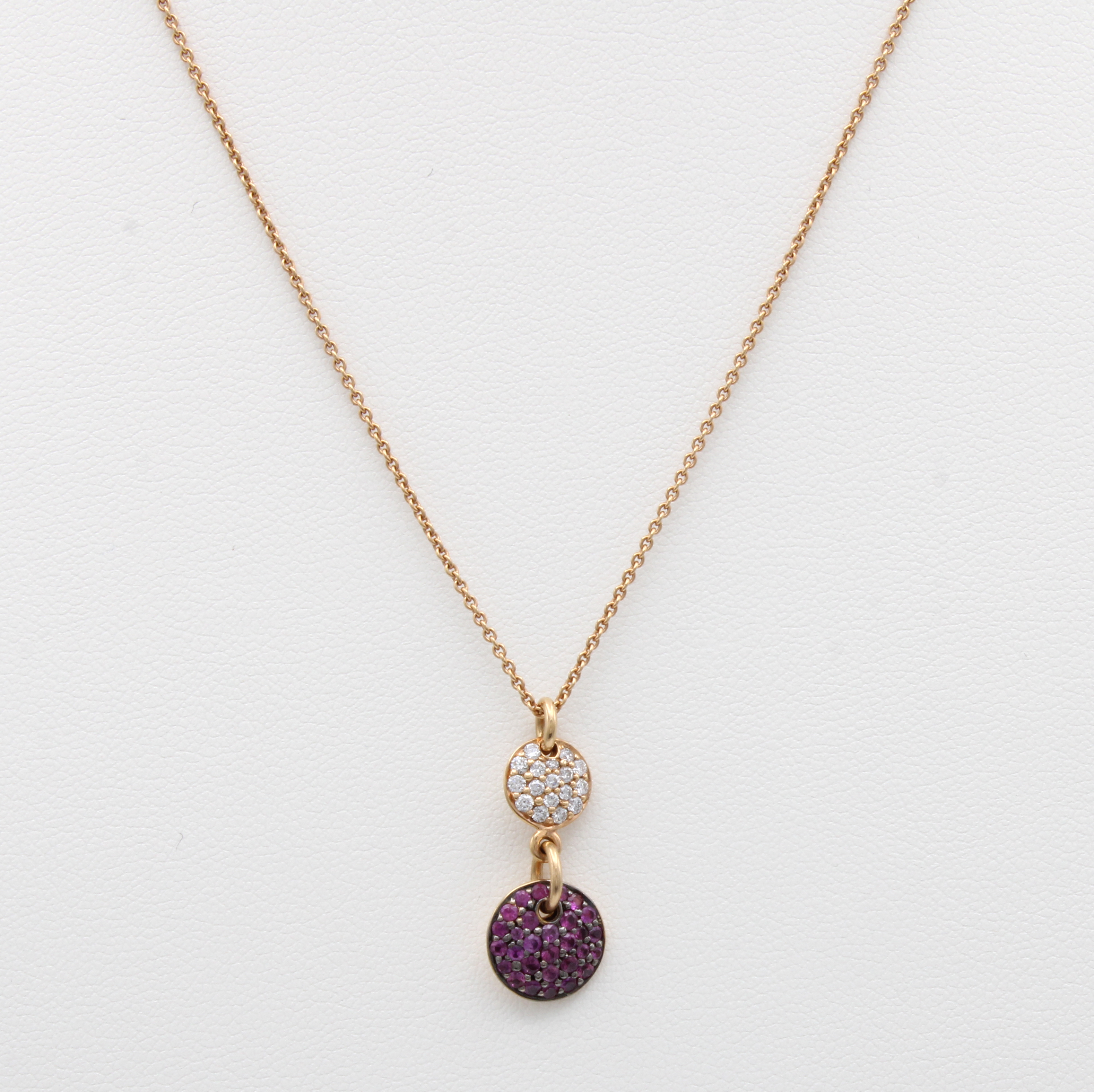 Anhänger mit Brillanten und Saphiren, RG 750/000, Brill. zus. ca. 0.20 ct Weiß/si, pinkf. Saphire zus. ca. 0.45 ct, L. ca. 43 cm Schätzpreis: 2950, - EUR