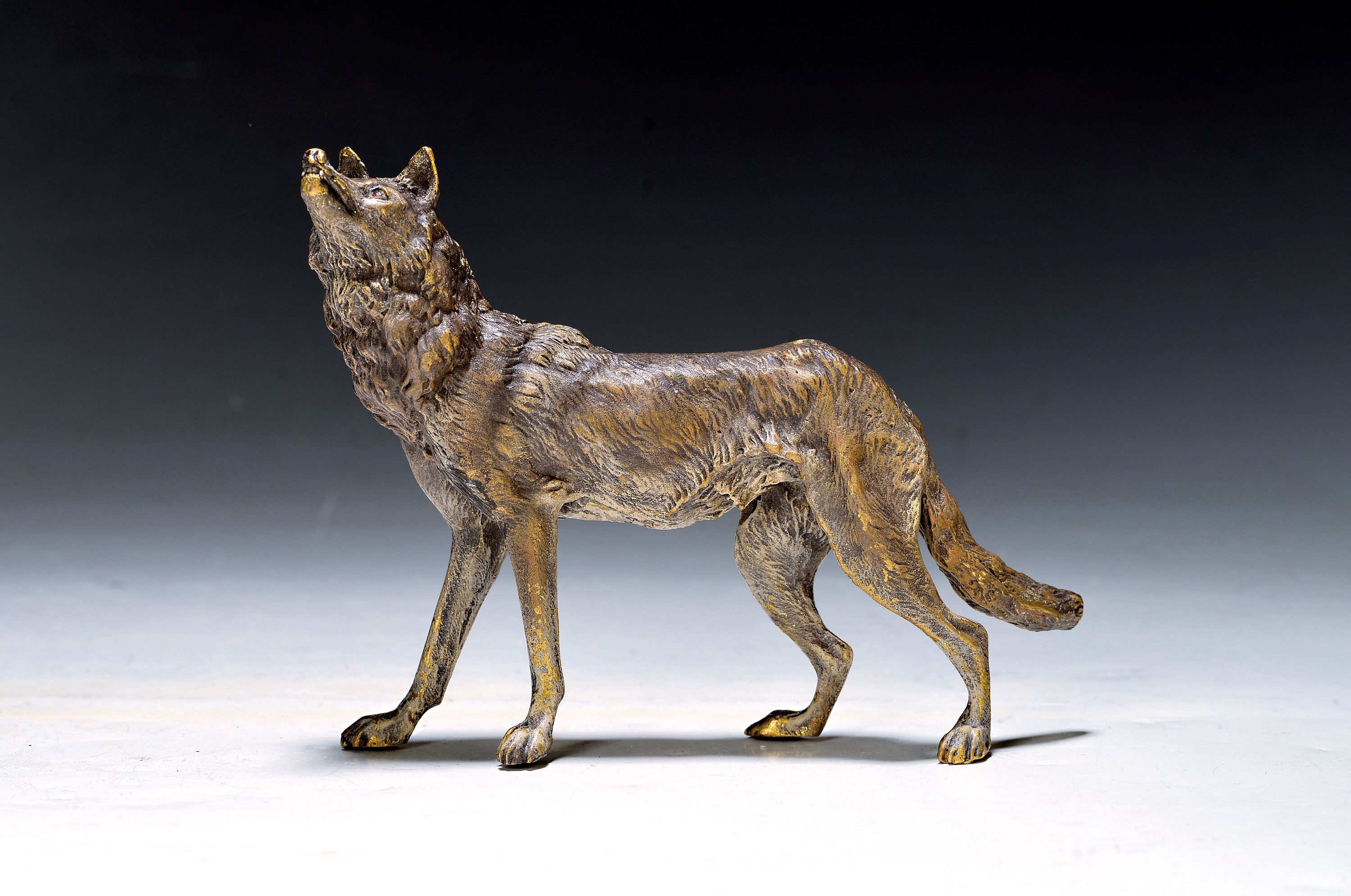 Großer Wolf, Wiener Bronze, signiert Bergmann, 20.Jh., Bronze, farbig staffiert,