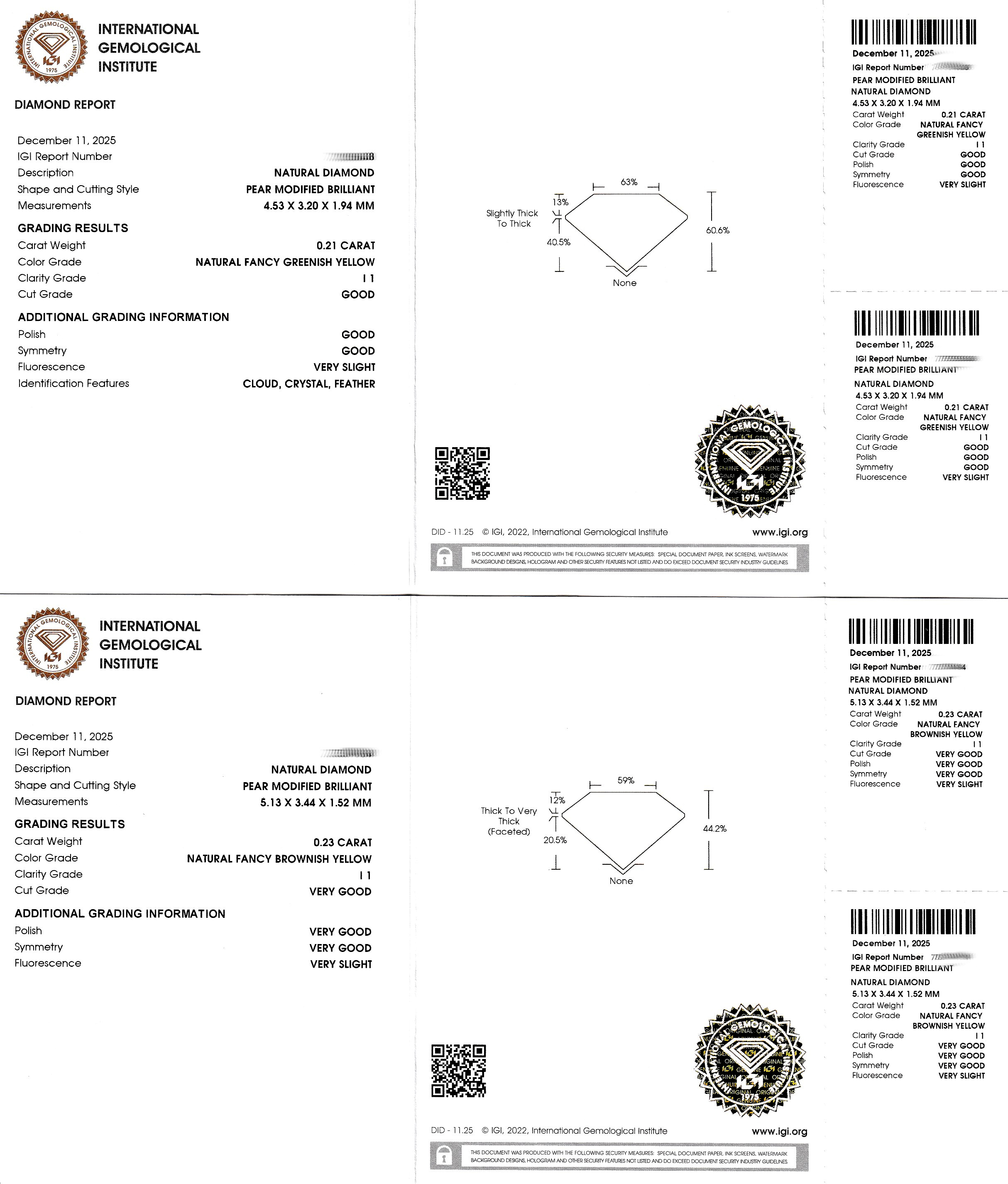 Lot 2 lose Diamanten, Pear modified Brilliant,1 x 0.23 ct Natural Fancy Brownish Yellow/p1, 1 x Natural Fancy Greenish Yellow/p1, verschweißt, IGI-Expertisen