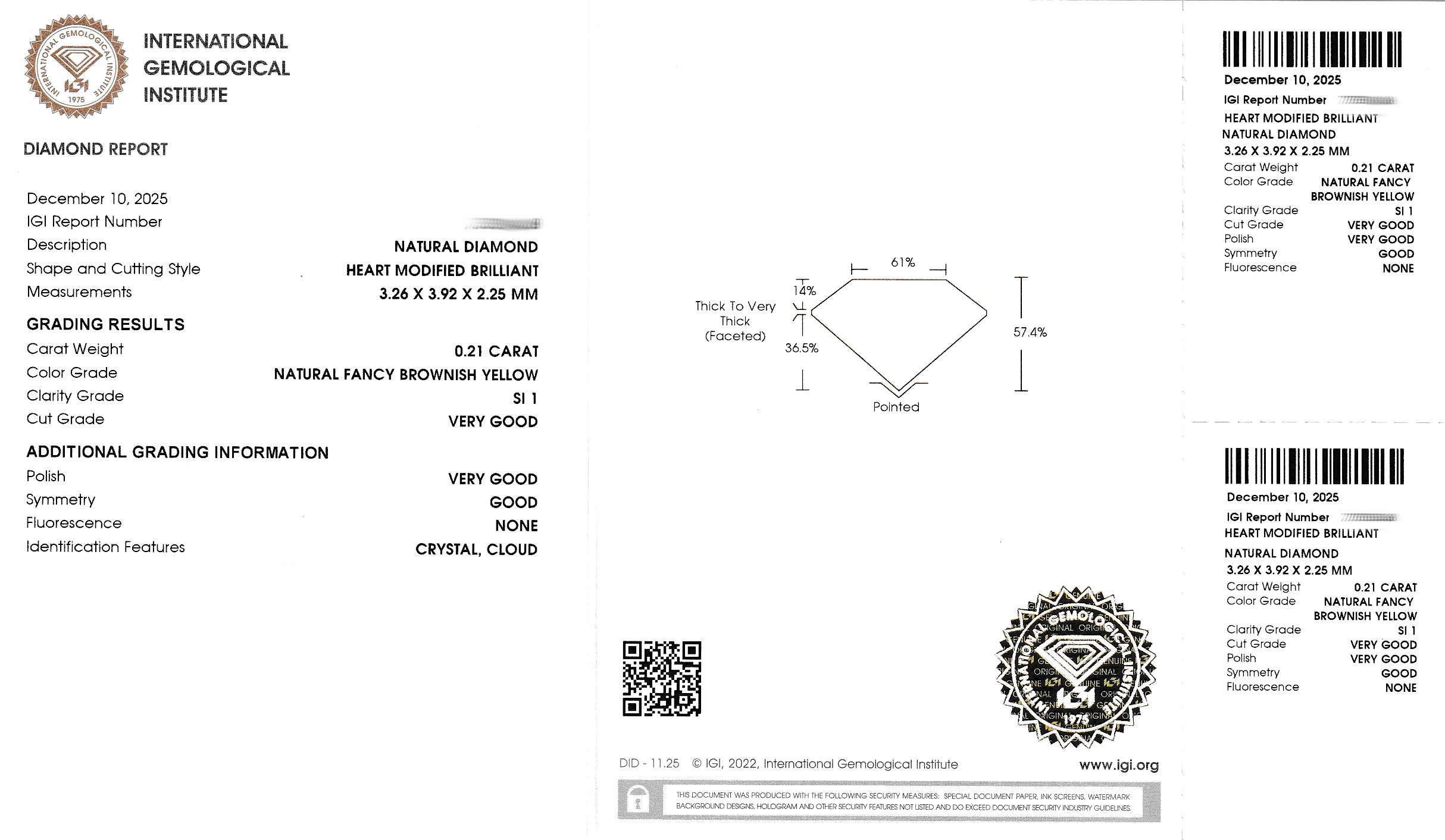 Loose diamond-heart , 0.21 ct natural fancy brownish yellow/si1, sealed, IGI expertise