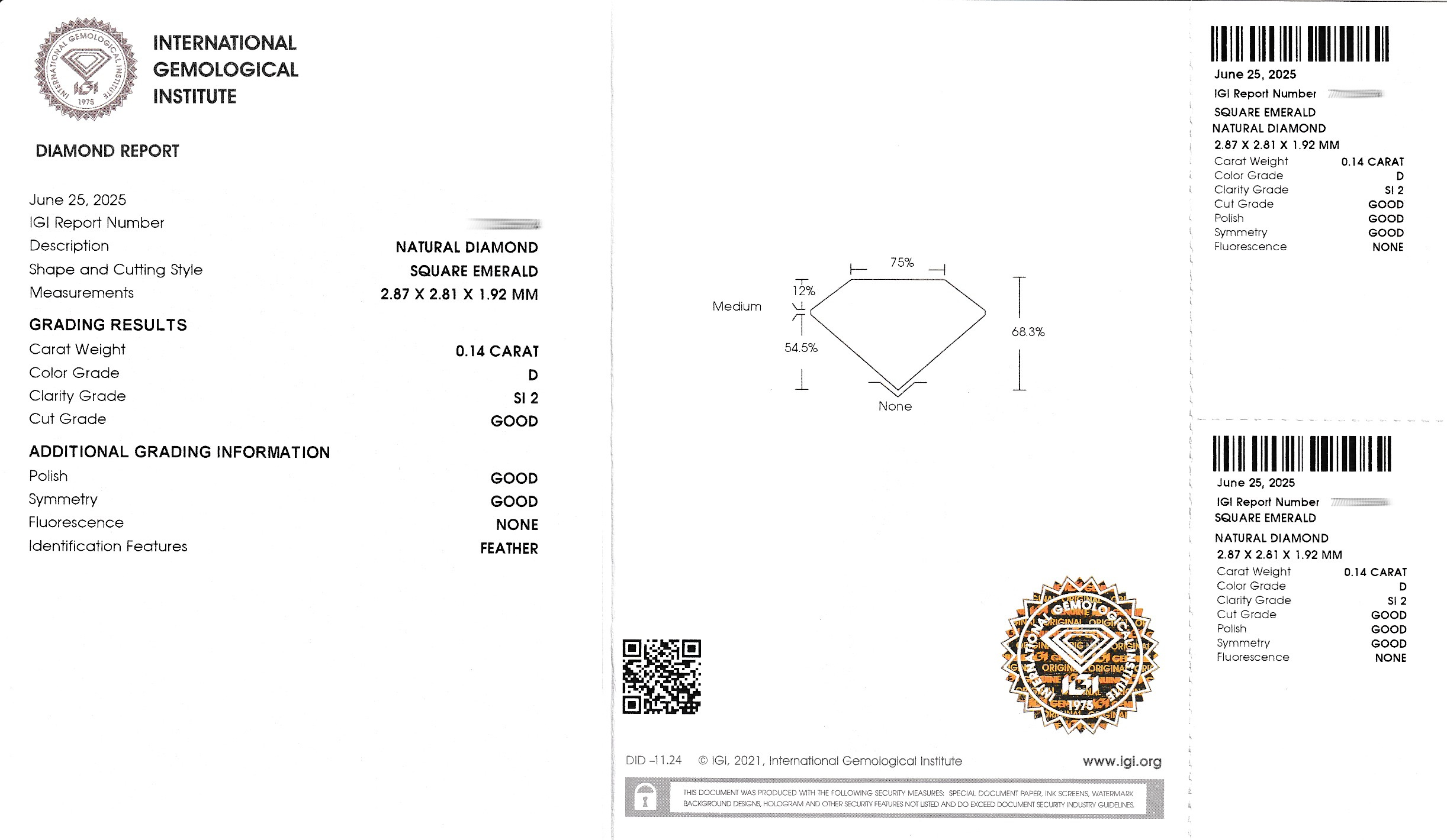 Loser Diamant 0.14 ct hochfeines Weiß(D)/si2, Square Emerald, verschweißt, IGI-Expertise