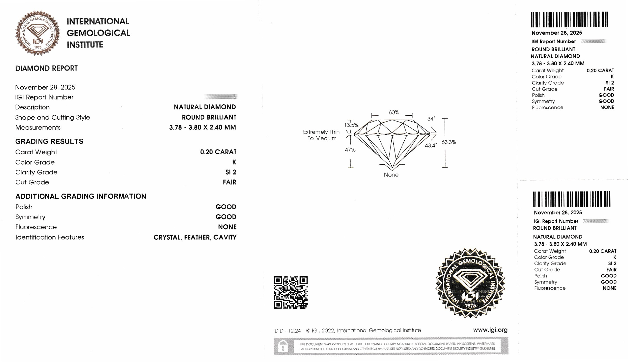 Loser Brillant 0.20 ct get.Weiß(K)/si2, verschweißt, IGI Expertise