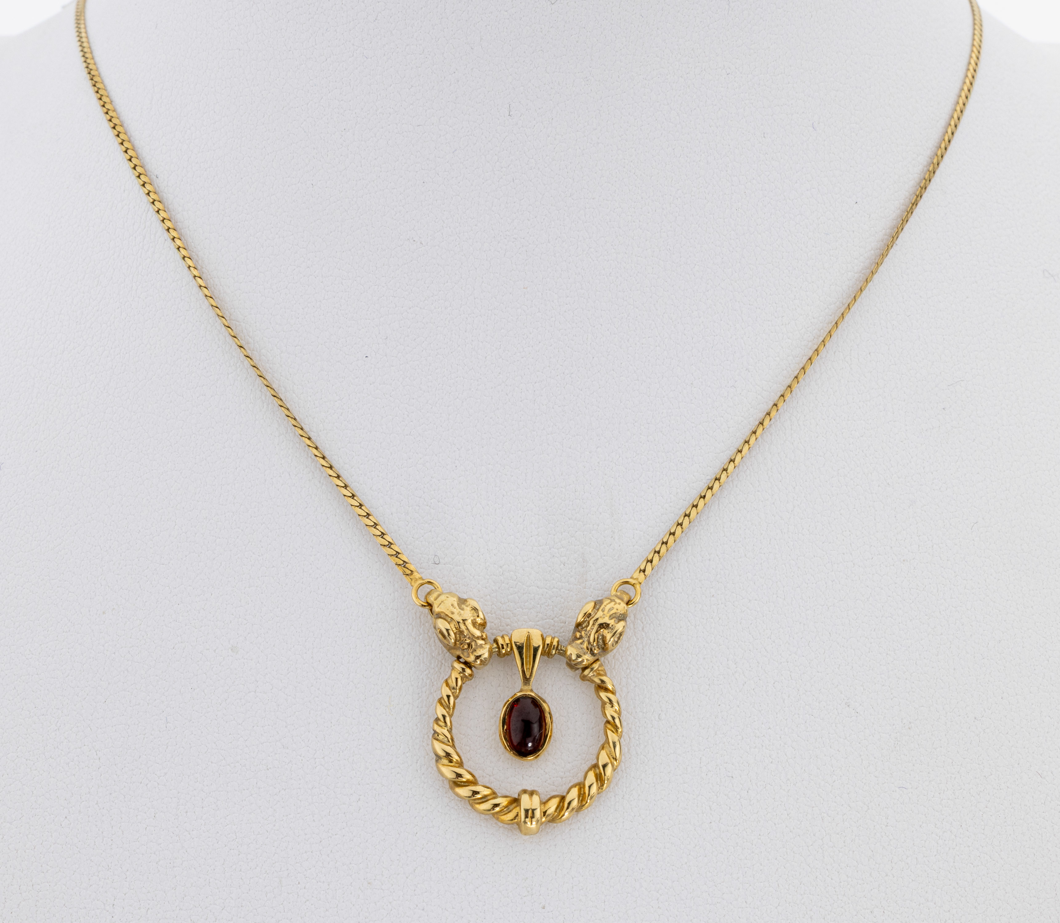 14 kt Gold Granat Collier, GG 585/000, kreisförm. Mittelteil gekordelt, ovaler Granatcabochon