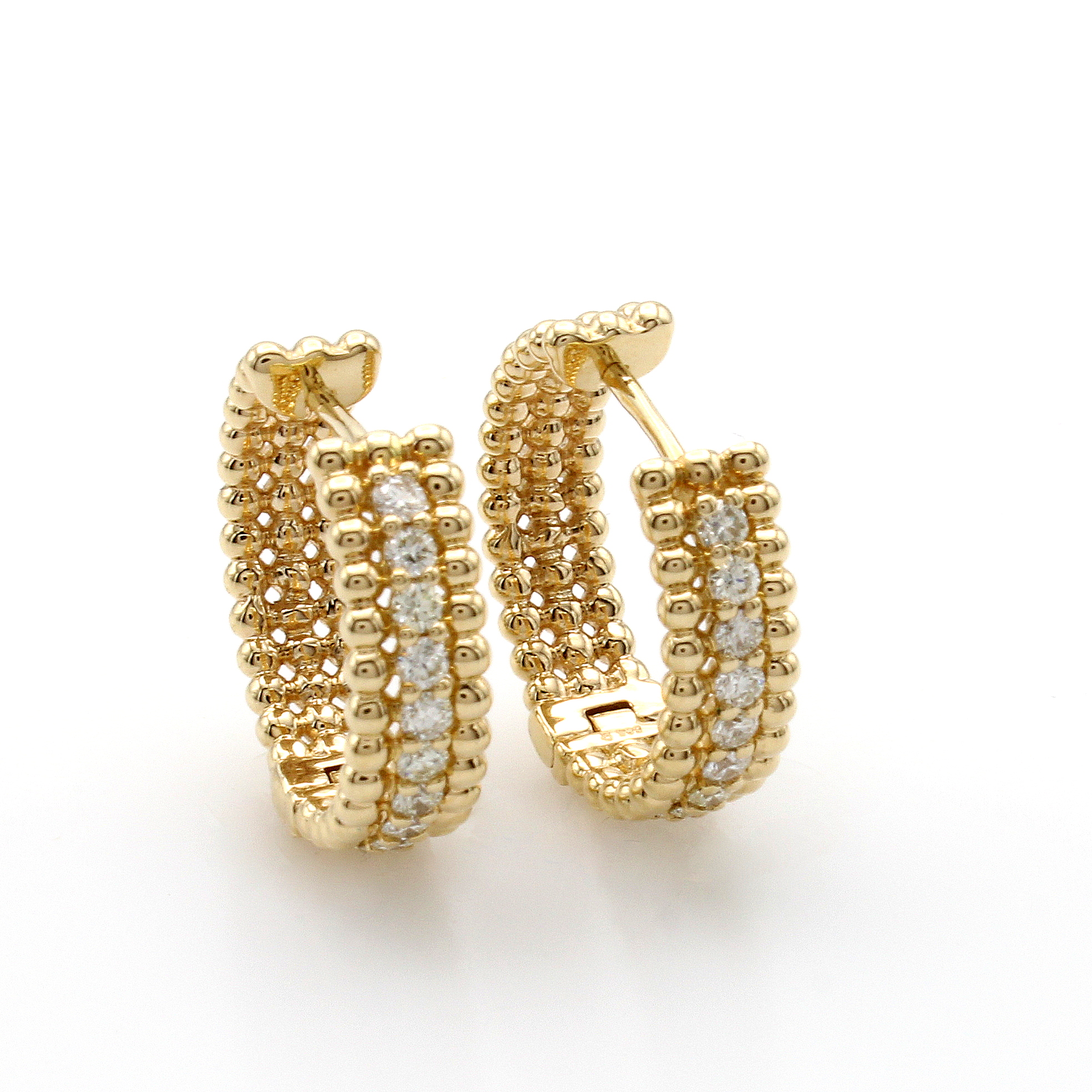 Paar Klappcreolen mit Brillanten, GG 585/000, 3-rhg. Optik m. Goldkügelchen, Brill. mittig gef. zus. ca. 0.50 ct get.Weiß/lupenr., Innend. ca. 15 mm Schätzpreis: 3450, - EUR