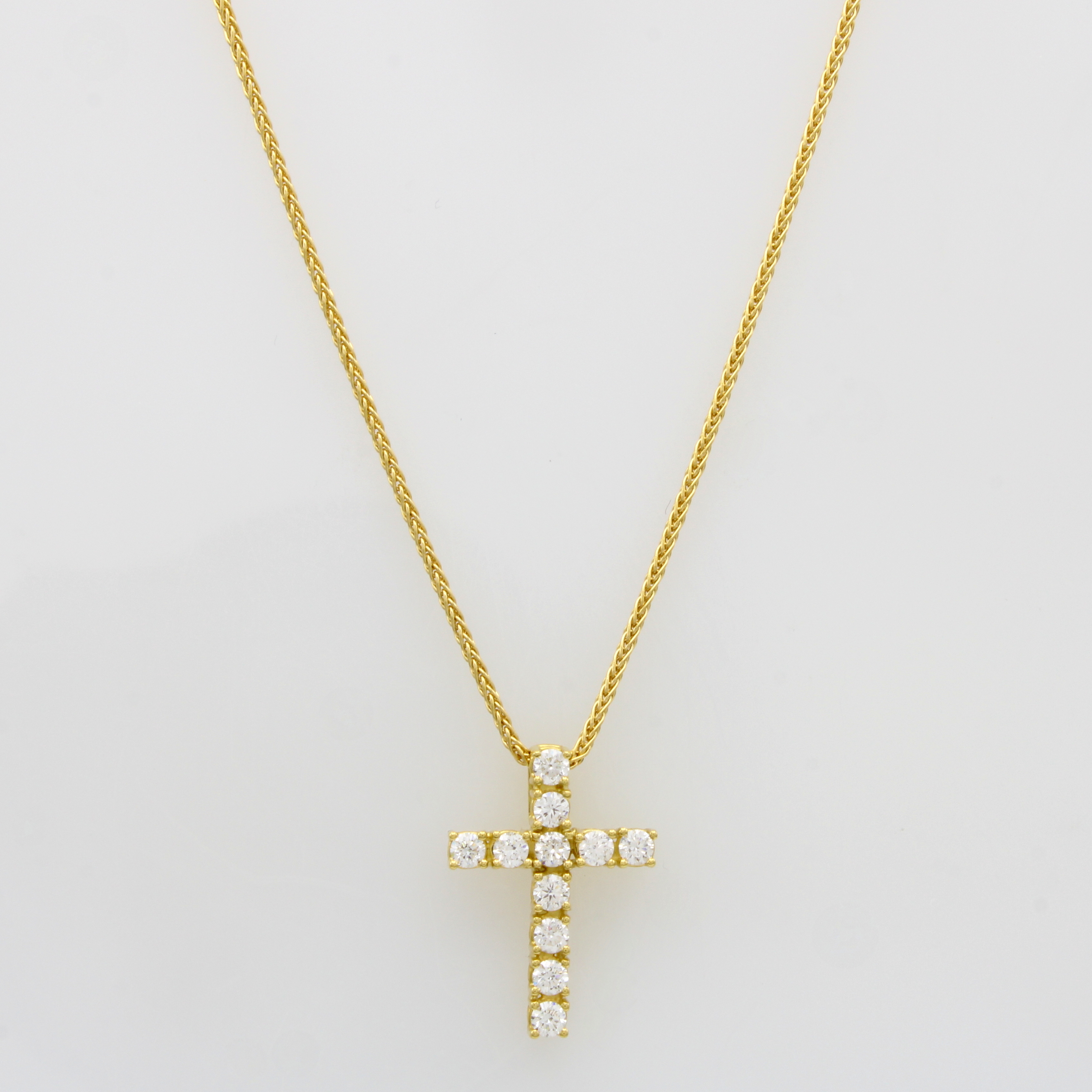Kreuzanhänger mit Brillanten an Kette, GG 750/000, 11 Brill. in Krappenfassungen zus. ca. 0.50 ct Weiß/si, in L. ca. 43 u. 45 cm tragbar Schätzpreis: 2650, - EUR