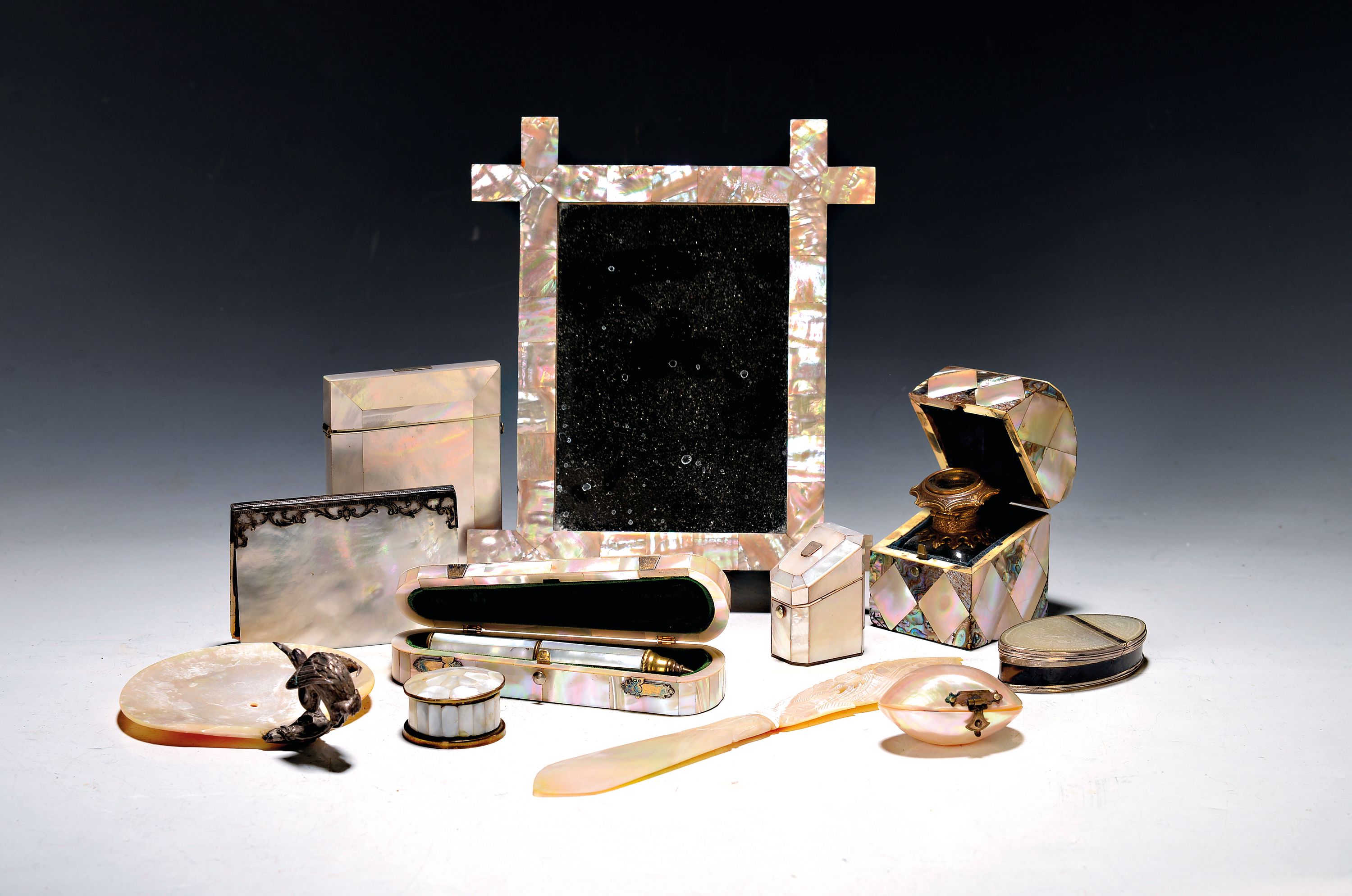 Kleine Perlmuttsammlung aus 18 Teilen, u.a. Schale mit Kranich, Spiegel, Visitenkartenetui