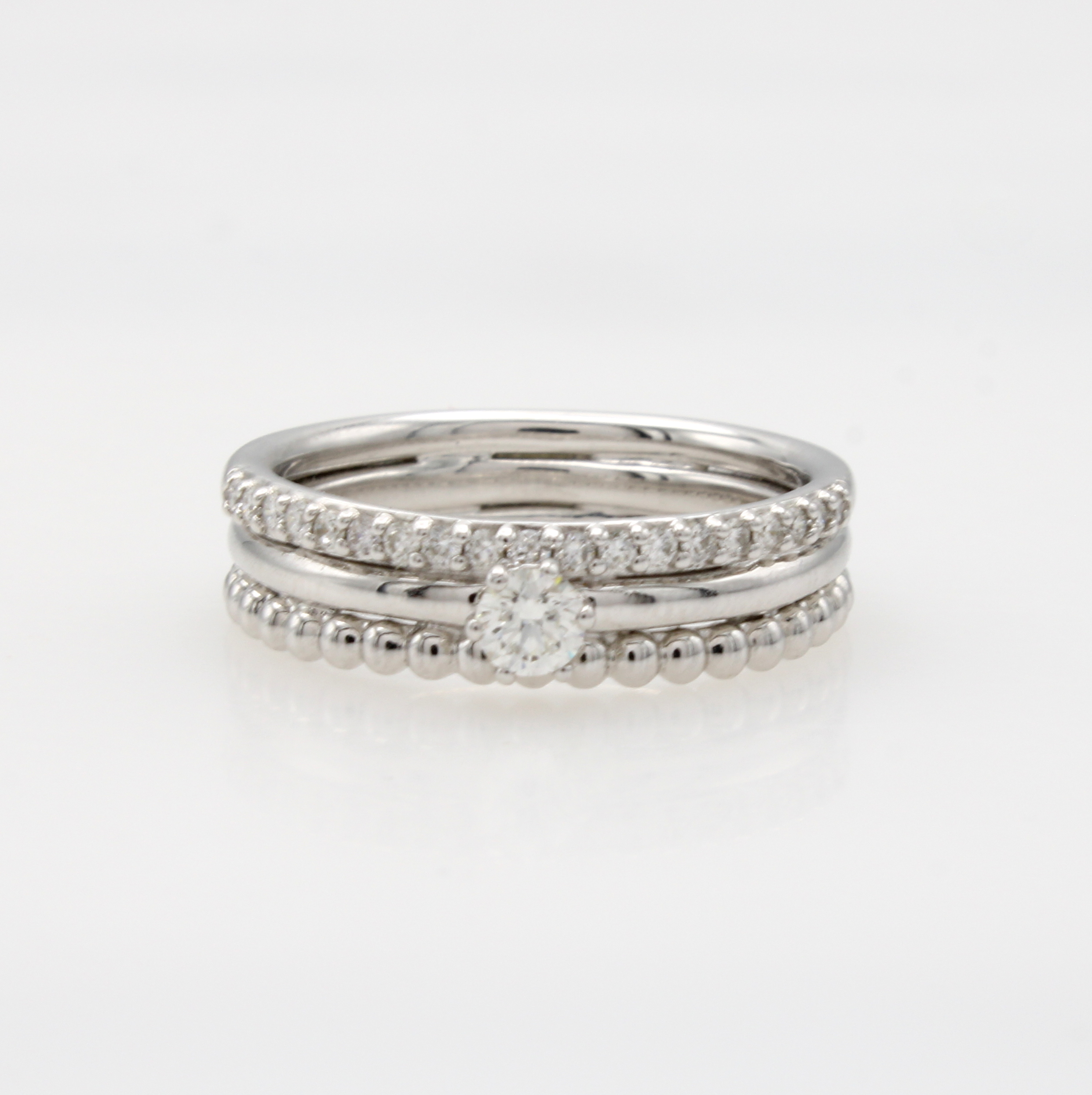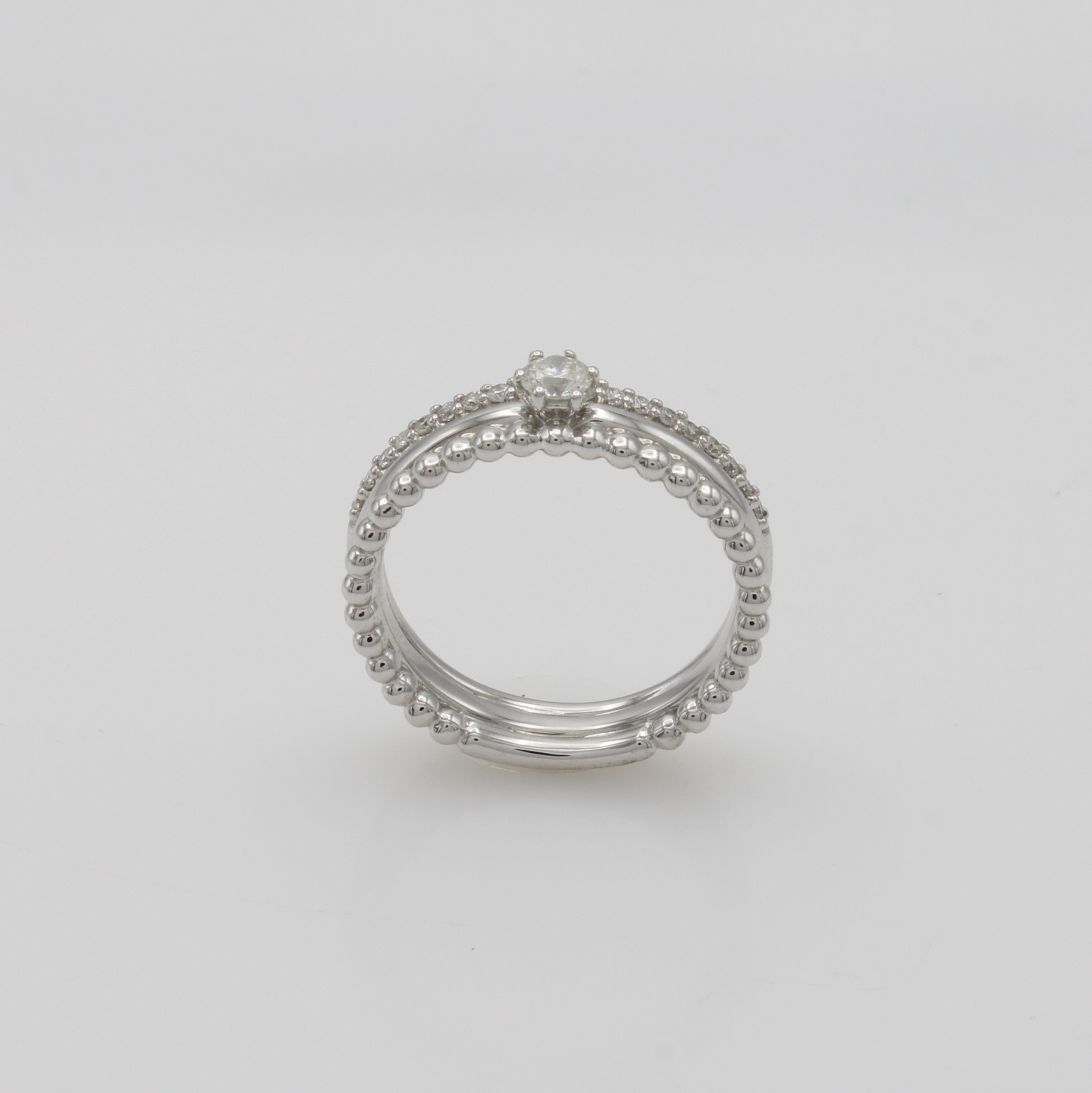 Ring mit Brillanten, WG 585/000, 3-rhg. Optik, 1 Reihe m. Goldkügelchen, Solitär u. Besatzbrill. zus. ca. 0.30 ct Weiß/si, RW ca. 52 Schätzpreis: 2530, - EUR