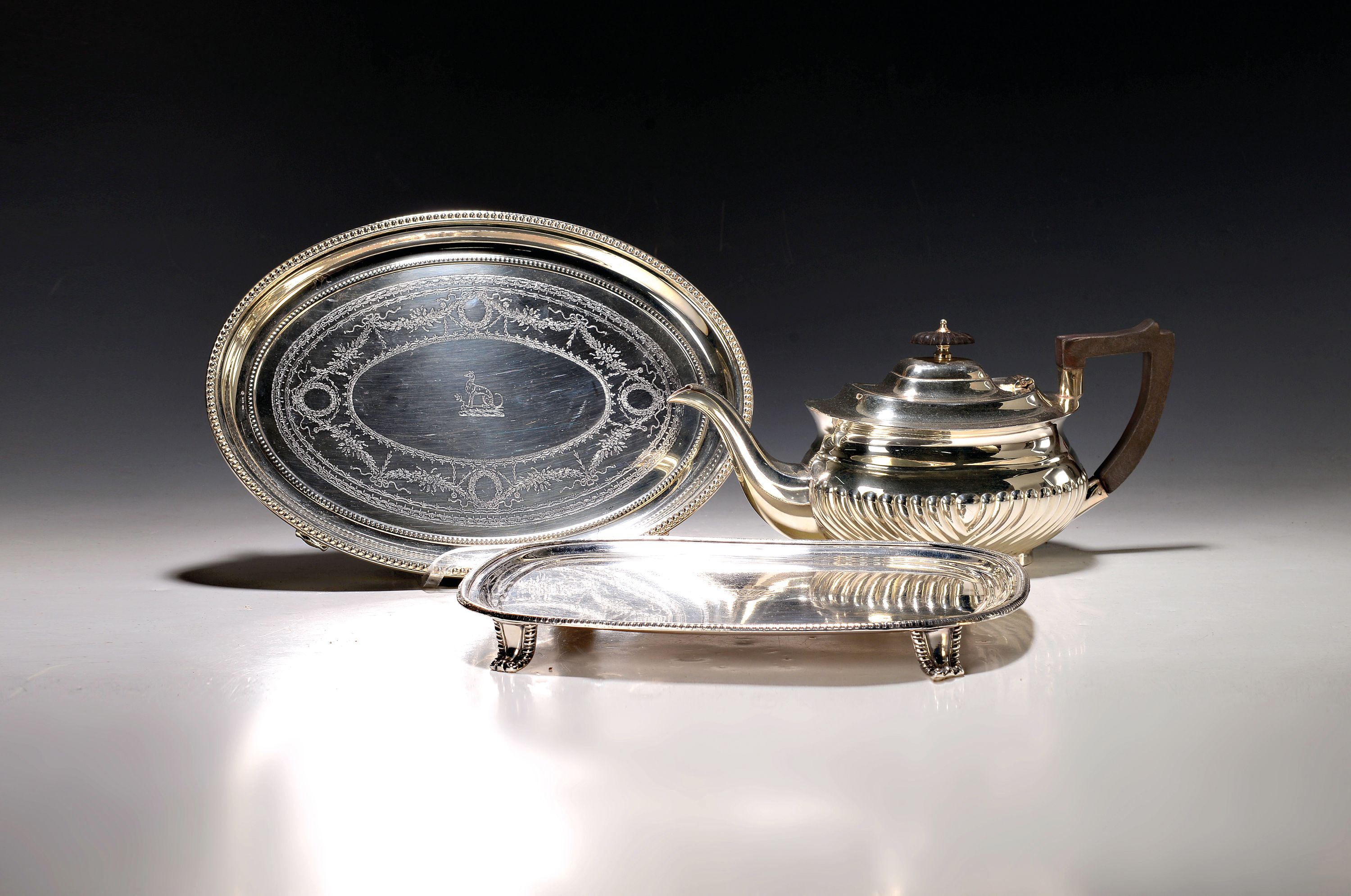 6 Teile versilbertes Tafelzubehör, 20. Jh., u.a. Teekanne Sheffield, ovales und