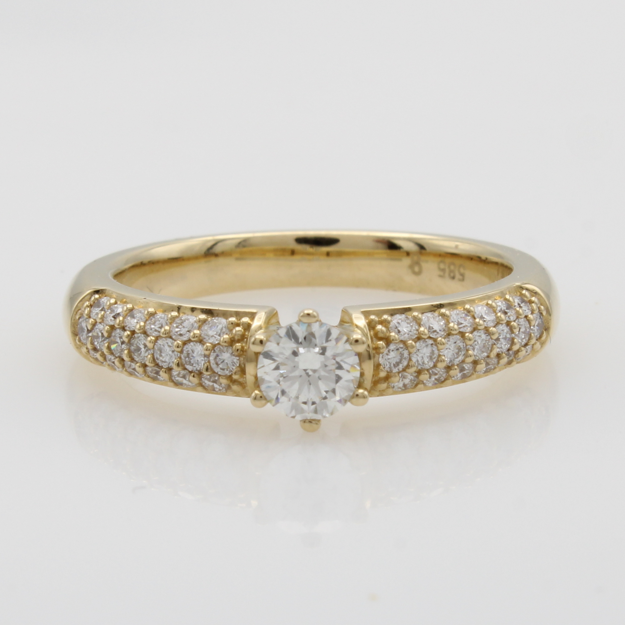 Ring mit Brillanten, GG 585/000, Solitär in Krappenfassung u. Besatzbrill. mehrrhg. in Ringschultern gef. zus. ca. 0.65 ct Weiß/si, RW ca. 56 Schätzpreis: 3230, - EUR