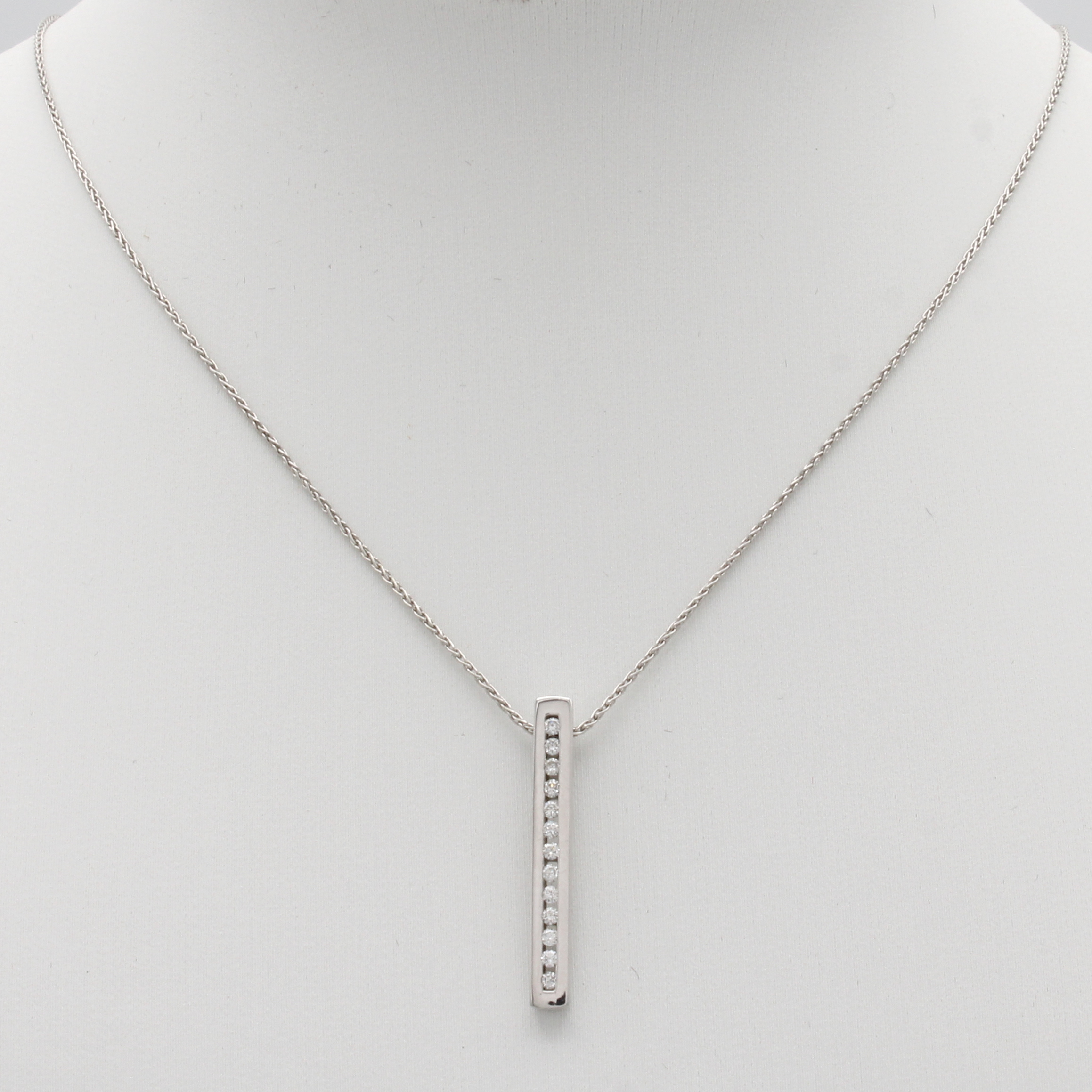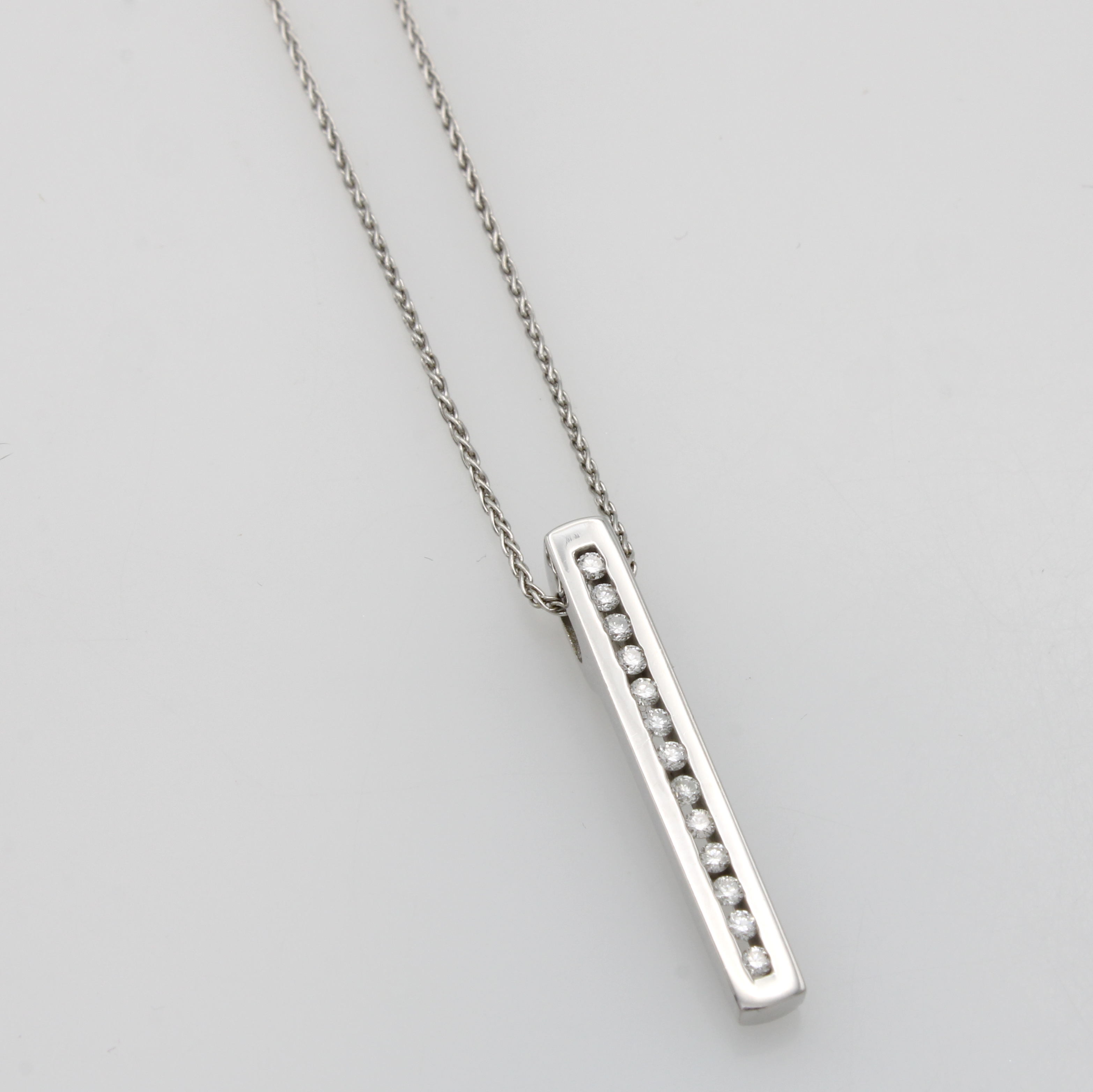 Anhänger mit Brillanten an Kette, WG 585/000, Stabform, Brill. in Kanalfassung zus. ca. 0.10 ct Weiß/si, in 42.5 u. 44.5 cm tragbar Schätzpreis: 1410, - EUR