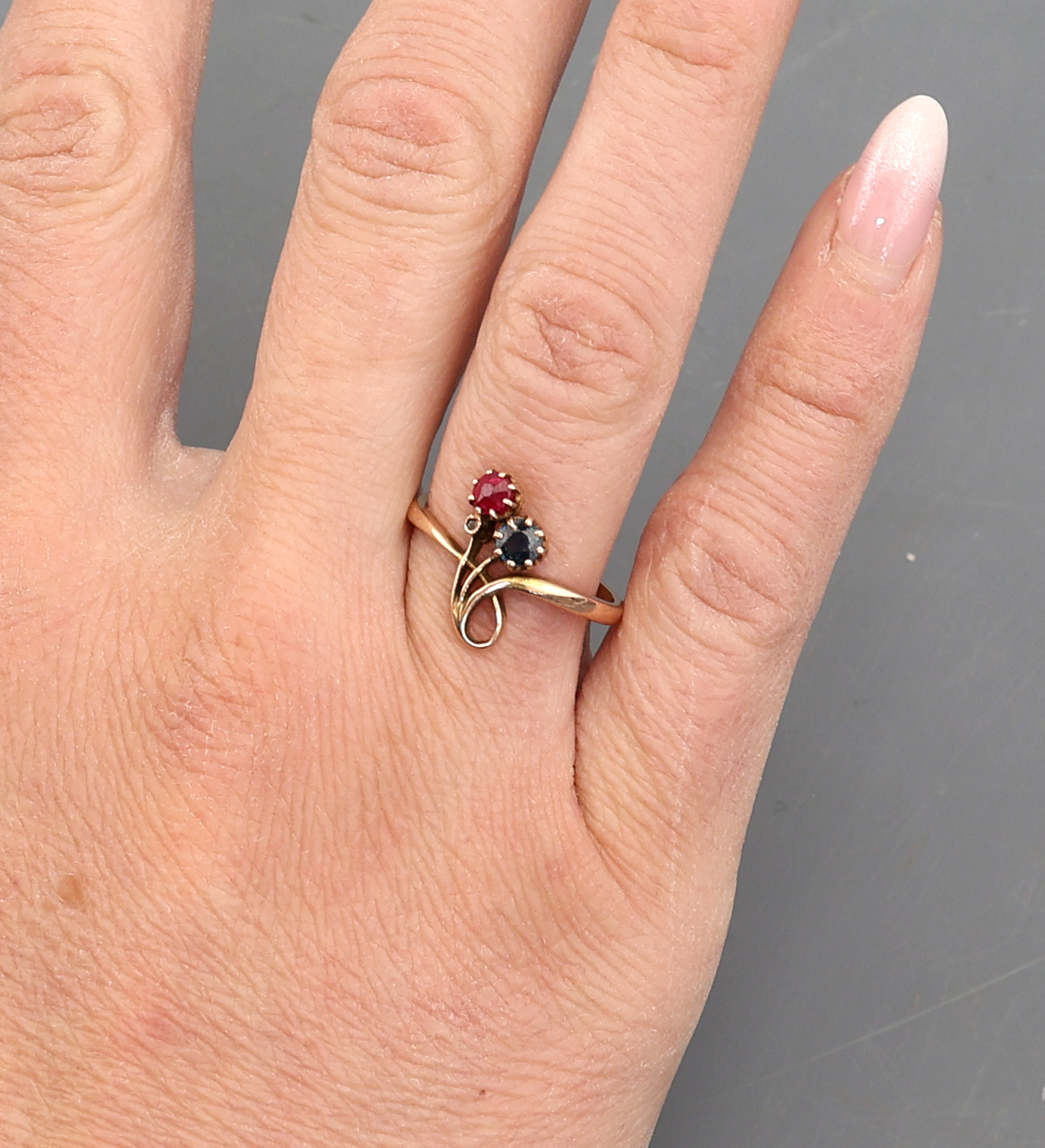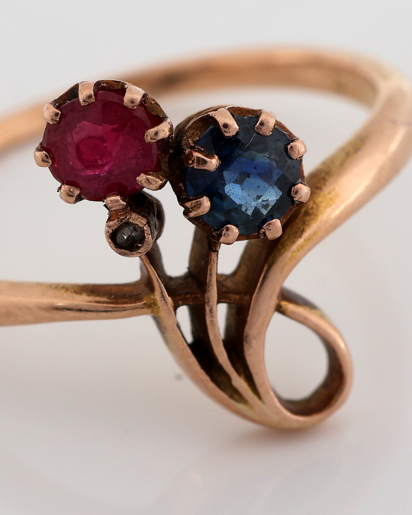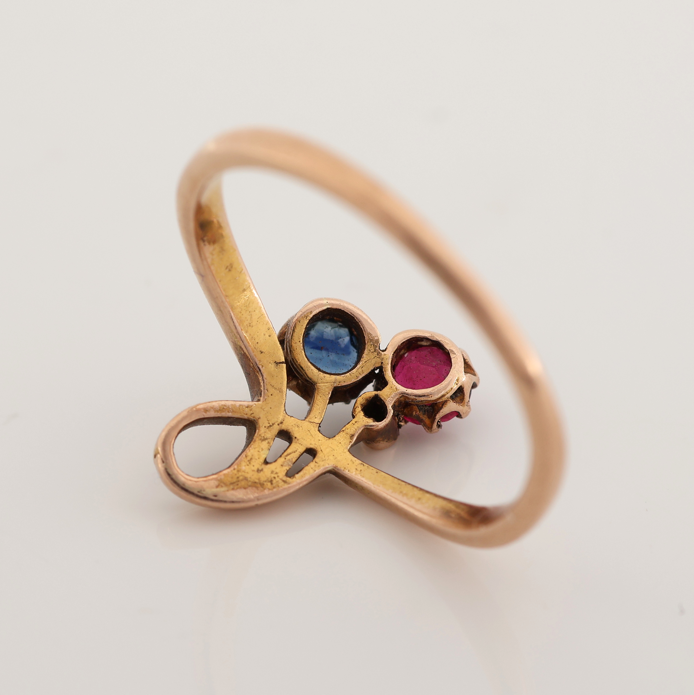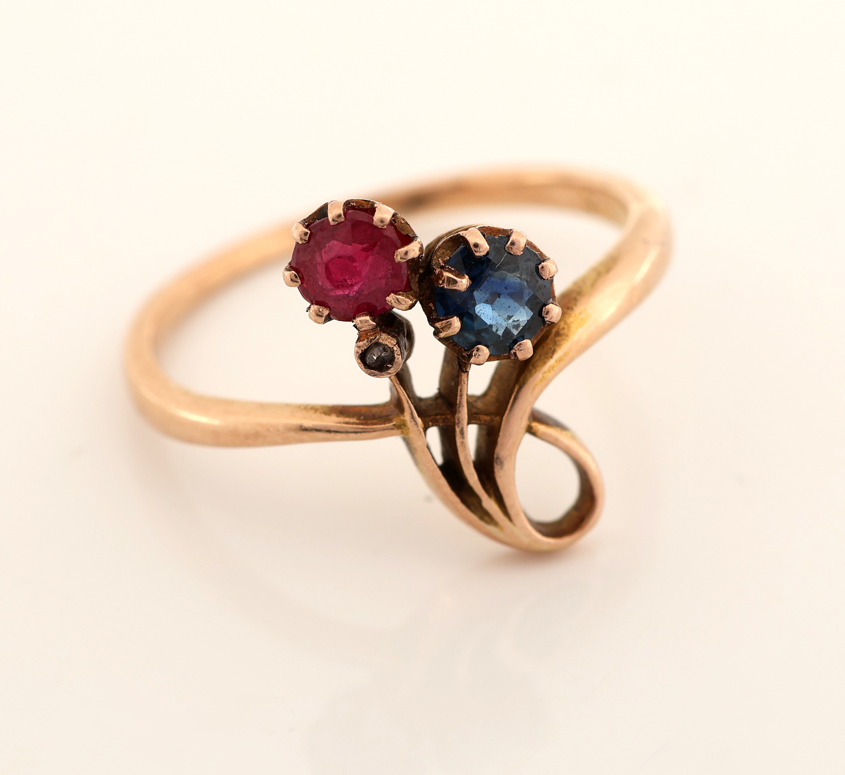 14 kt Gold Jugendstil Rubin-Saphir-Diamant -Ring, um 1900, GG 585/000, feine florale