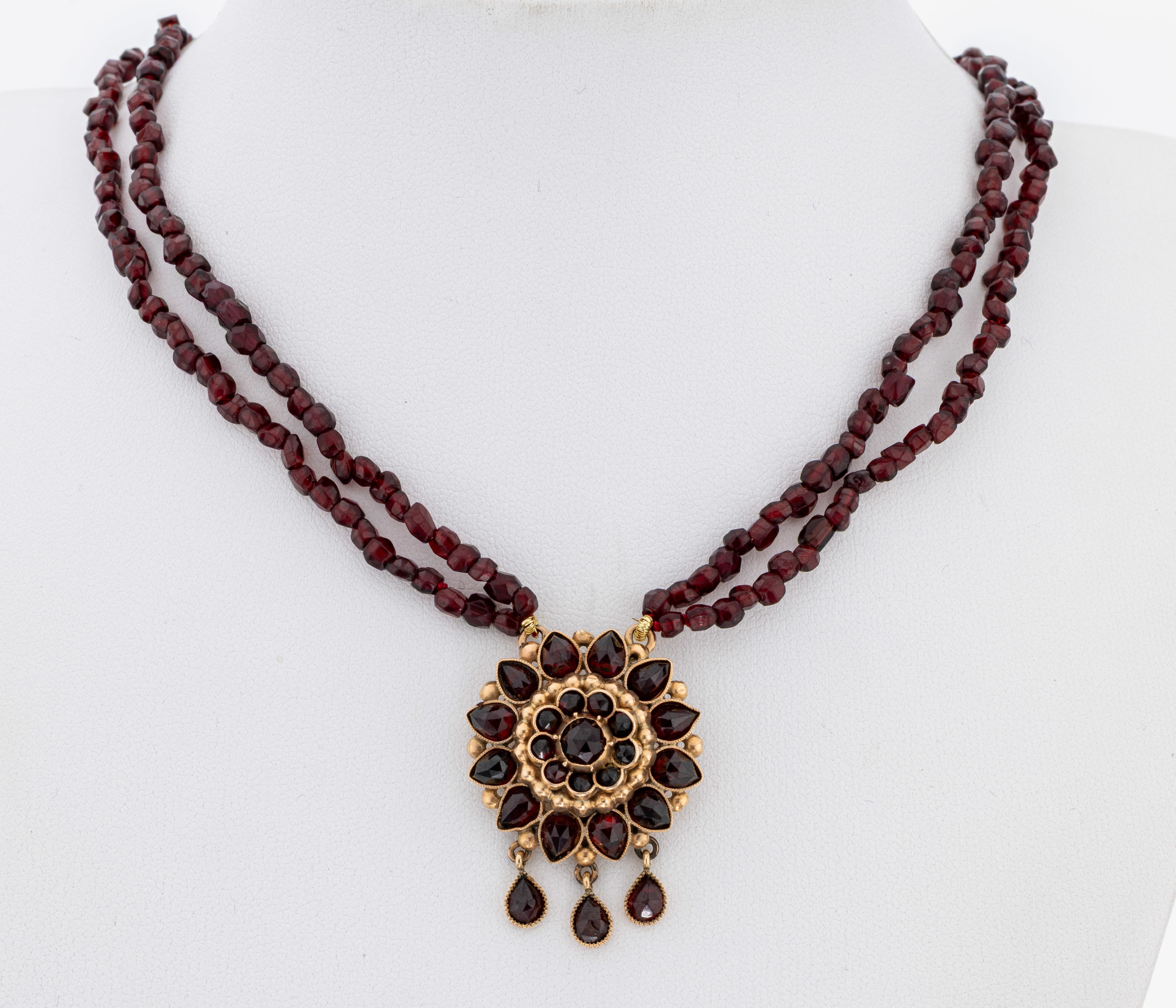 2 2- rowed chain strands made of bevelled garnets, blossom shaped middle part with