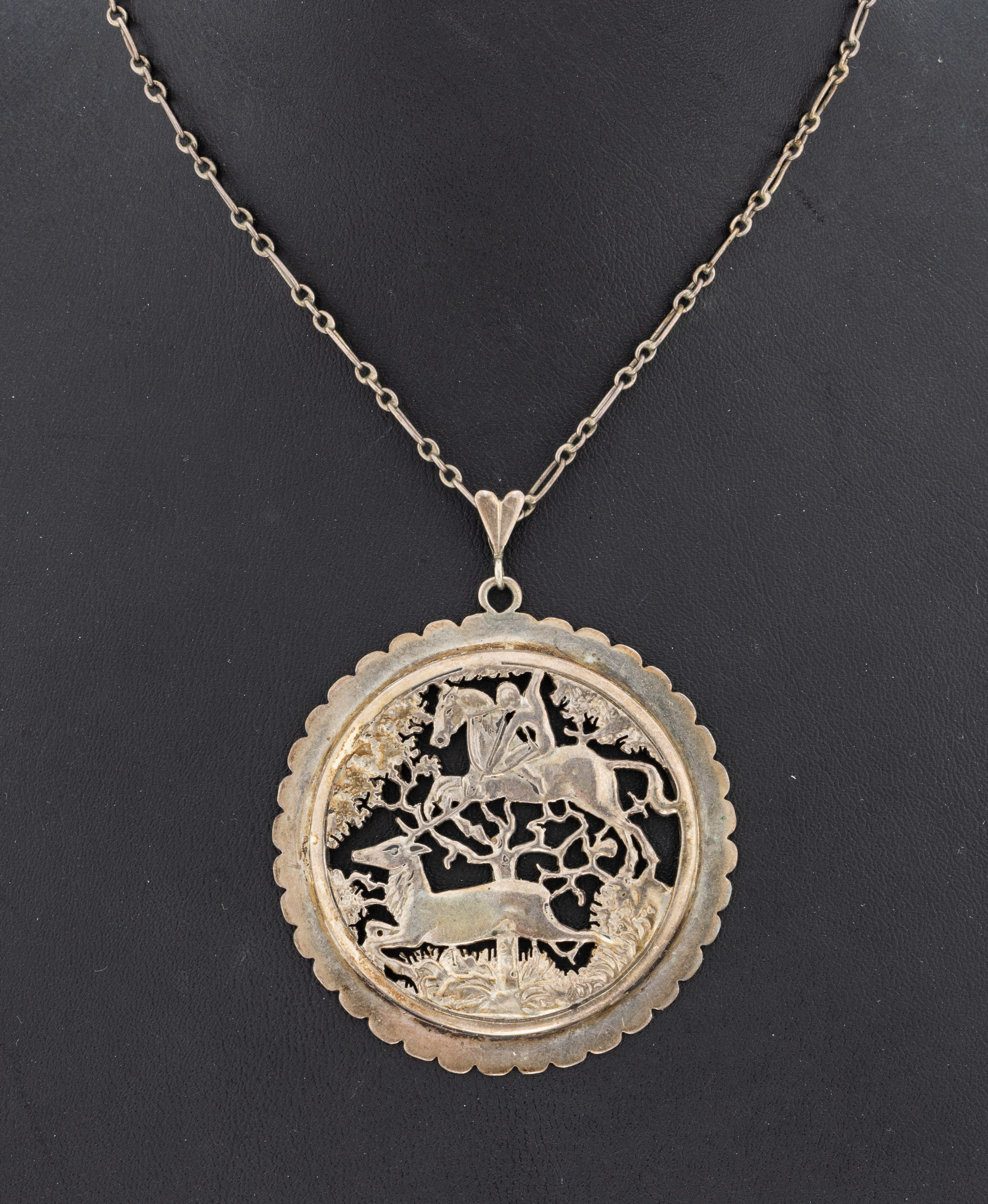 auf Pferd, Rehbock jagend, durchbrochen, an Kette, Silber, L. ca. 62 cm, Federringschließe,