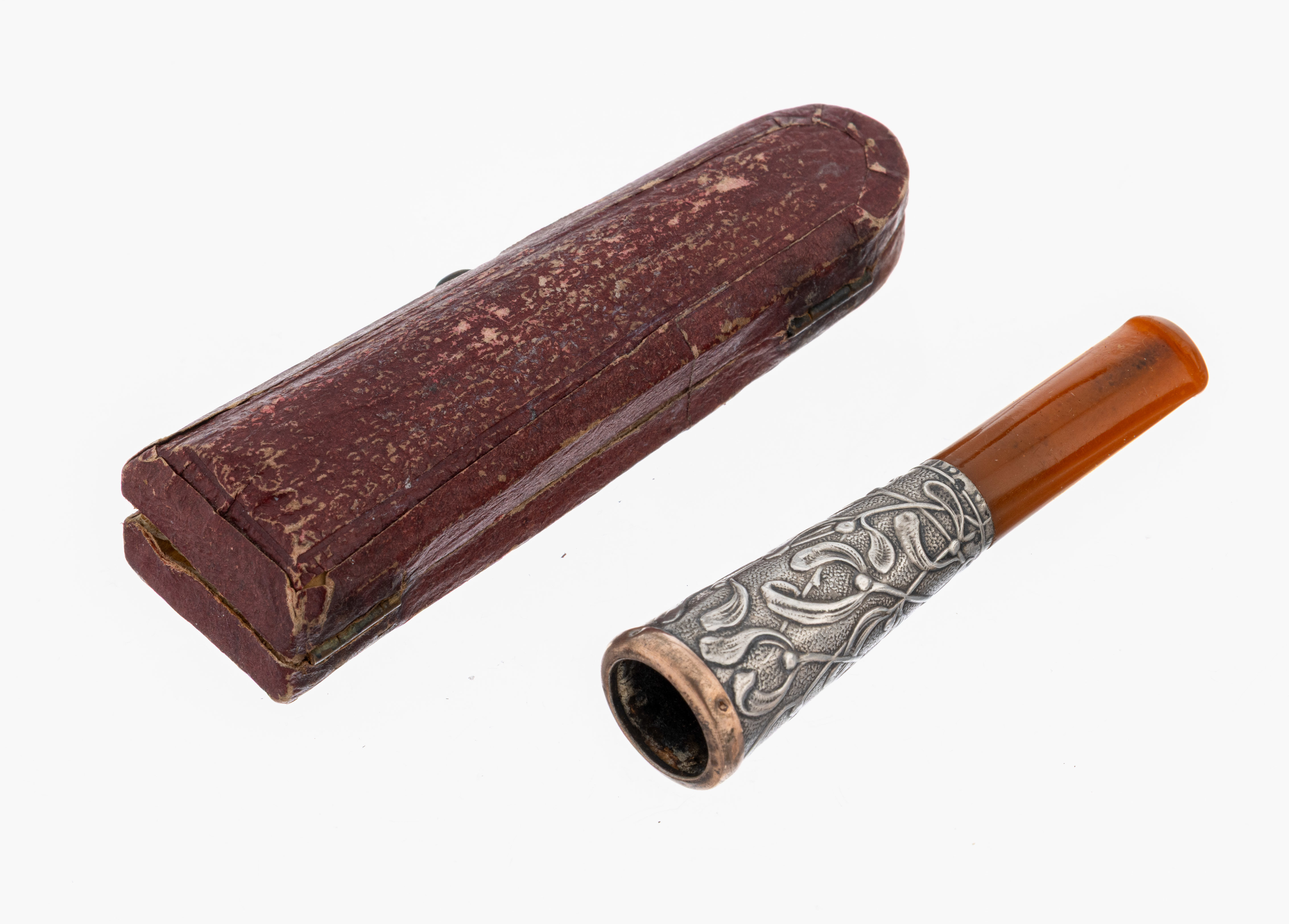 Zigarrenspitze, um 1900, reiner Jugendstil,Misteldekor, Mundstück Bernstein, MittelmonturSilber,