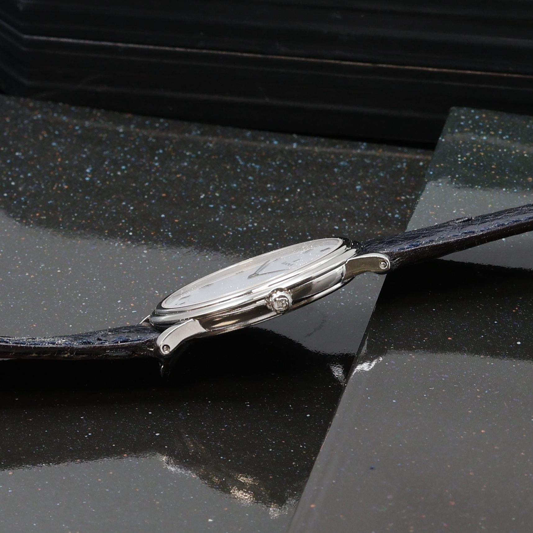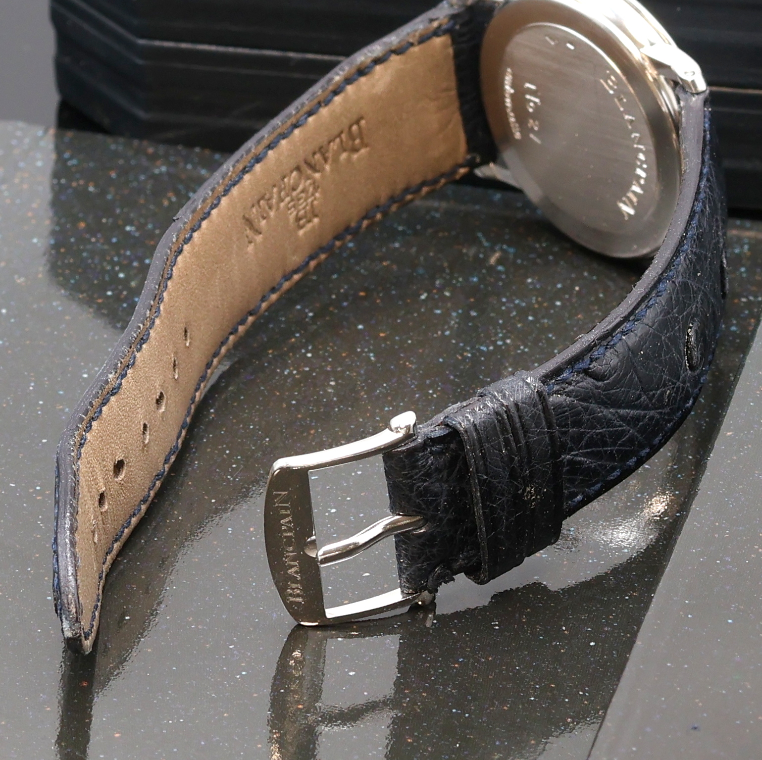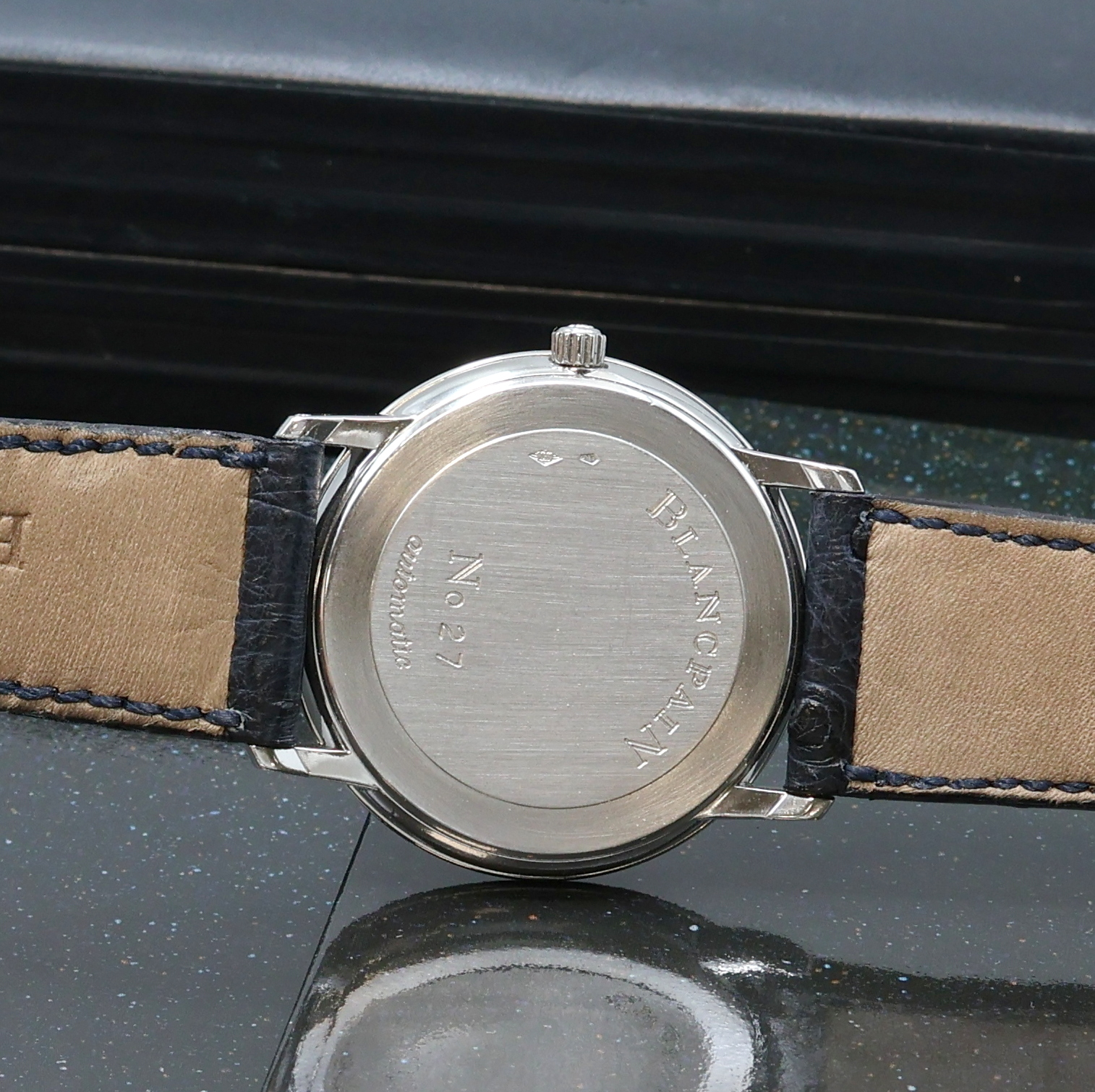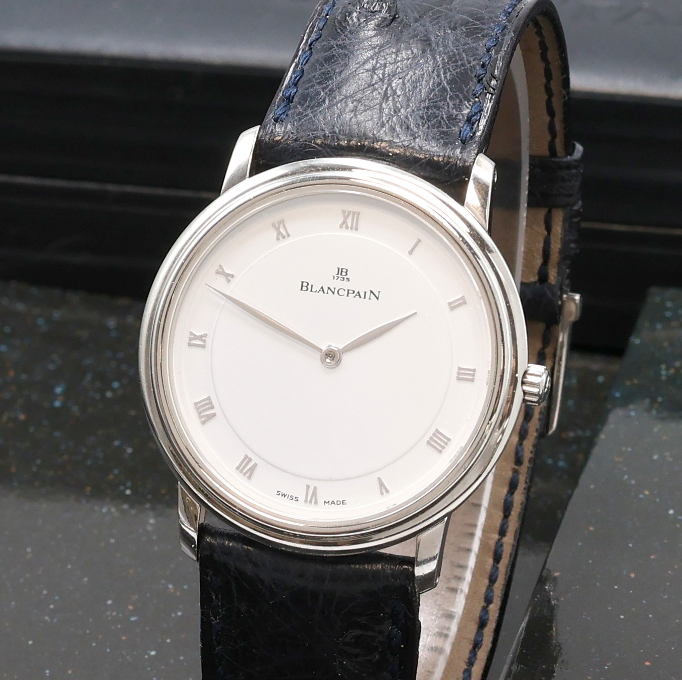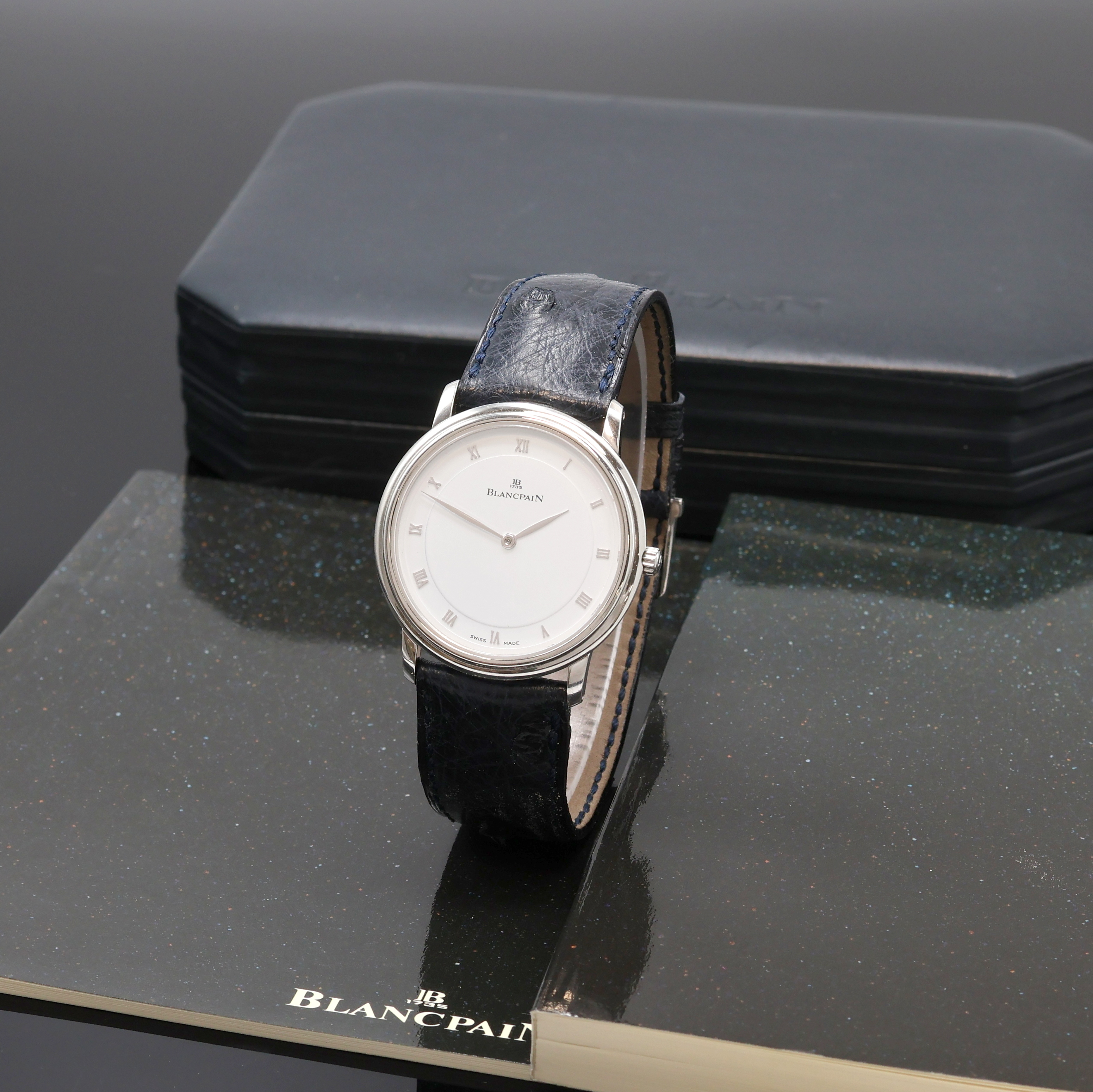 BLANCPAIN Villeret Armbanduhr in Platin Referenz 0071-3427-55, Automatik, Boden gedr. orig. Lederband m. Dornschl., weißes Zifferbl. m. röm. Zahlen, silb. Zeiger, D. ca. 33 mm, orig. Box u. Pap. anbei, EZ 2