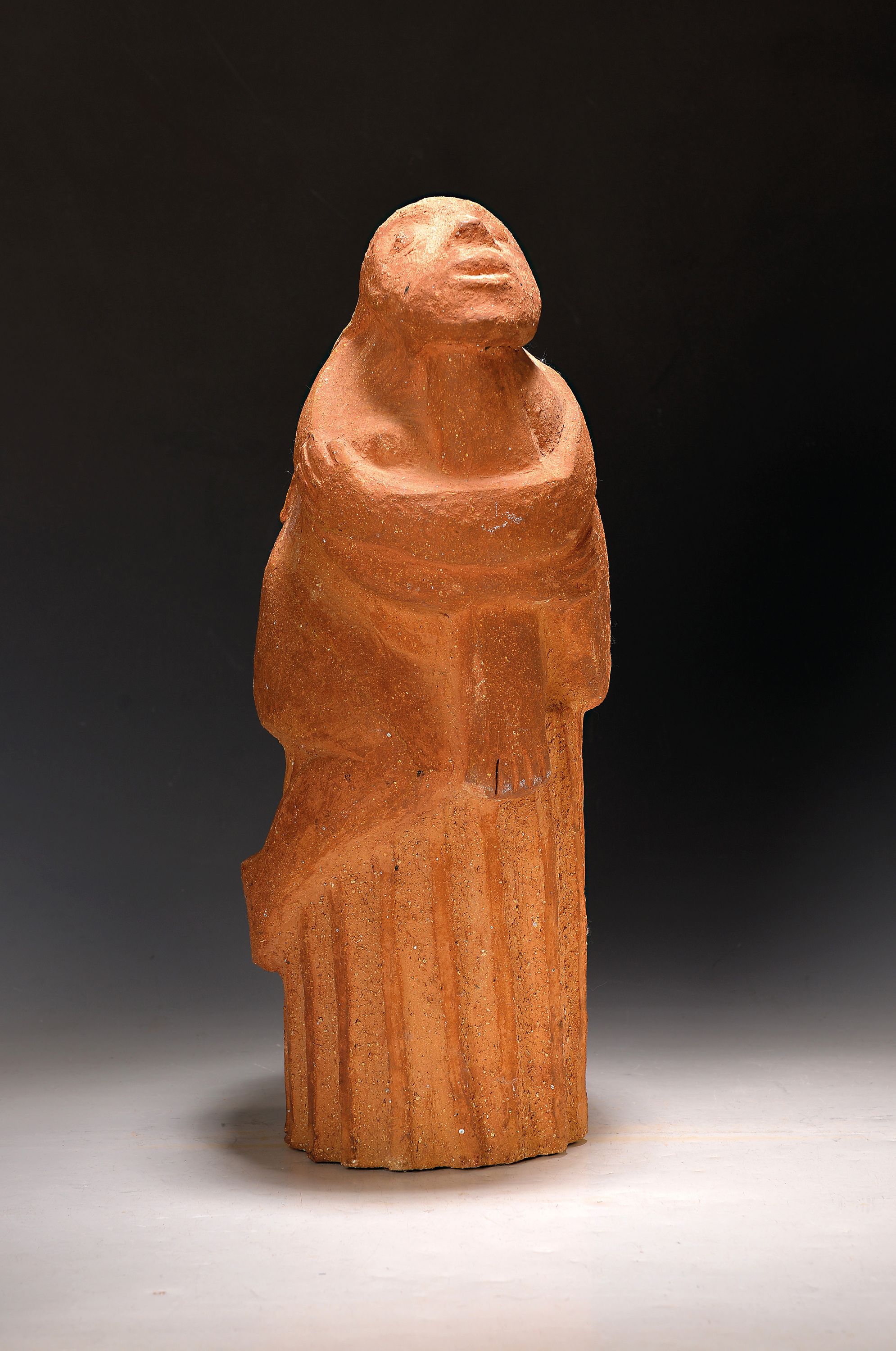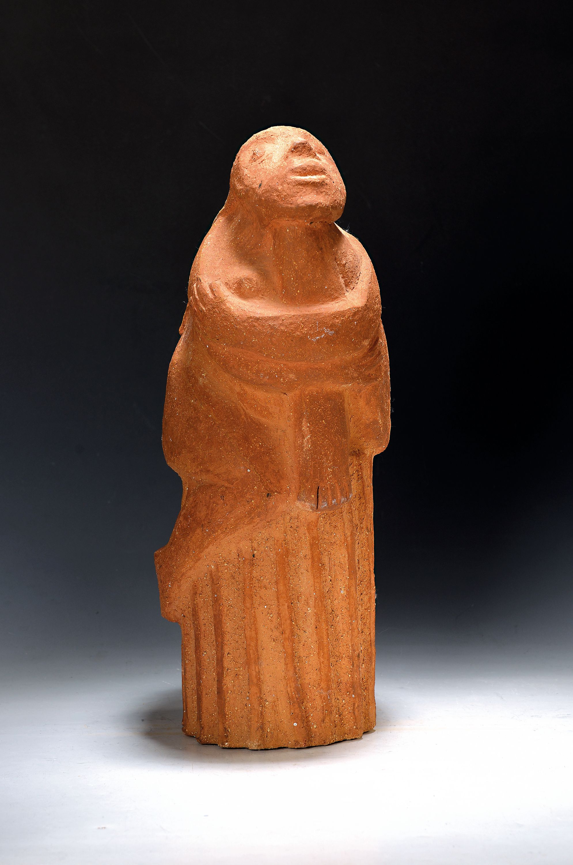 Monogrammist OH oder CH, Mitte 20. Jh., große Keramikfigur, hockende Frau auf Säulenstumpf, rotbrauner Scherben, H. ca 53 cm