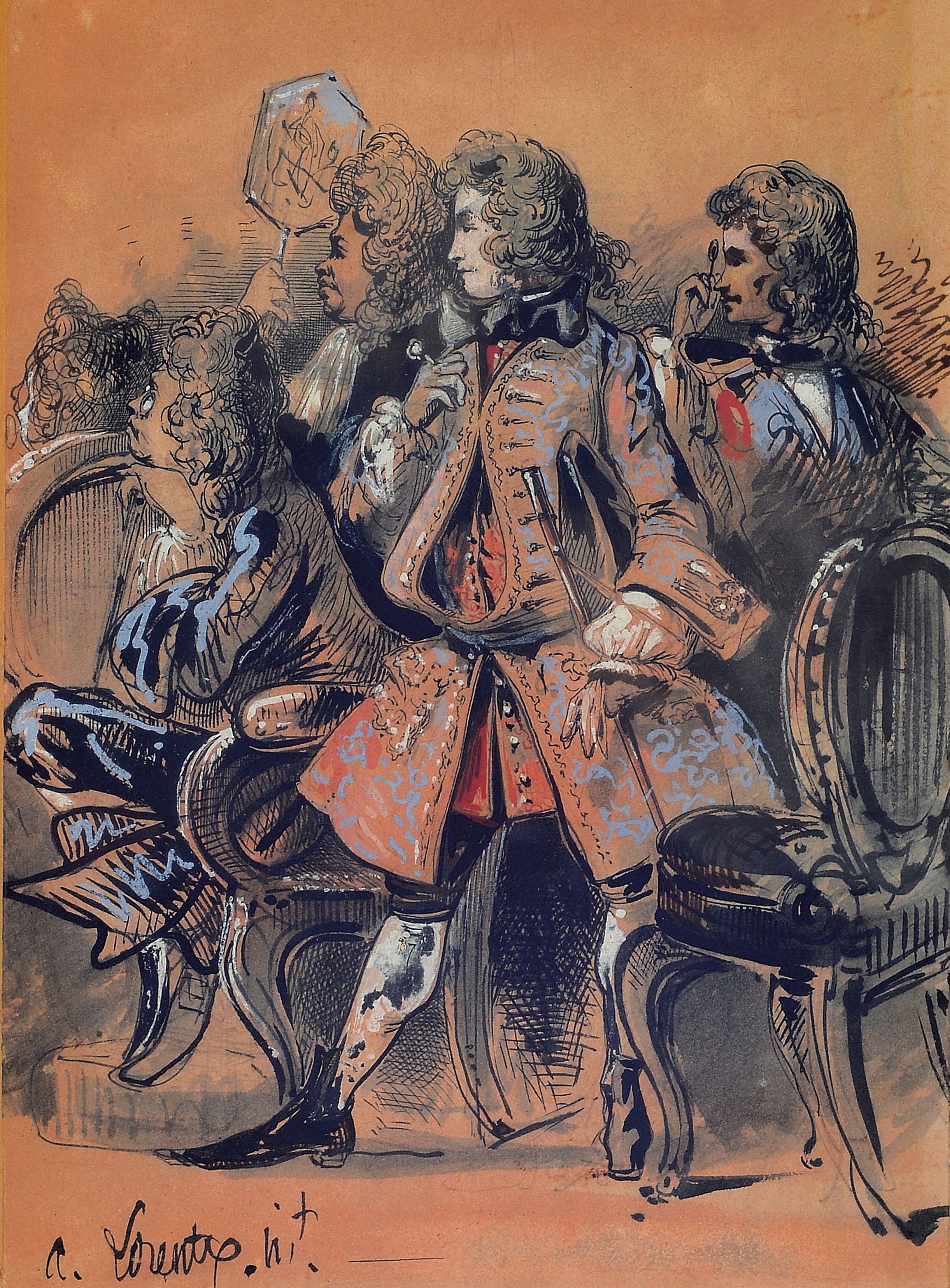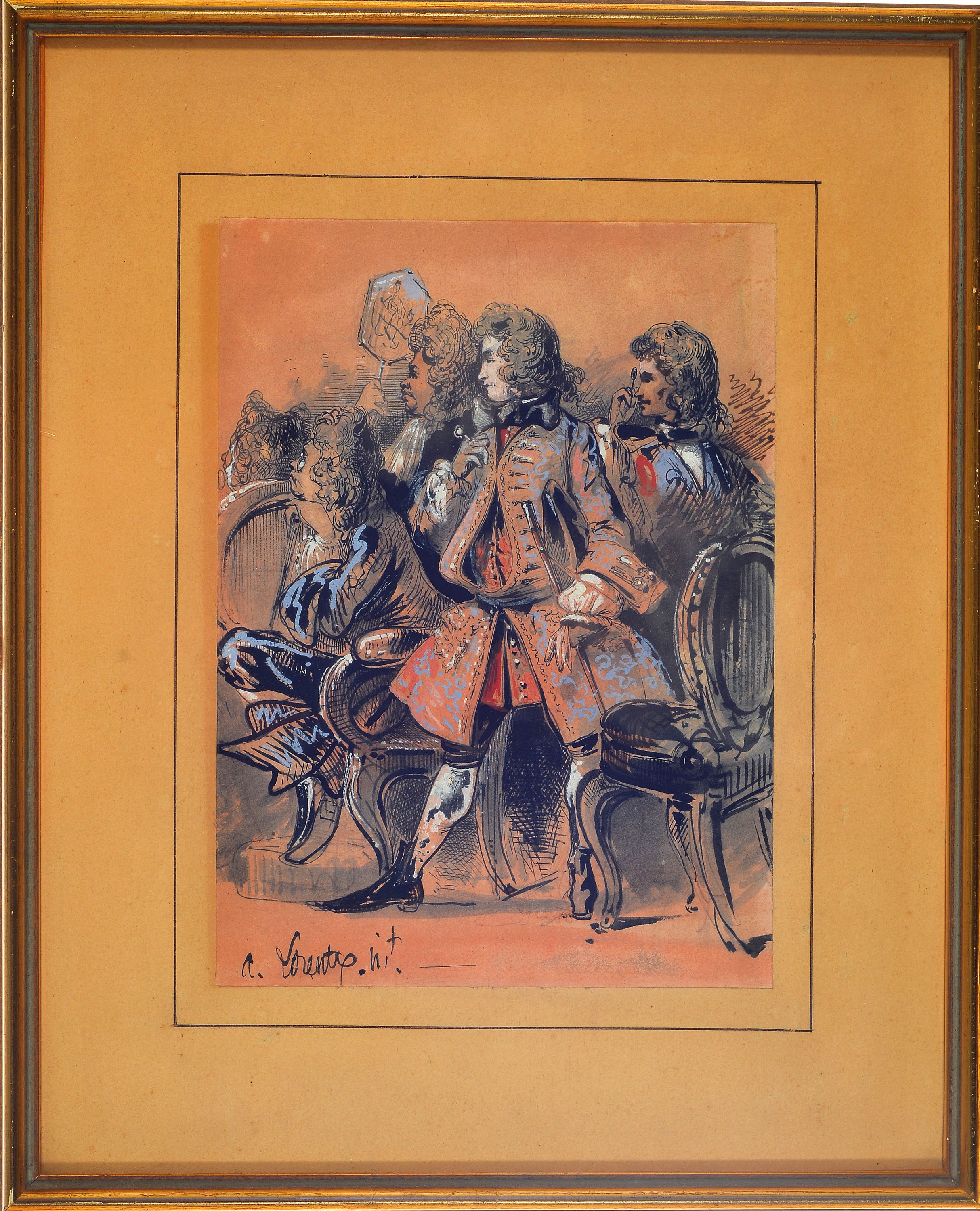 figürliche Darstellung mit französischen Edelmännern wohl in einem Theater, signiert