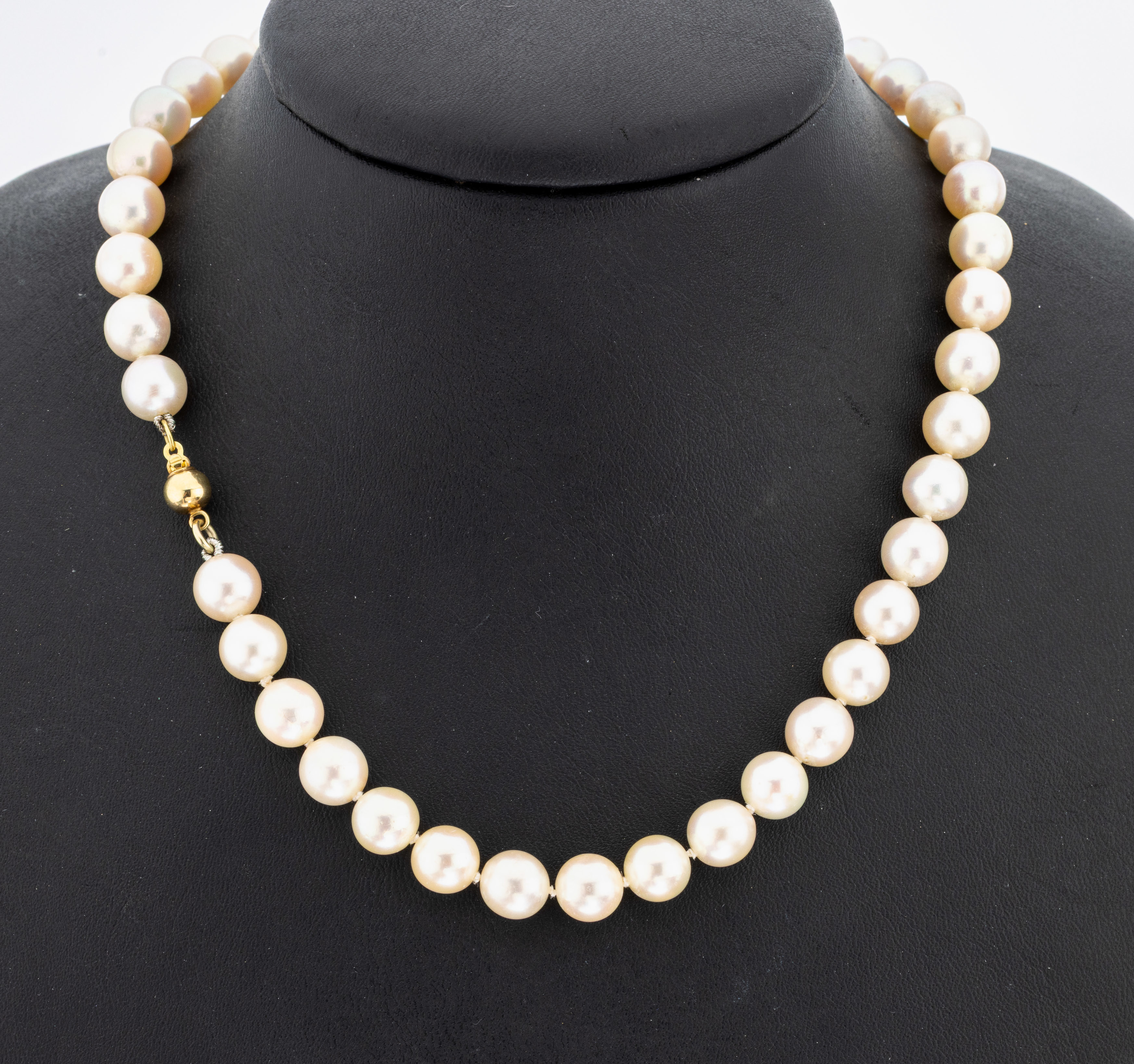 Akoyazuchtperlenkette, GG 585/000 Kugel- schließe, l.cremefarbene Perlen, D. ca.