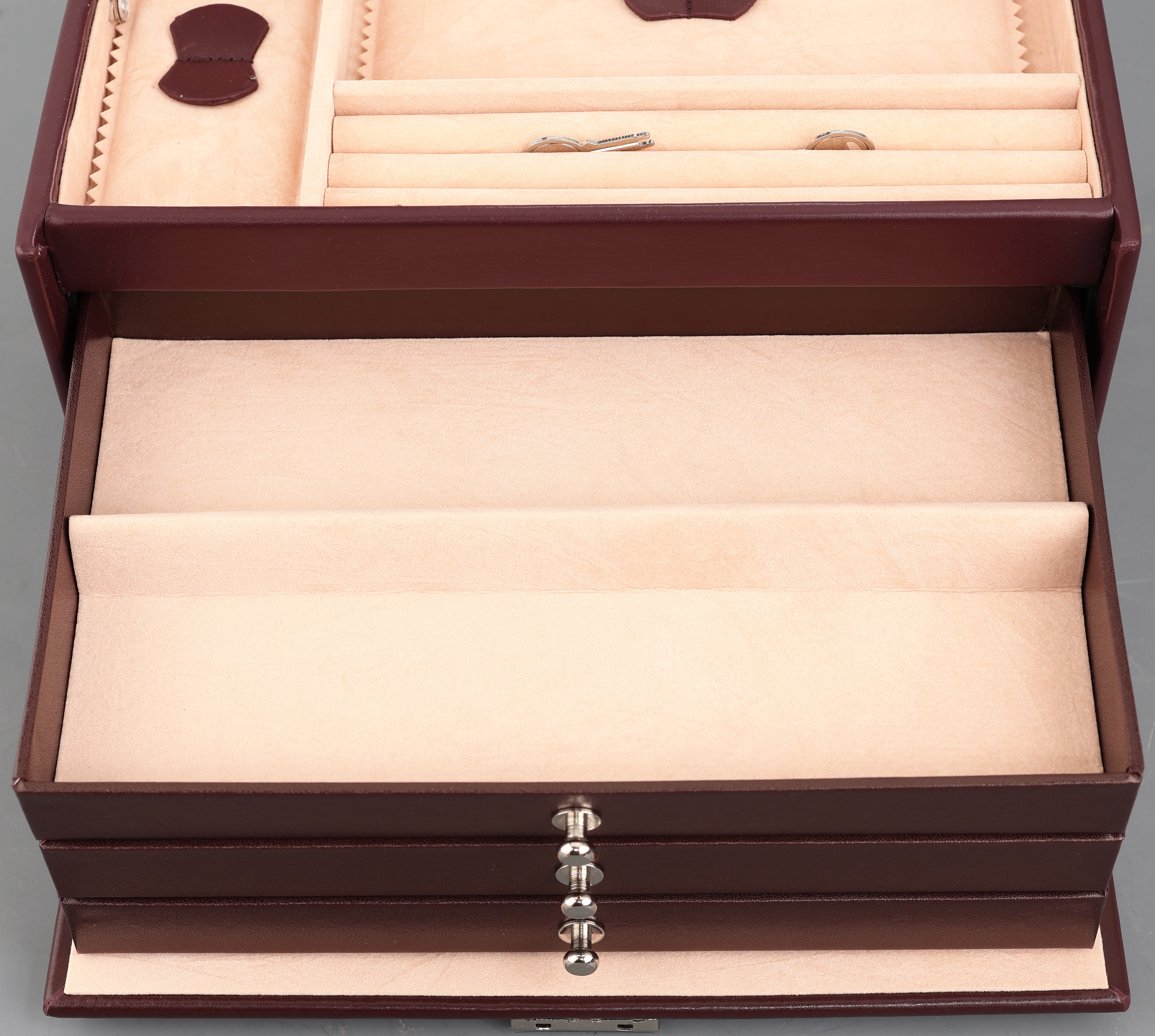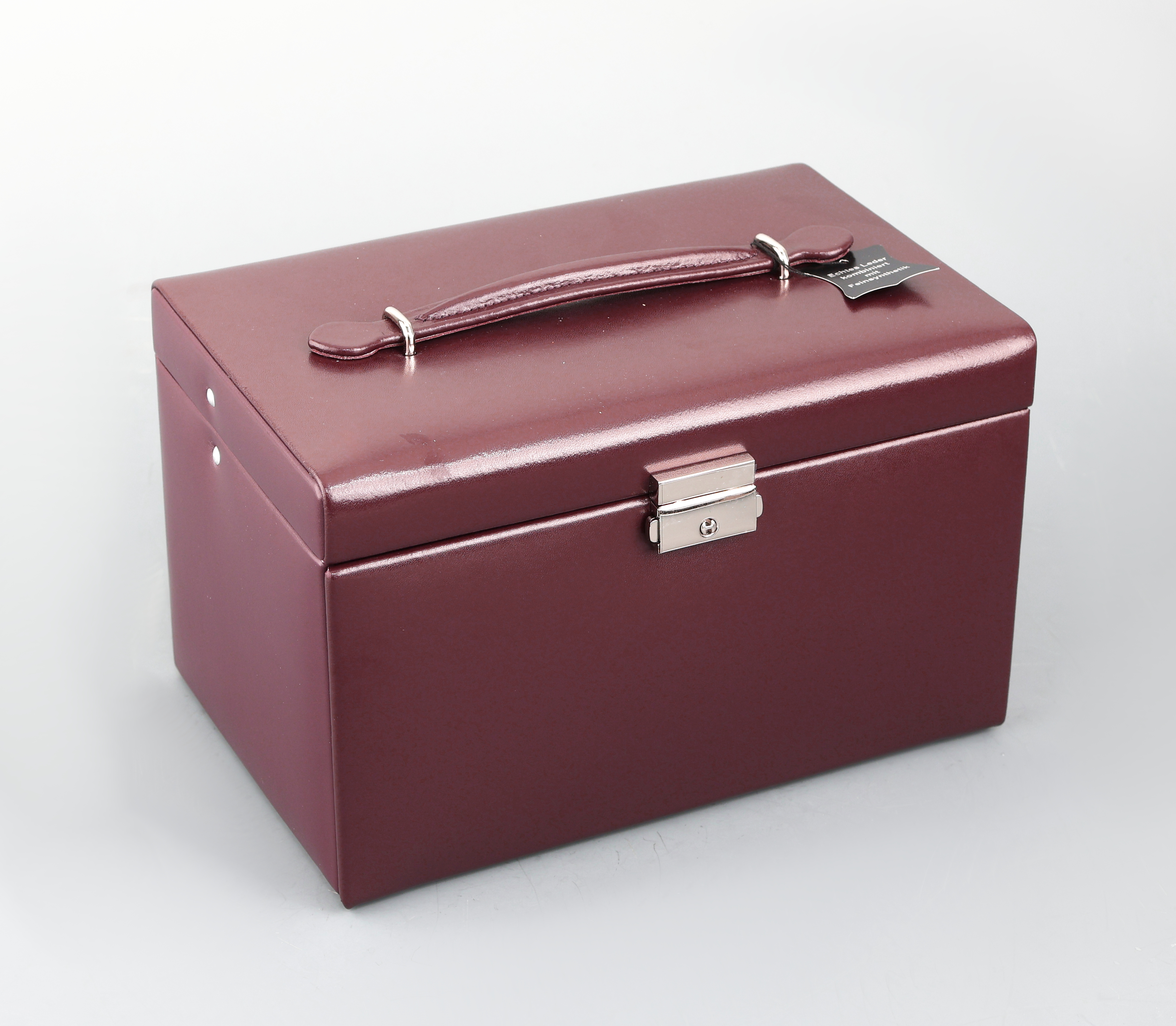 Schmuckkoffer aus weinrotem Glattleder, Innenausstattung aus altrosafarbenen Feinsynthetik,
